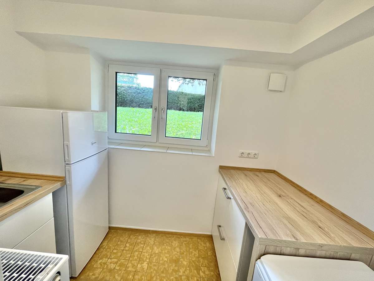 ? **Eigene Küche mit Fenster** – inkl. **Elektroherd**, Spüle, **Kühl-Gefrierkombination** und
