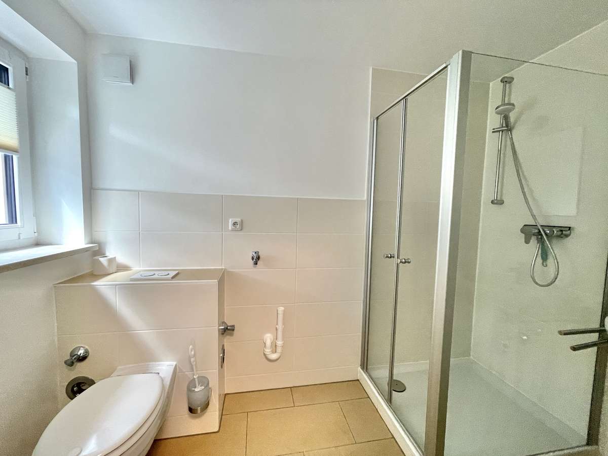 (2018 renoviert) – beige Fliesen, neuwertige **Echtglas-Duschkabine**, Waschbecken mit Spiegel und WC