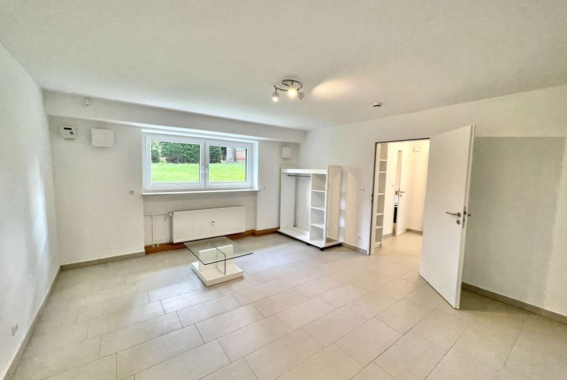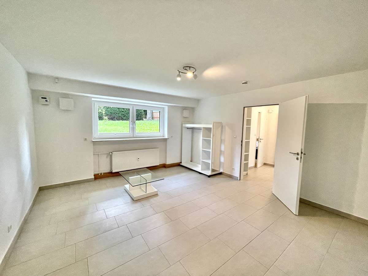 /Schlafzimmer** mit Blick ins Grüne – Platz für Wohn- und Schlafbereich ? **Modernes Bad mit Fenster**