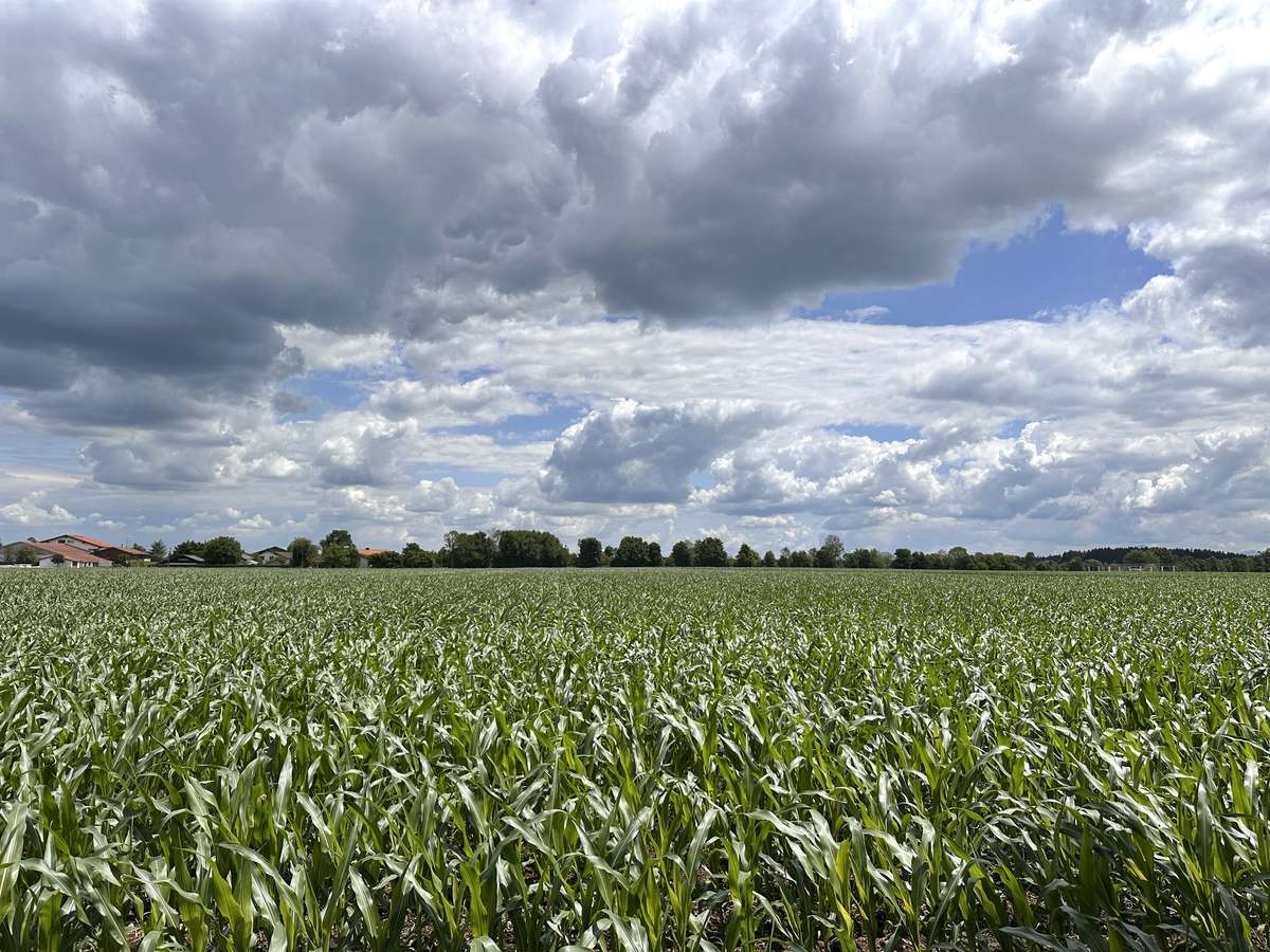 * Feldrandlage mit freiem Blick auf Wiesen und Felder