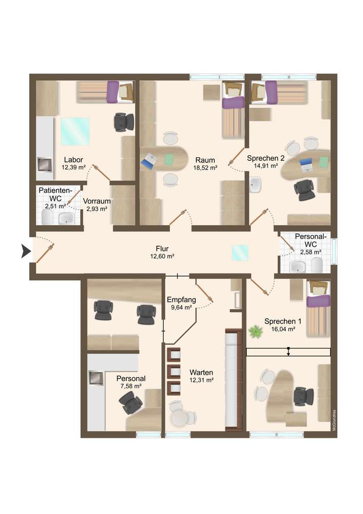 Ein separates Wartezimmer, ein Patienten-WC sowie ein Personal-WC runden die Ausstattung ab.