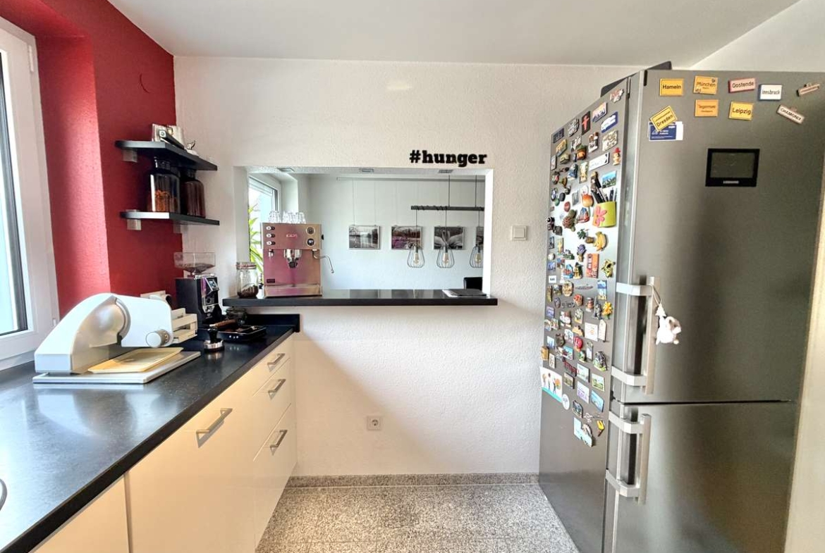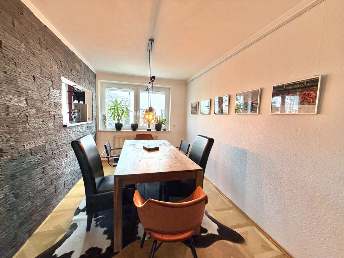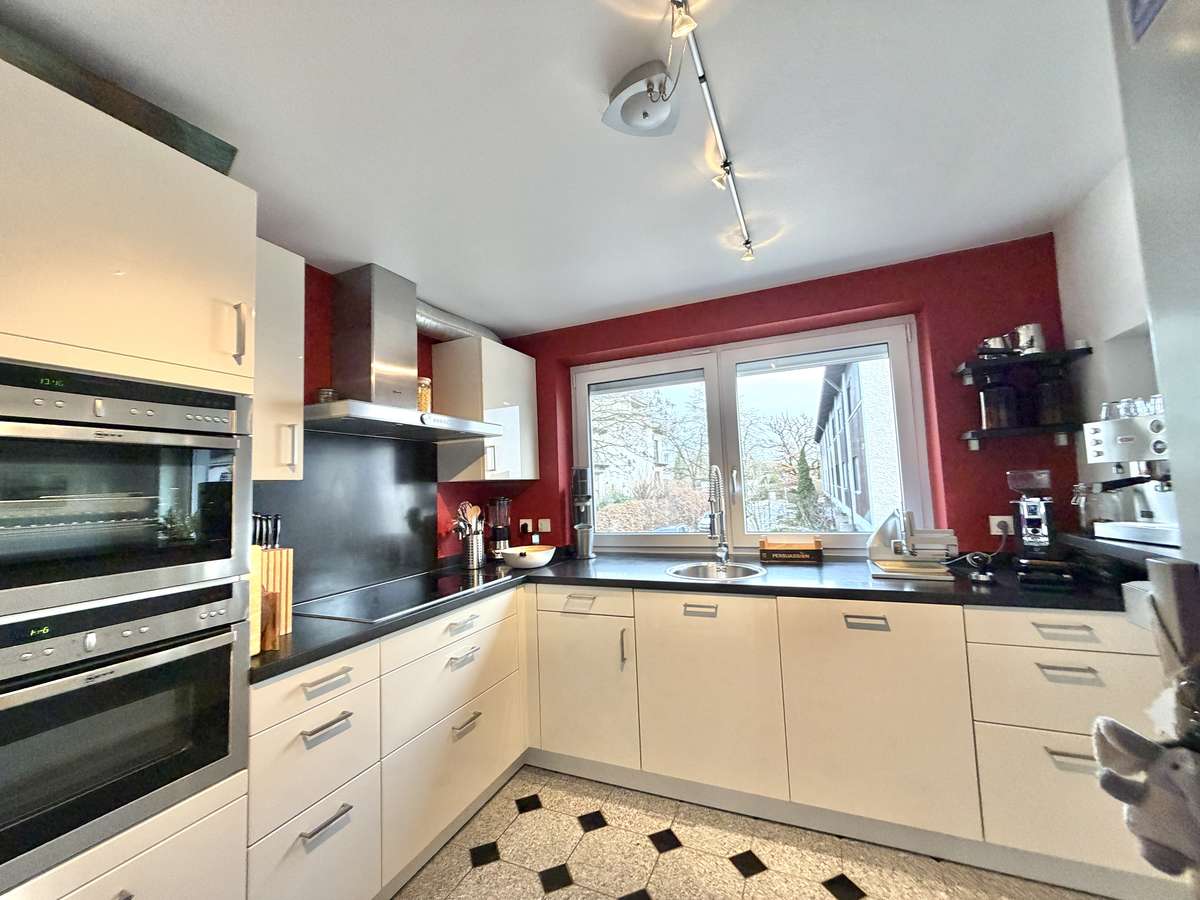 Über eine weitere Treppe erreichen Sie den separaten Essbereich sowie die Küche. Die moderne weiße Hochglanz-Einbauküche (Bj. 2009) ist hochwertig ausgestattet mit Induktionskochfeld, Dampfgarer, Backofen mit integrierter Mikrowelle, Durchreiche und elektrischer Fußbodenheizung.