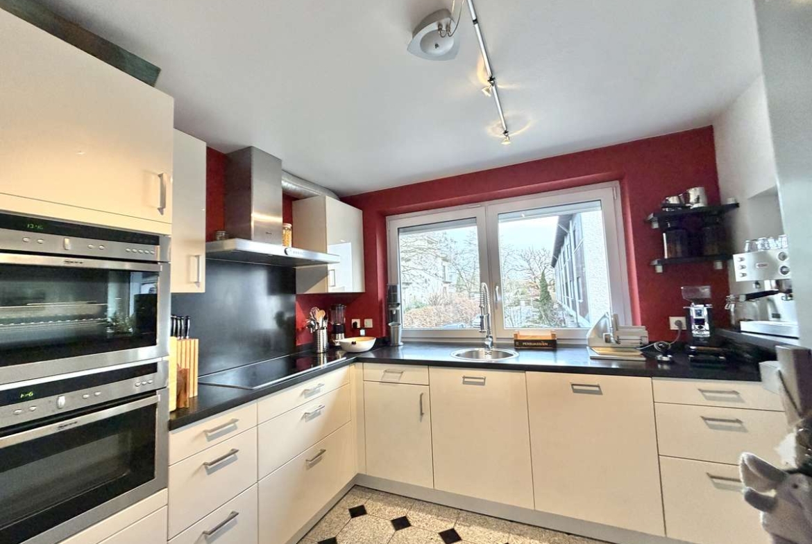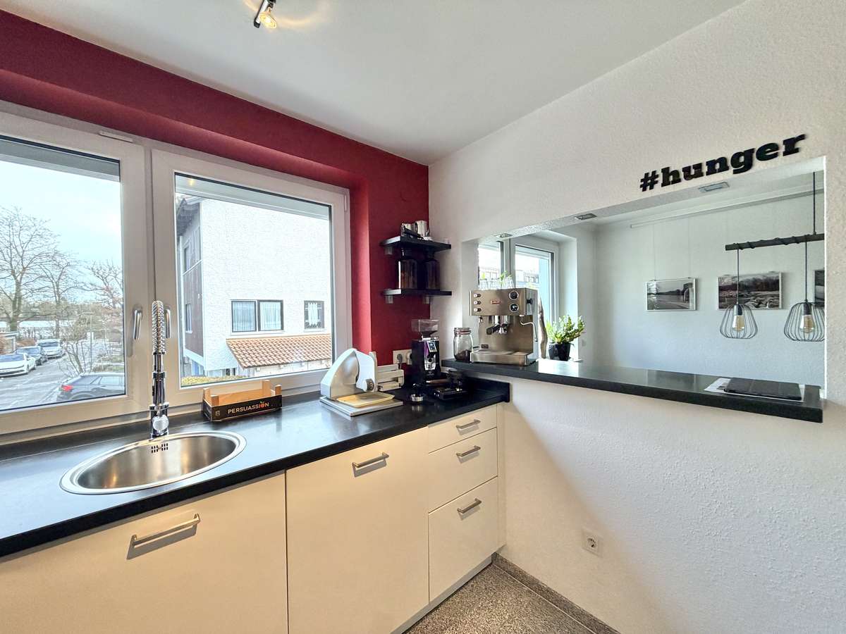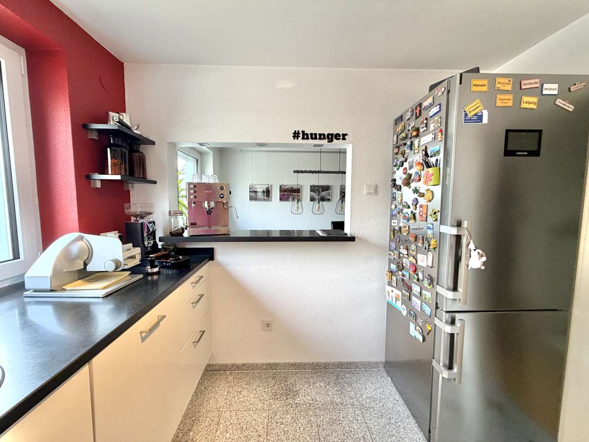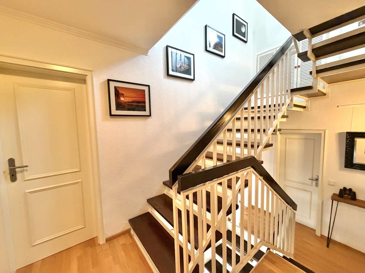 Über eine weitere Treppe erreichen Sie den separaten Essbereich sowie die Küche. Die moderne weiße Hochglanz-Einbauküche (Bj. 2009) ist hochwertig ausgestattet mit Induktionskochfeld, Dampfgarer, Backofen mit integrierter Mikrowelle, Durchreiche und elektrischer Fußbodenheizung.