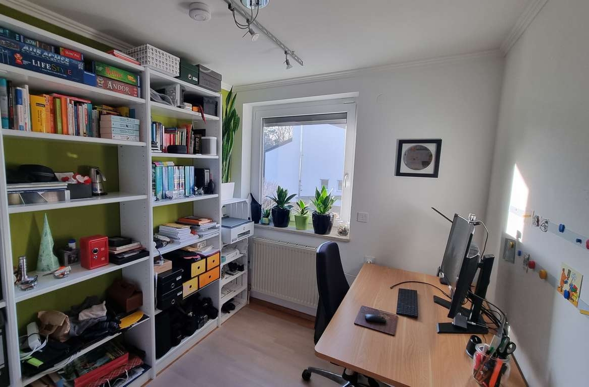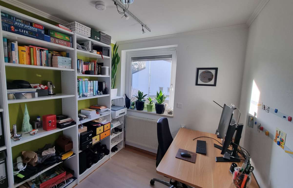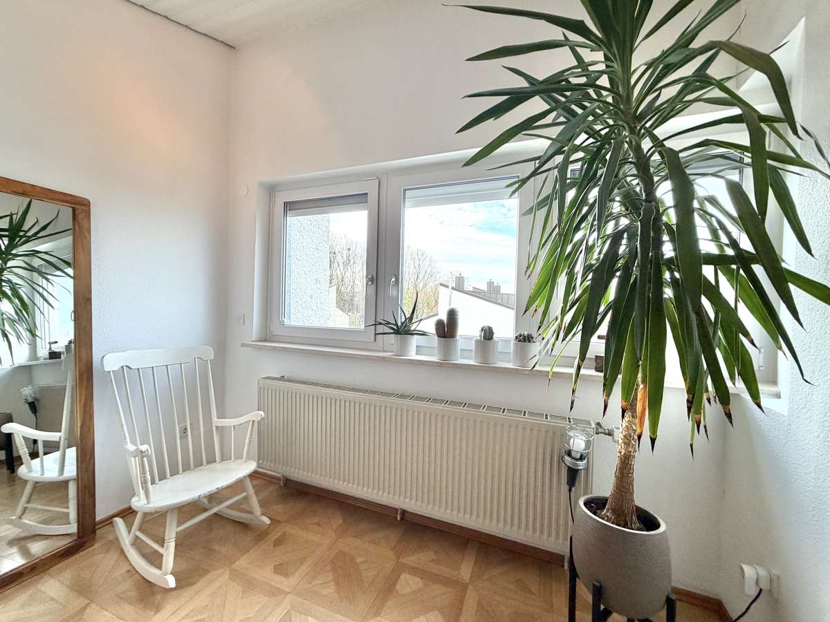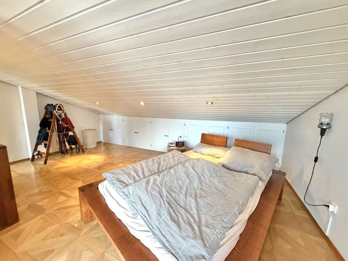 Das ausgebaute Dachstudio bietet zusätzlichen, flexibel nutzbaren Wohnraum, z.B. als Arbeitszimmer, mit Parkettboden, Einbauschränken und integrierten Lichtspots. Zudem besteht die Möglichkeit, den Dachspeicher zu einem vollwertigen Geschoss mit zwei weiteren Zimmern auszubauen.