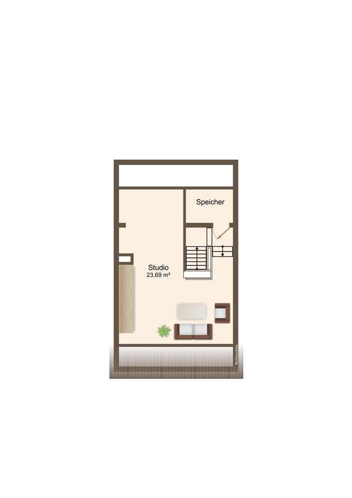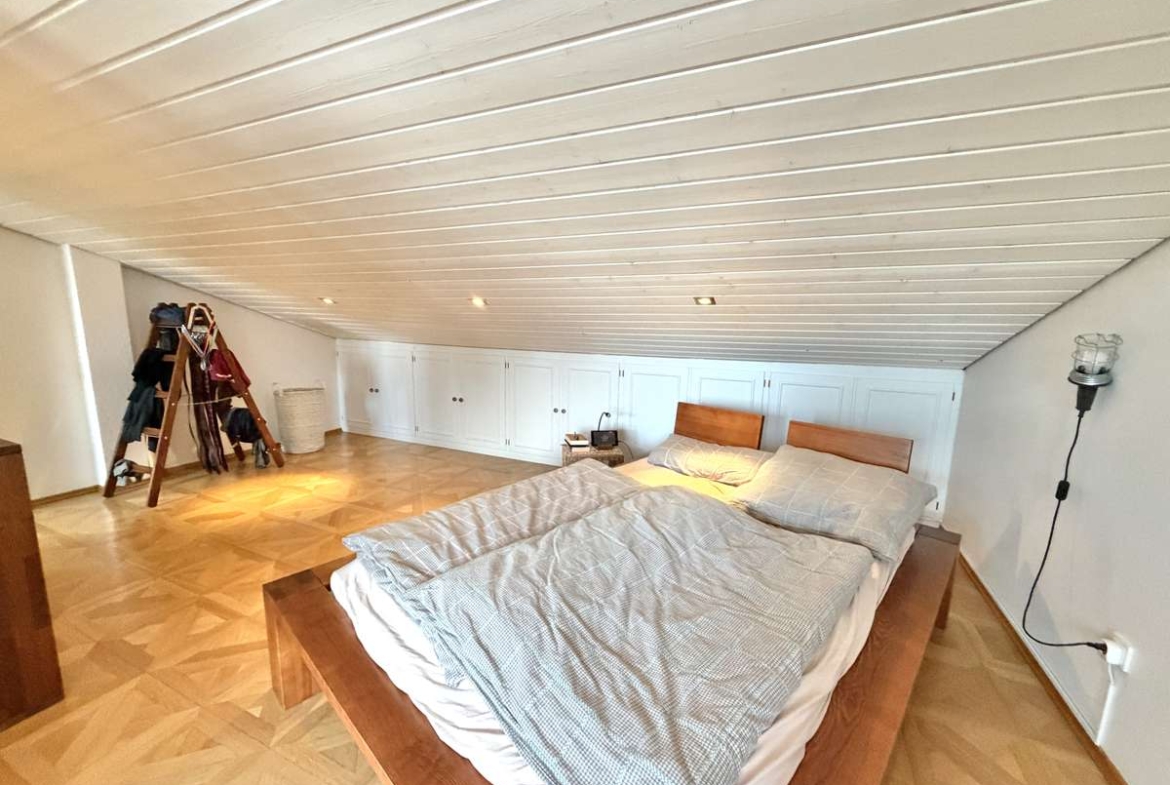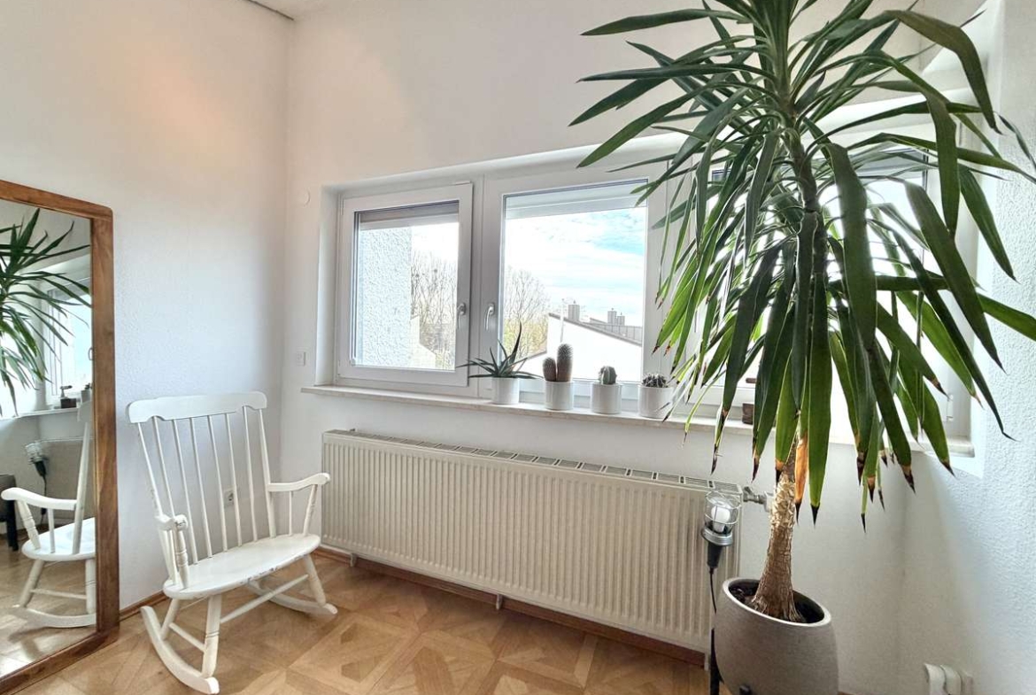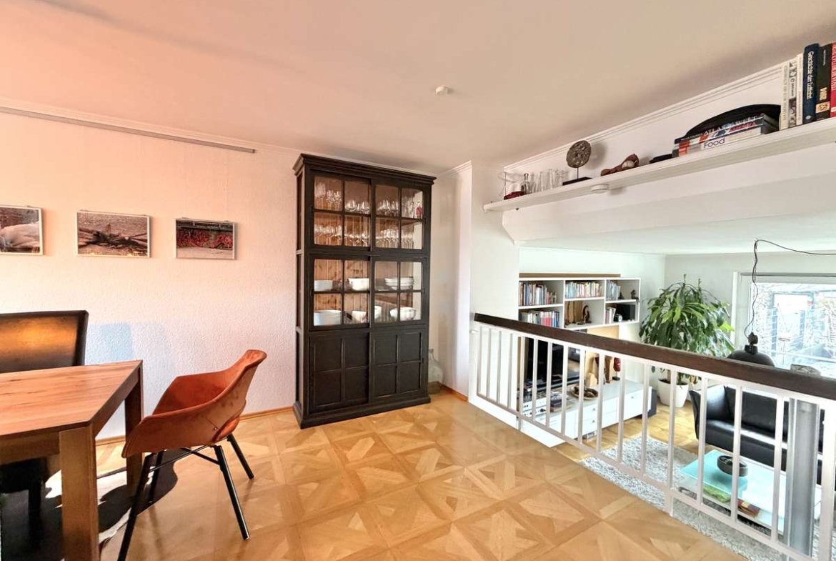 Das ausgebaute Dachstudio bietet zusätzlichen, flexibel nutzbaren Wohnraum, z.B. als Arbeitszimmer, mit Parkettboden, Einbauschränken und integrierten Lichtspots. Zudem besteht die Möglichkeit, den Dachspeicher zu einem vollwertigen Geschoss mit zwei weiteren Zimmern auszubauen.
