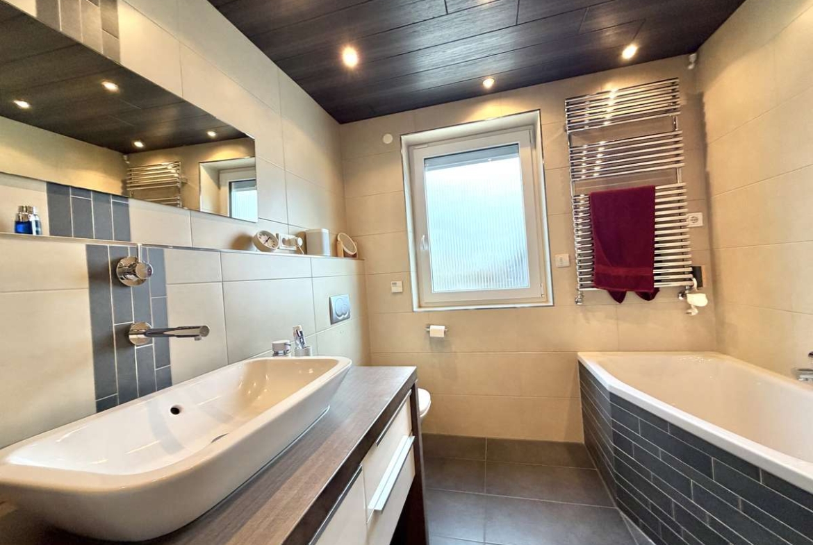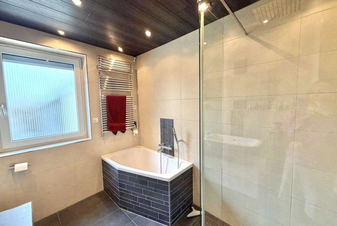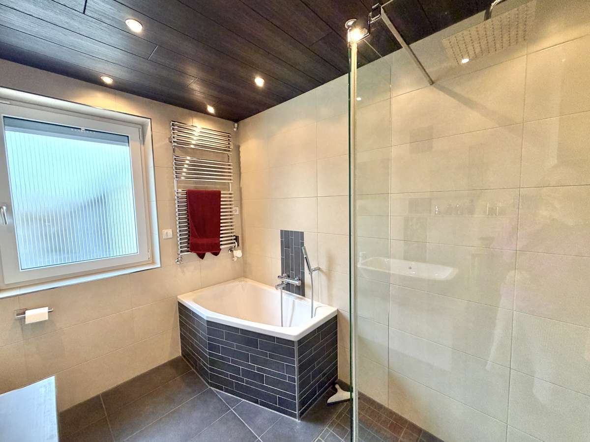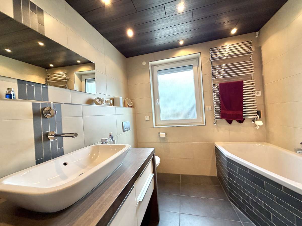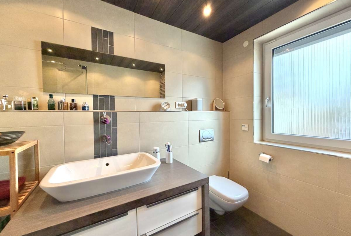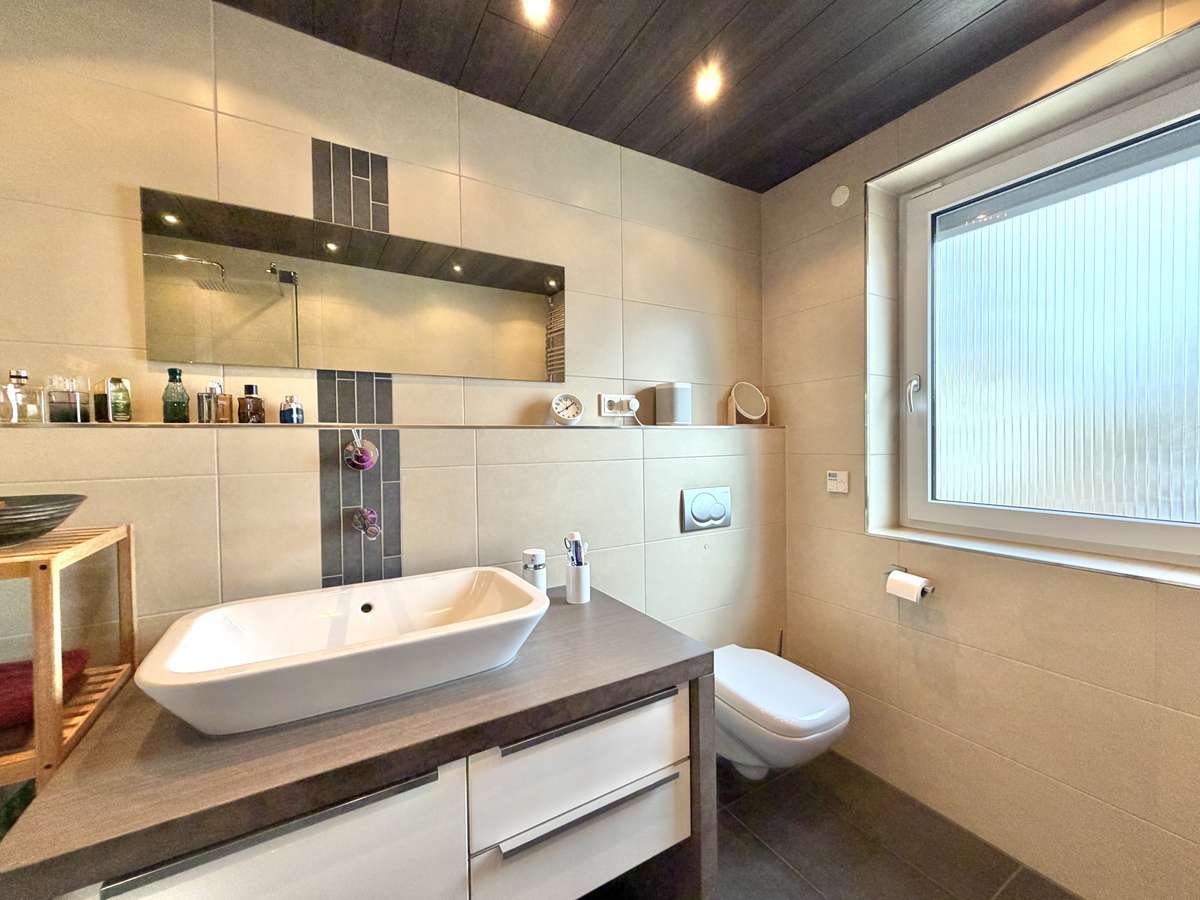 Im Obergeschoss befinden sich drei helle, vielseitig nutzbare Schlafzimmer sowie ein exklusives, beige gefliestes Badezimmer (2009 renoviert) mit großem Einzelwaschbecken, WC, Fenster, elektrischer Fußbodenheizung und einer bodengleichen Regendusche mit Glaswand.