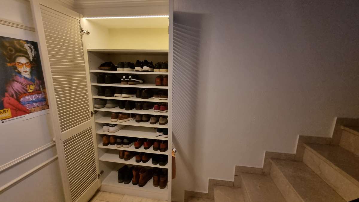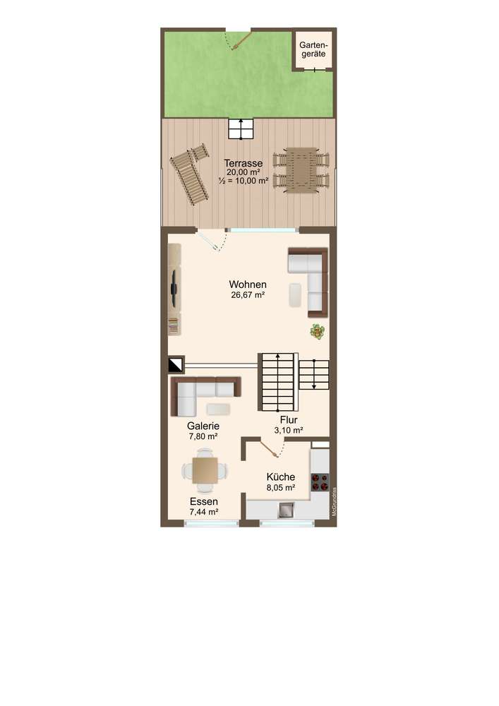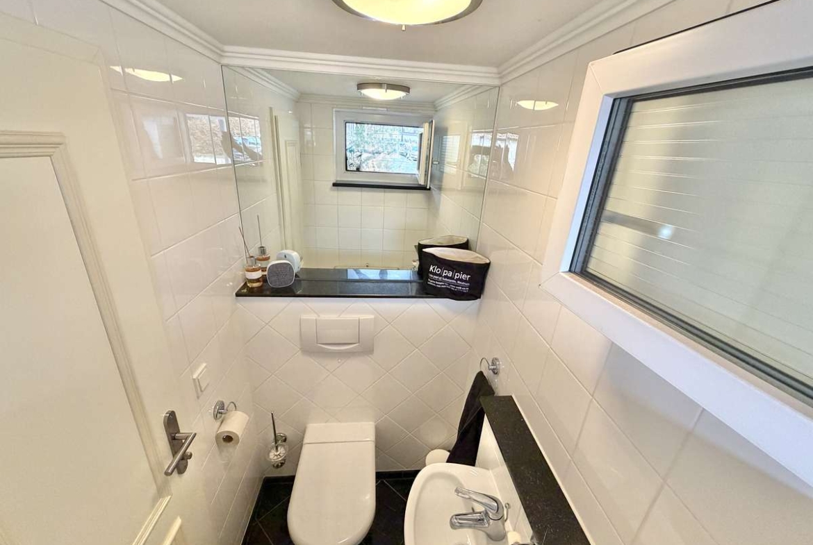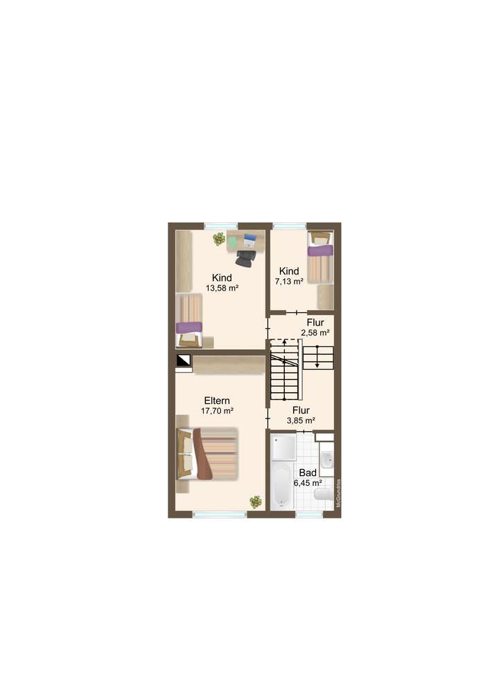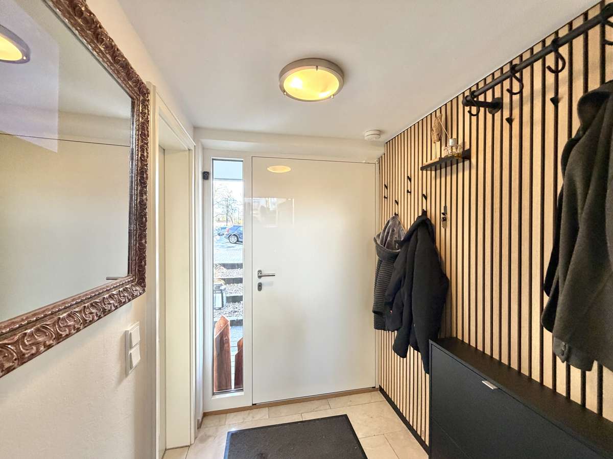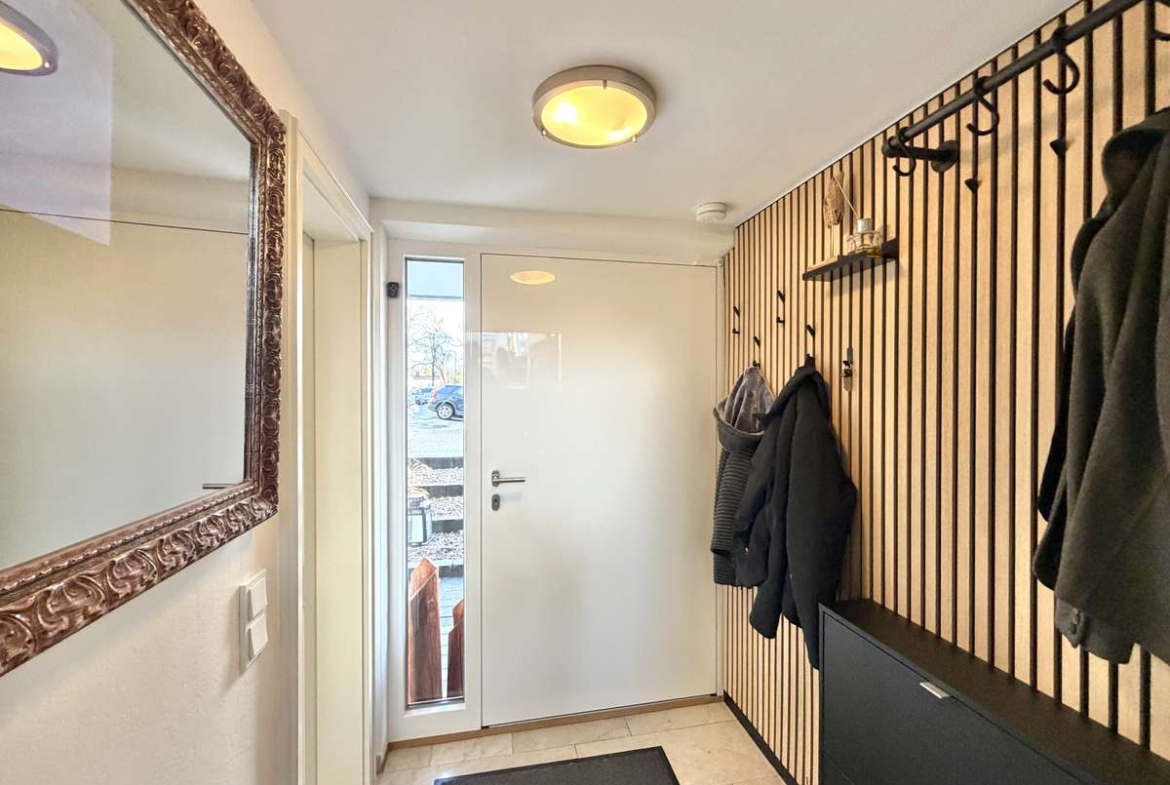 Über den einladenden Windfang betreten Sie das Reihenhaus. Im Eingangsbereich befindet sich ein weiß gefliestes Gäste-WC mit Fenster. Von hier aus gelangen Sie über die Treppe sowohl in die Wohnebene als auch in den Keller.