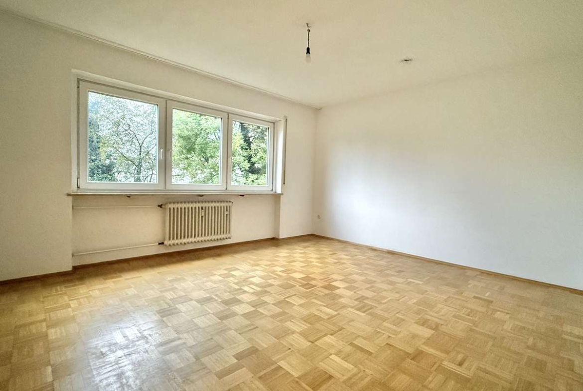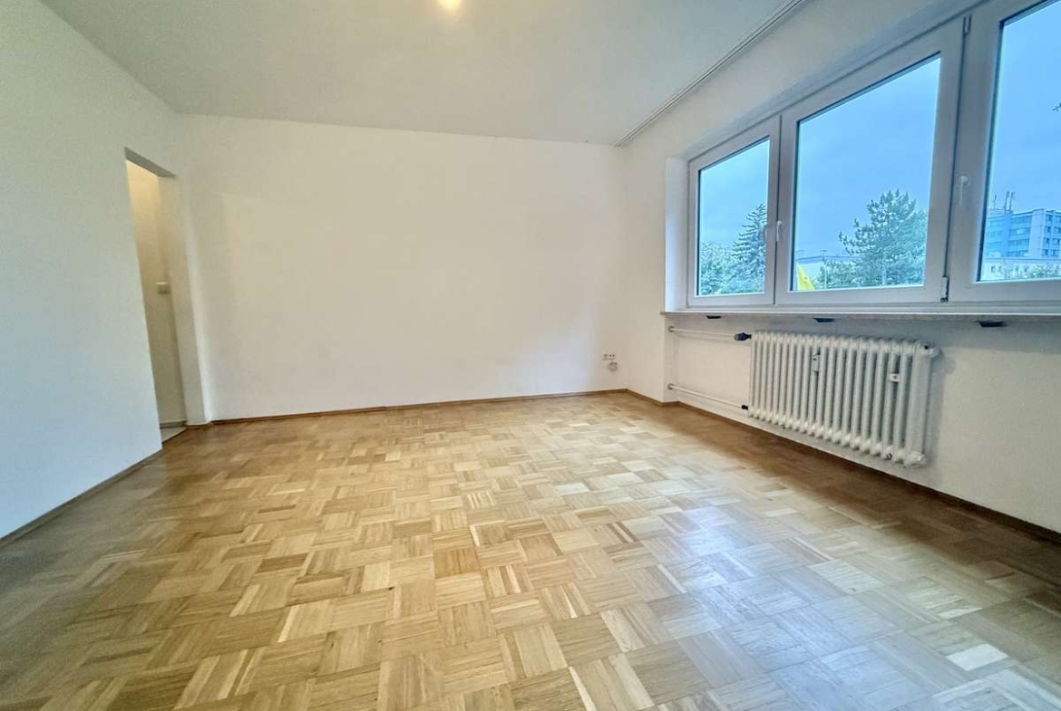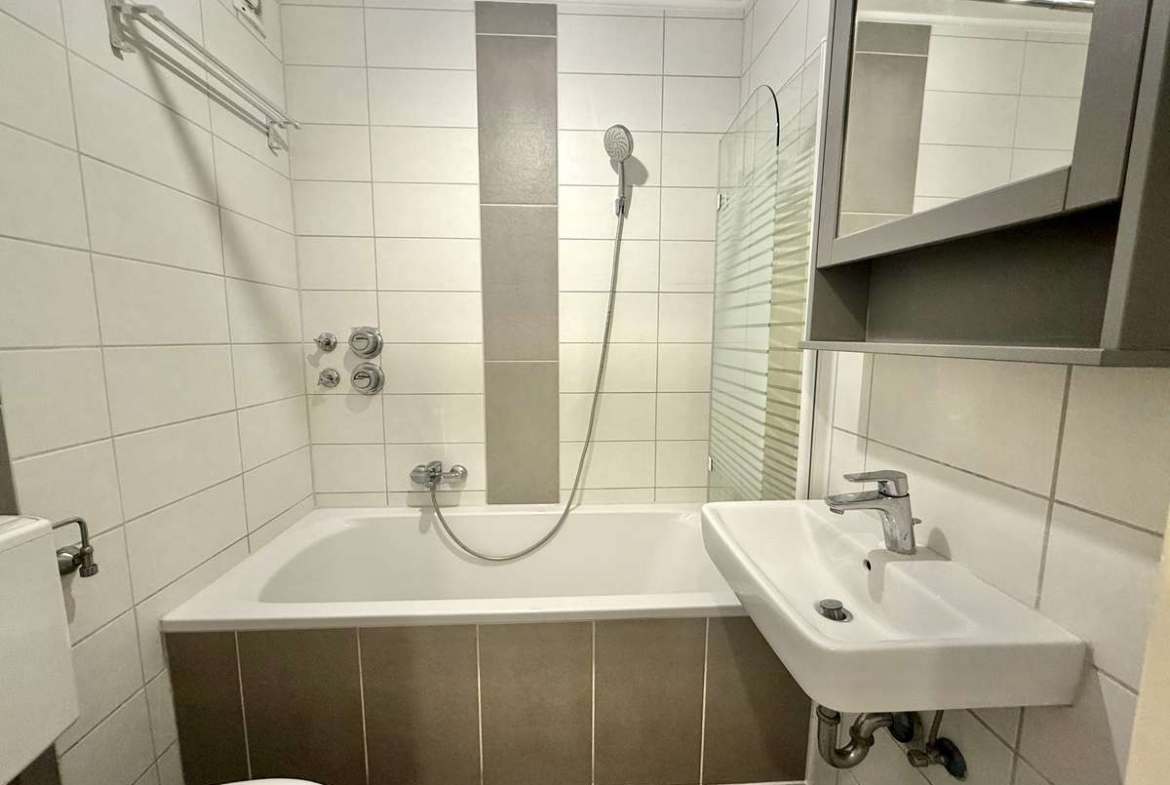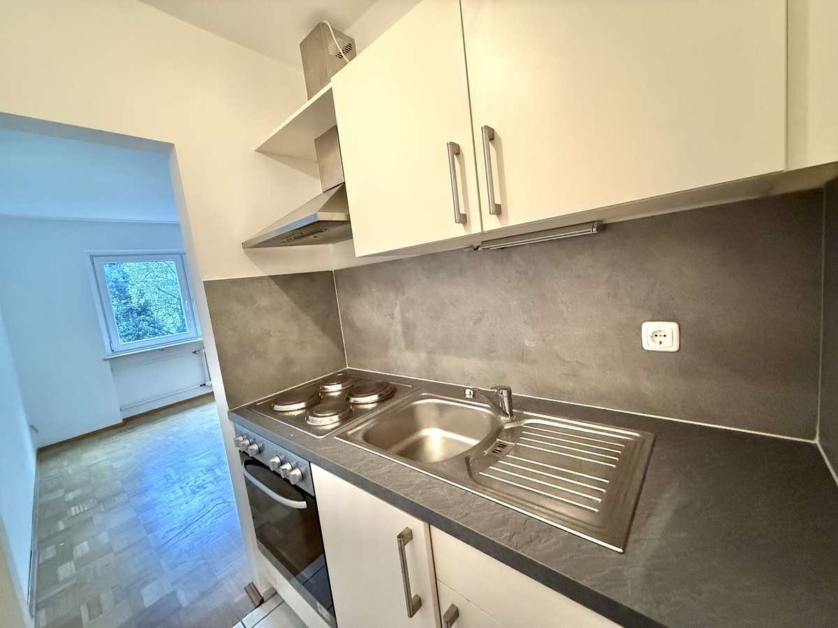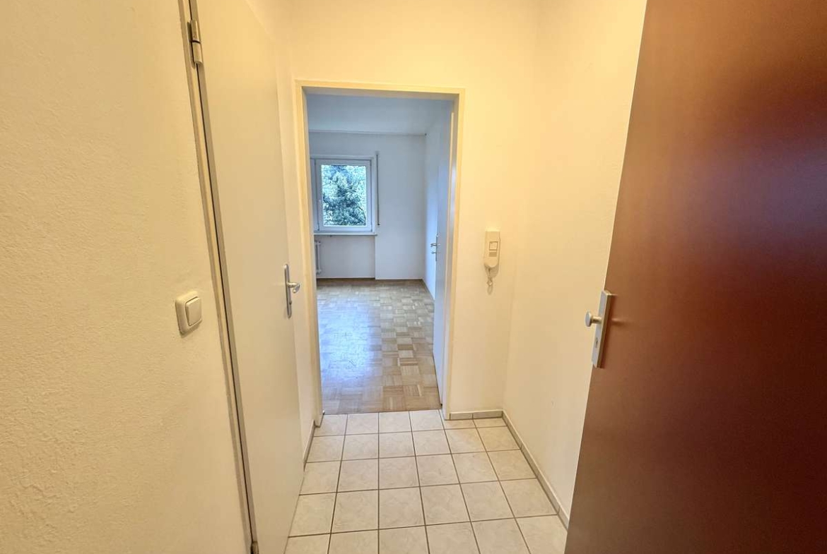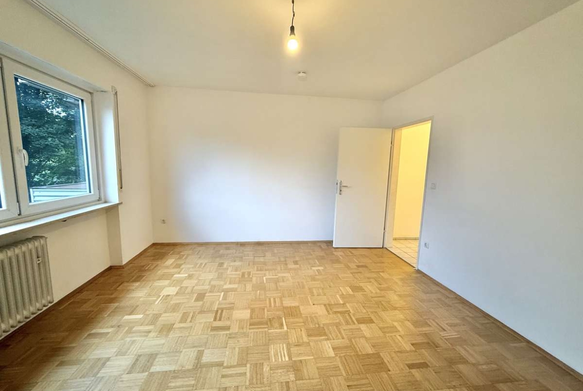 Beim Betreten der Wohnung gelangt man zunächst in den gefliesten Flur, von dem aus direkt das modernisierte Badezimmer zugänglich ist. Dieses wurde kürzlich erneuert und ist ausgestattet mit WC, Badewanne und Waschbecken. Der Wohnbereich ist mit ansprechendem Würfelparkett versehen, mit drei süd-westlich gerichteten Fenstern ausgestattet und bildet das zentrale Herzstück der Wohnung. Von hier aus gelangt man in die separate Küche, die mit einer Einbauküche aus dem Jahr 2019 ausgestattet ist. Diese umfasst eine Spüle, einen Elektroherd mit Backofen, einen Kühlschrank sowie einen modernen Dampfabzug.