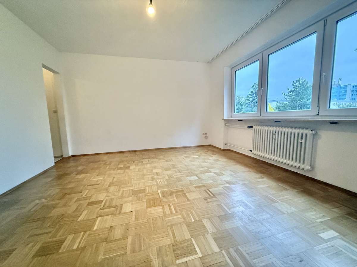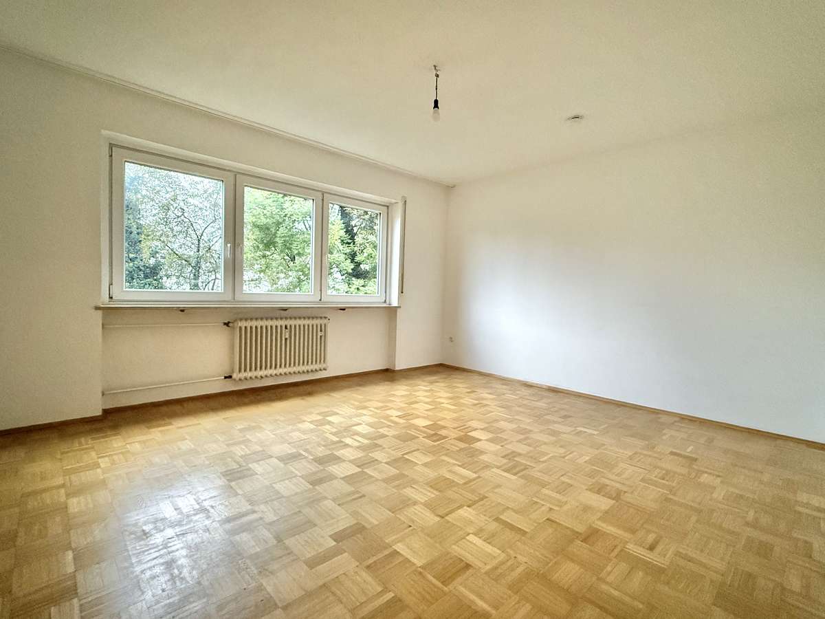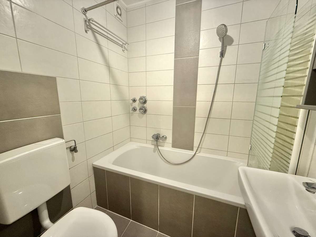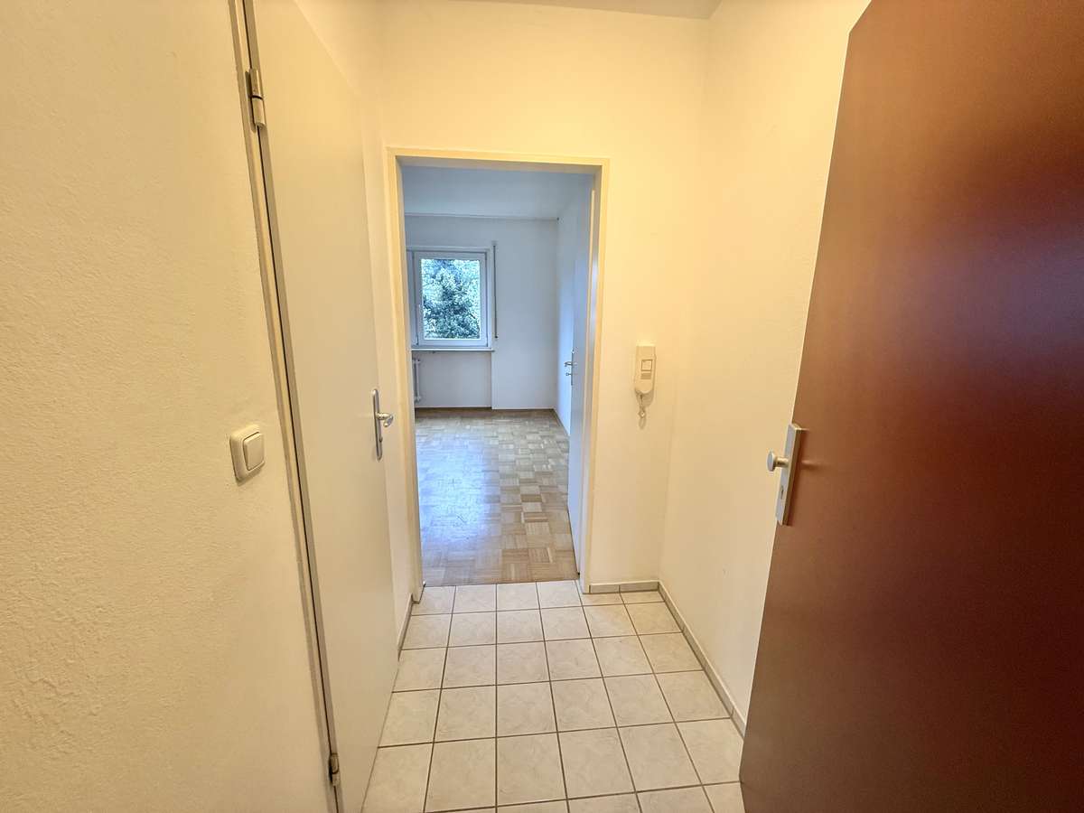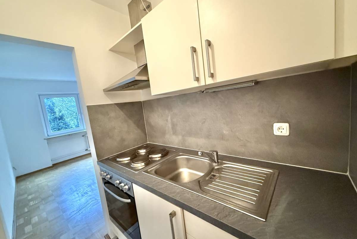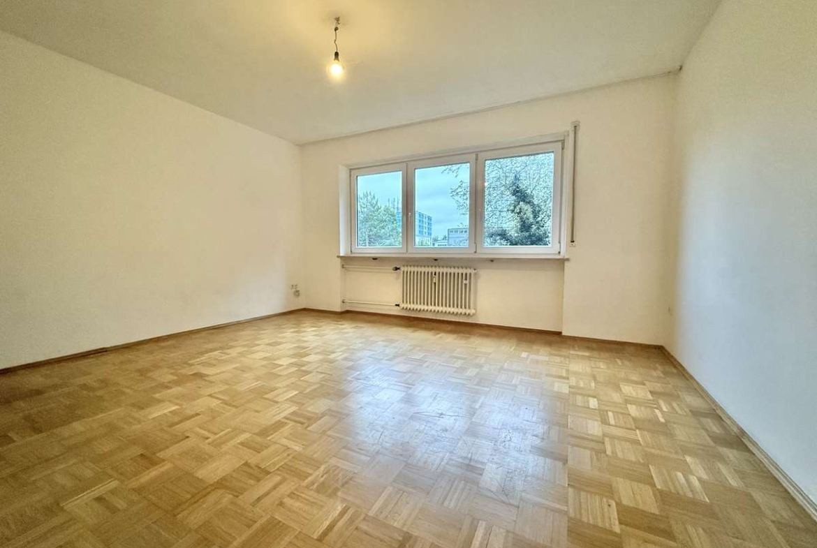 Beim Betreten der Wohnung gelangt man zunächst in den gefliesten Flur, von dem aus direkt das modernisierte Badezimmer zugänglich ist. Dieses wurde kürzlich erneuert und ist ausgestattet mit WC, Badewanne und Waschbecken. Der Wohnbereich ist mit ansprechendem Würfelparkett versehen, mit drei süd-westlich gerichteten Fenstern ausgestattet und bildet das zentrale Herzstück der Wohnung. Von hier aus gelangt man in die separate Küche, die mit einer Einbauküche aus dem Jahr 2019 ausgestattet ist. Diese umfasst eine Spüle, einen Elektroherd mit Backofen, einen Kühlschrank sowie einen modernen Dampfabzug.