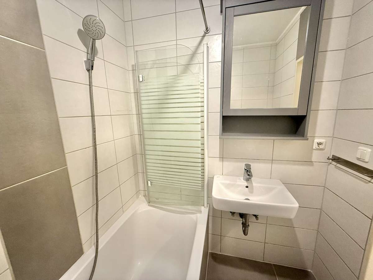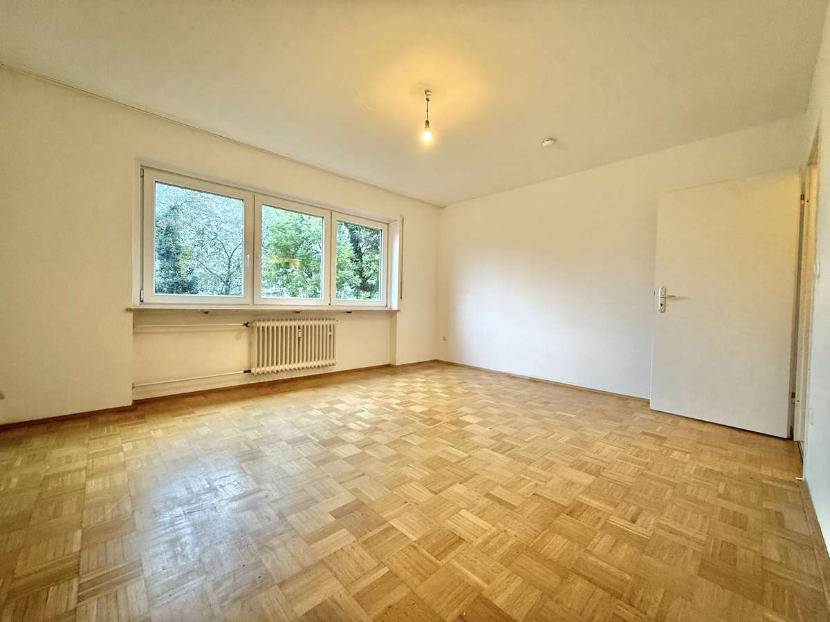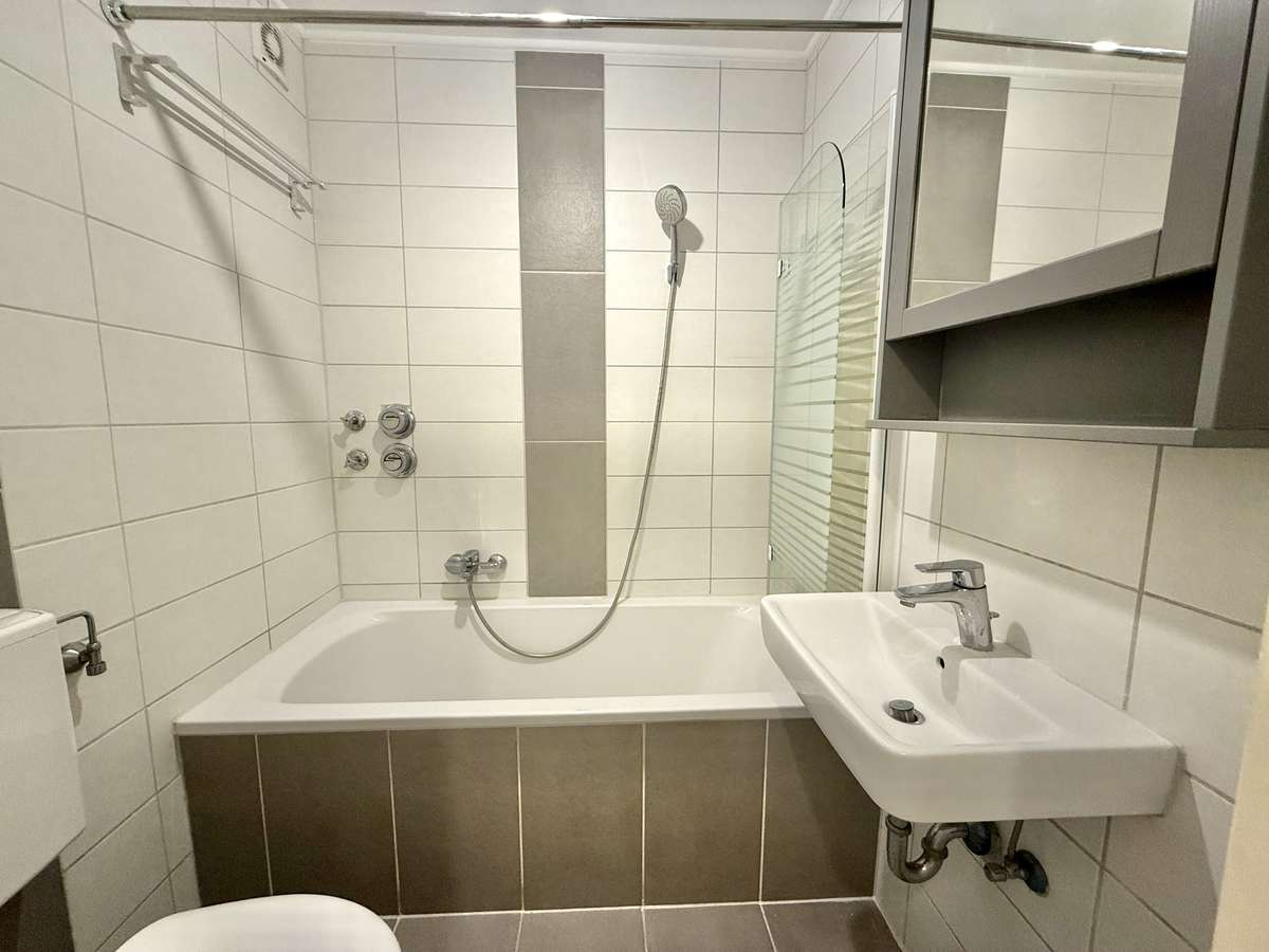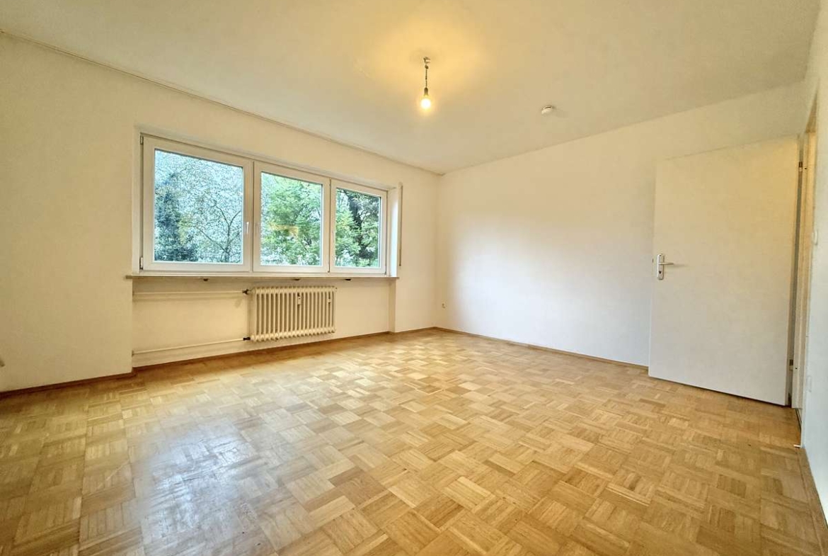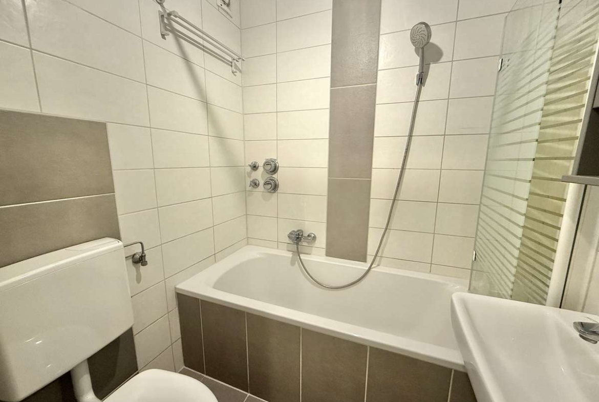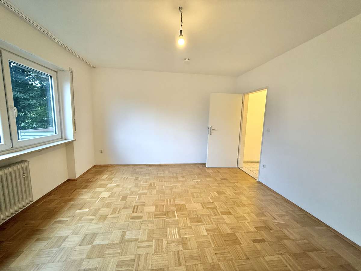 Beim Betreten der Wohnung gelangt man zunächst in den gefliesten Flur, von dem aus direkt das modernisierte Badezimmer zugänglich ist. Dieses wurde kürzlich erneuert und ist ausgestattet mit WC, Badewanne und Waschbecken. Der Wohnbereich ist mit ansprechendem Würfelparkett versehen, mit drei süd-westlich gerichteten Fenstern ausgestattet und bildet das zentrale Herzstück der Wohnung. Von hier aus gelangt man in die separate Küche, die mit einer Einbauküche aus dem Jahr 2019 ausgestattet ist. Diese umfasst eine Spüle, einen Elektroherd mit Backofen, einen Kühlschrank sowie einen modernen Dampfabzug.