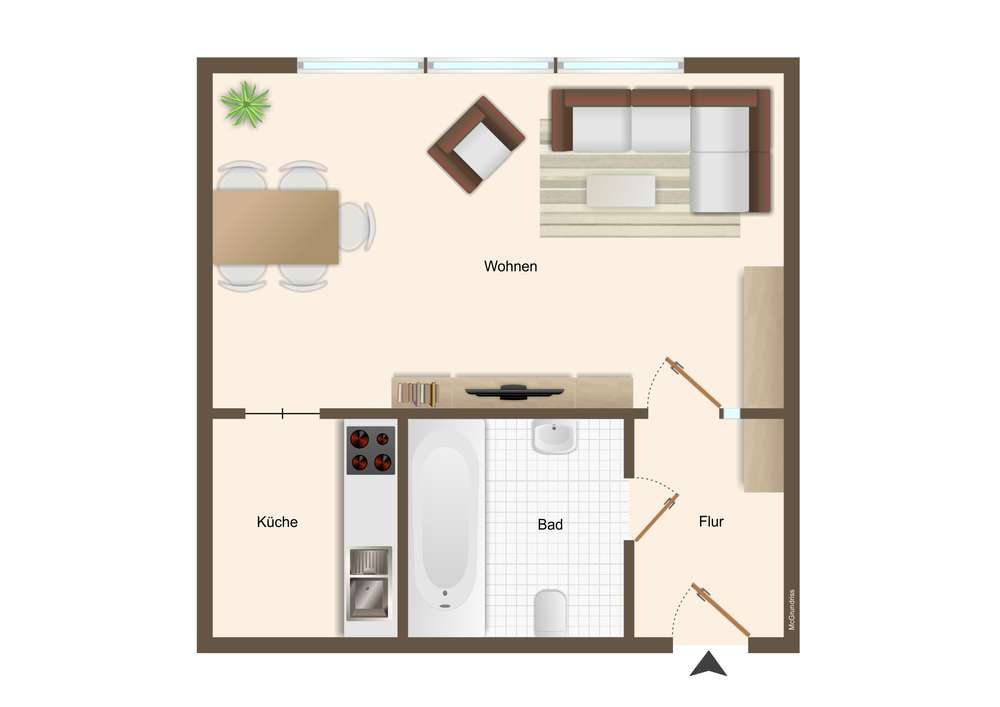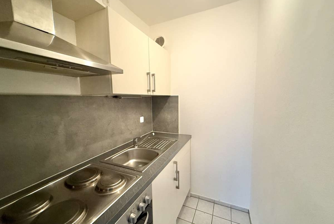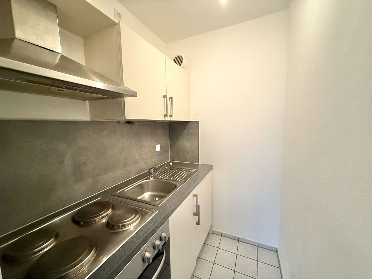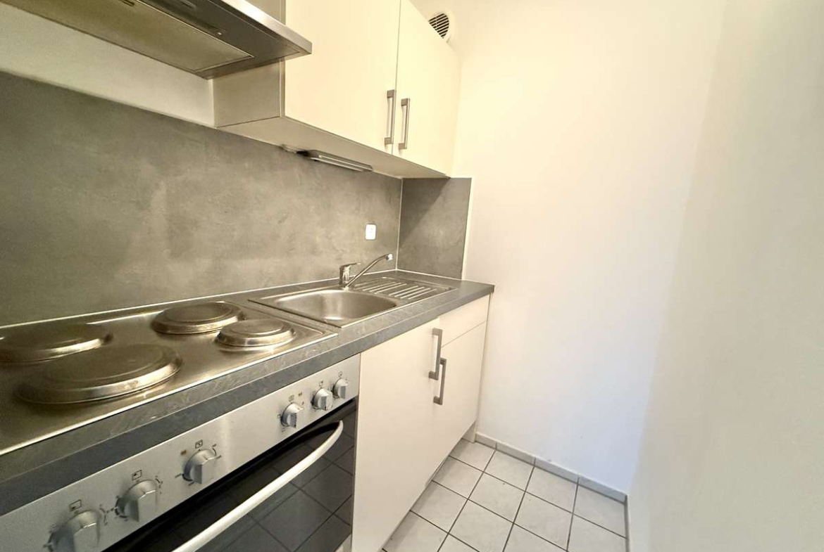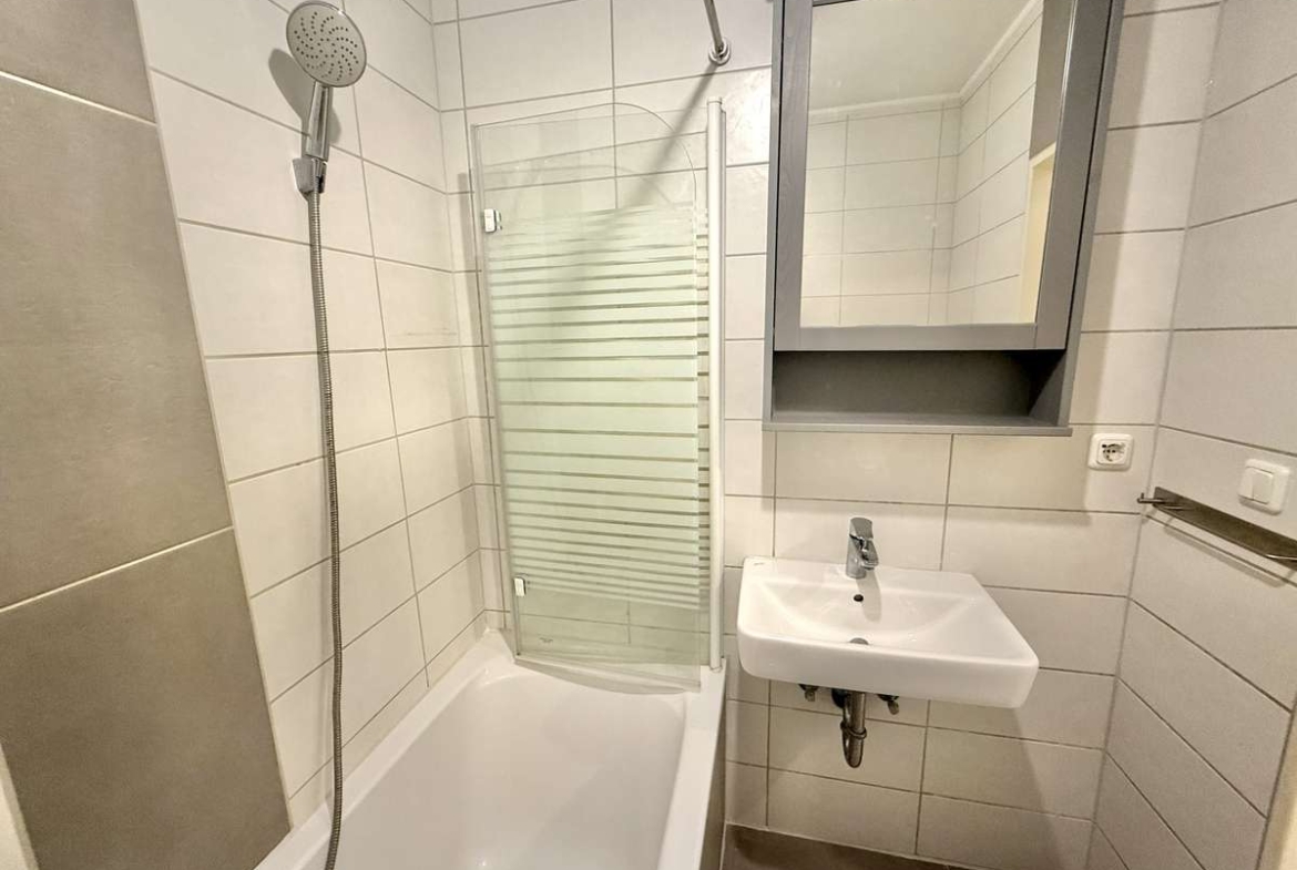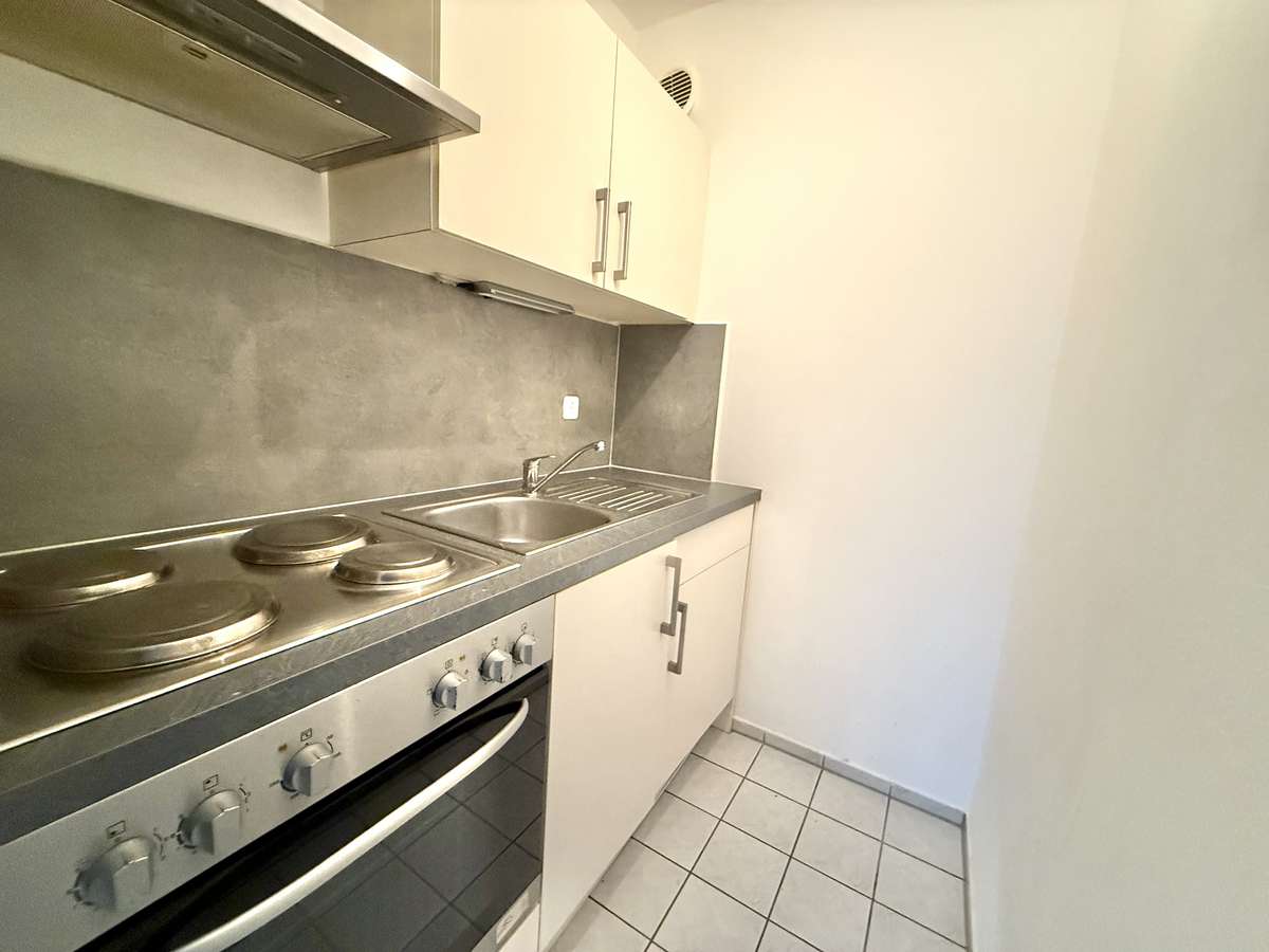 Beim Betreten der Wohnung gelangt man zunächst in den gefliesten Flur, von dem aus direkt das modernisierte Badezimmer zugänglich ist. Dieses wurde kürzlich erneuert und ist ausgestattet mit WC, Badewanne und Waschbecken. Der Wohnbereich ist mit ansprechendem Würfelparkett versehen, mit drei süd-westlich gerichteten Fenstern ausgestattet und bildet das zentrale Herzstück der Wohnung. Von hier aus gelangt man in die separate Küche, die mit einer Einbauküche aus dem Jahr 2019 ausgestattet ist. Diese umfasst eine Spüle, einen Elektroherd mit Backofen, einen Kühlschrank sowie einen modernen Dampfabzug.