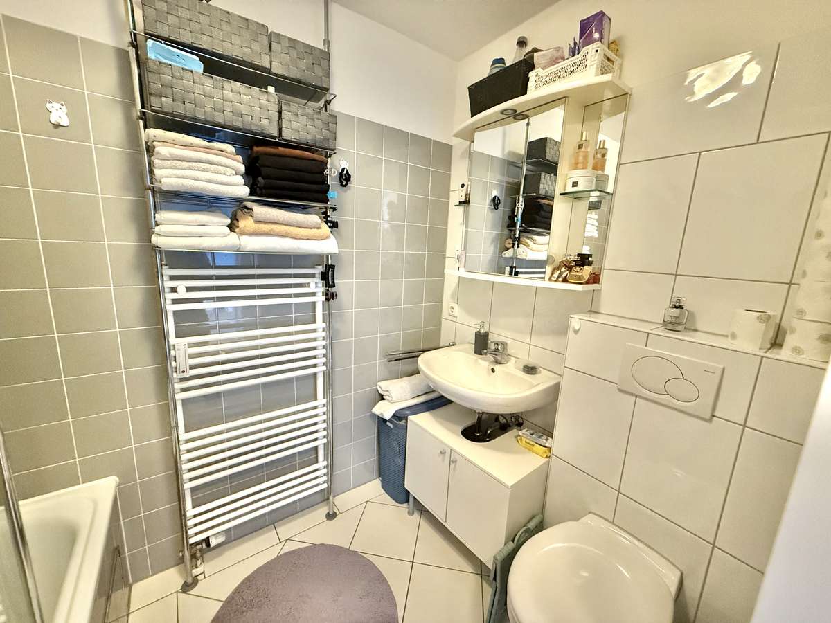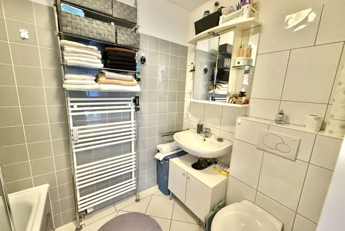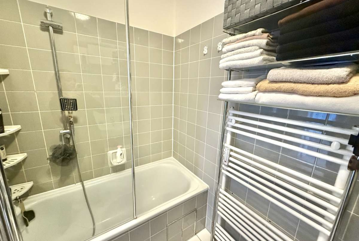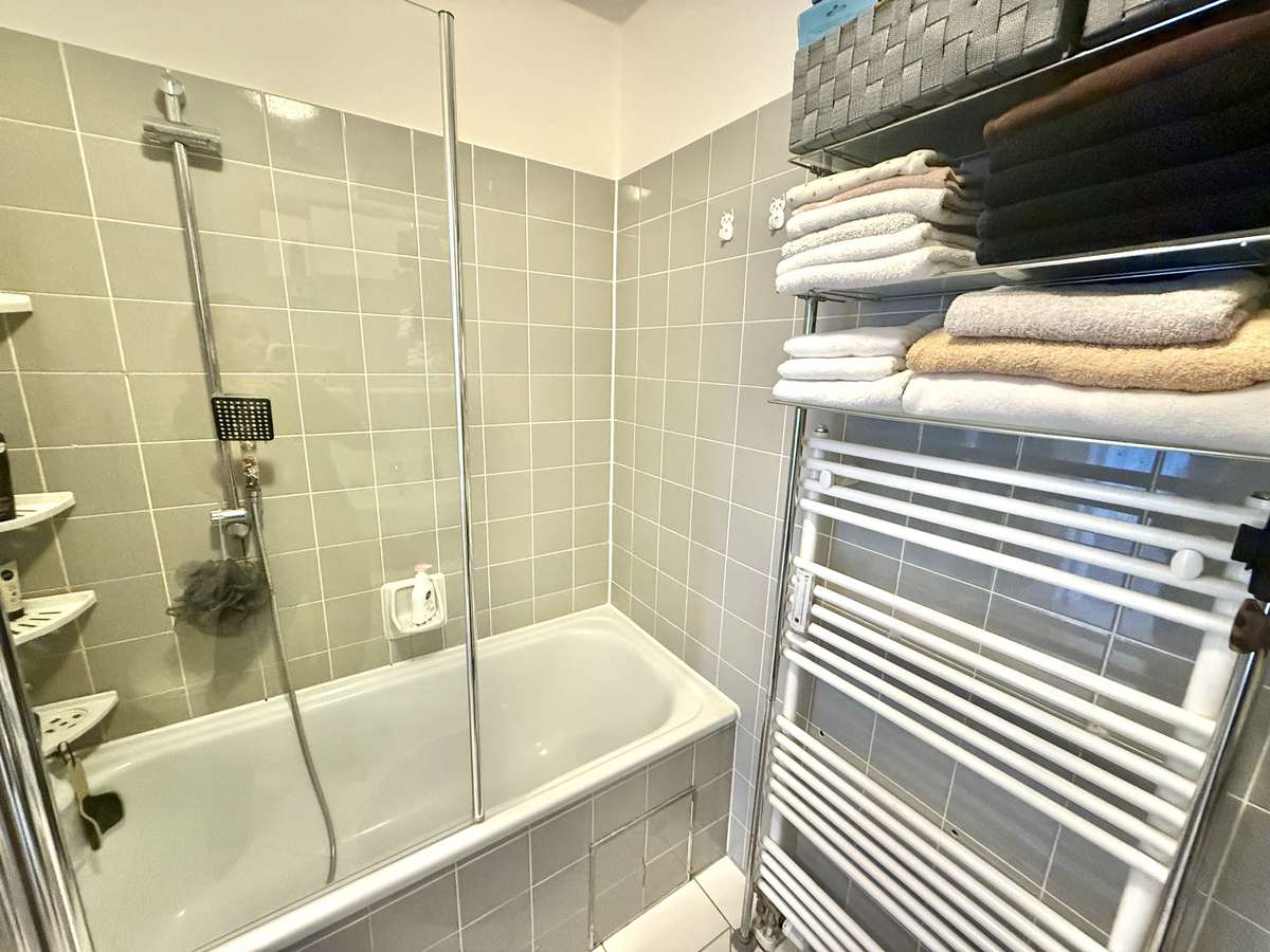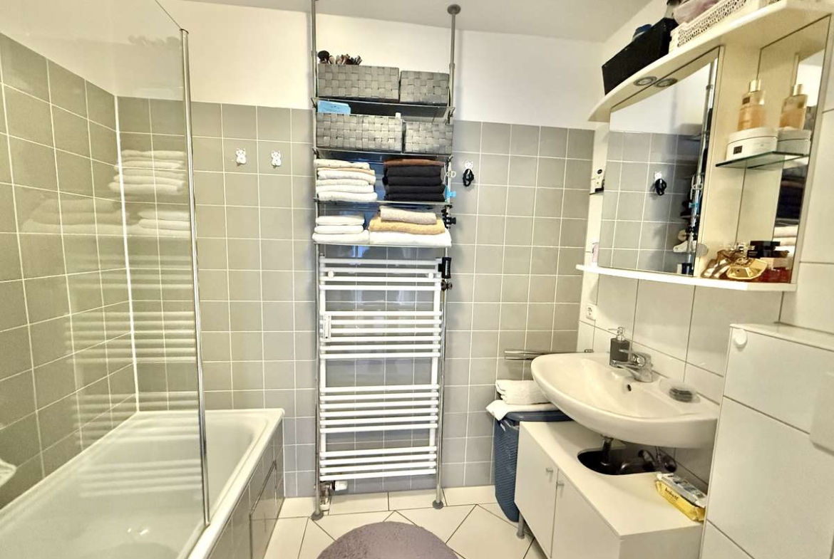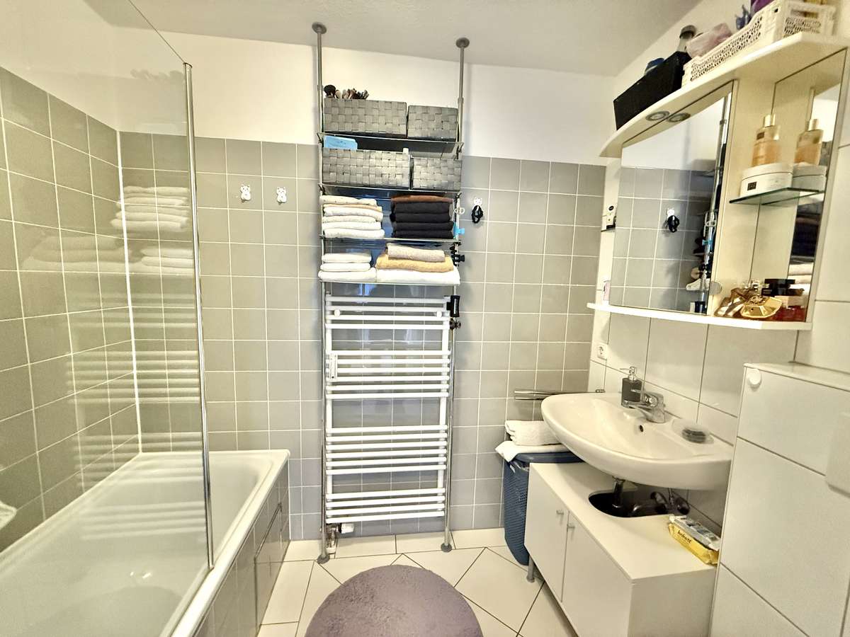 Das Badezimmer ist elegant in Weiß und Grau gefliest und überzeugt durch Funktionalität und Stil. Die Badewanne mit Echtglasduschwand, das Waschbecken mit Spiegelschrank, das WC sowie die Handtuchheizung schaffen einen modernen Wohlfühlbereich.