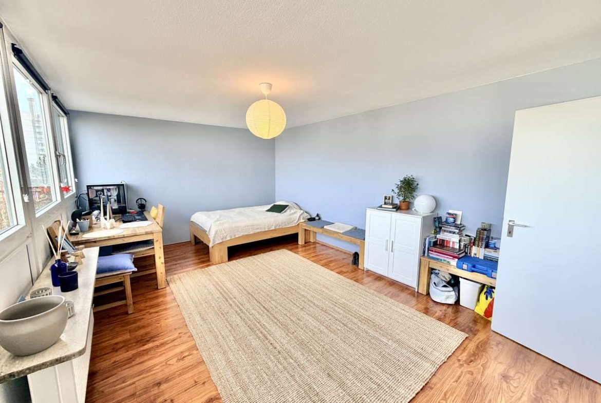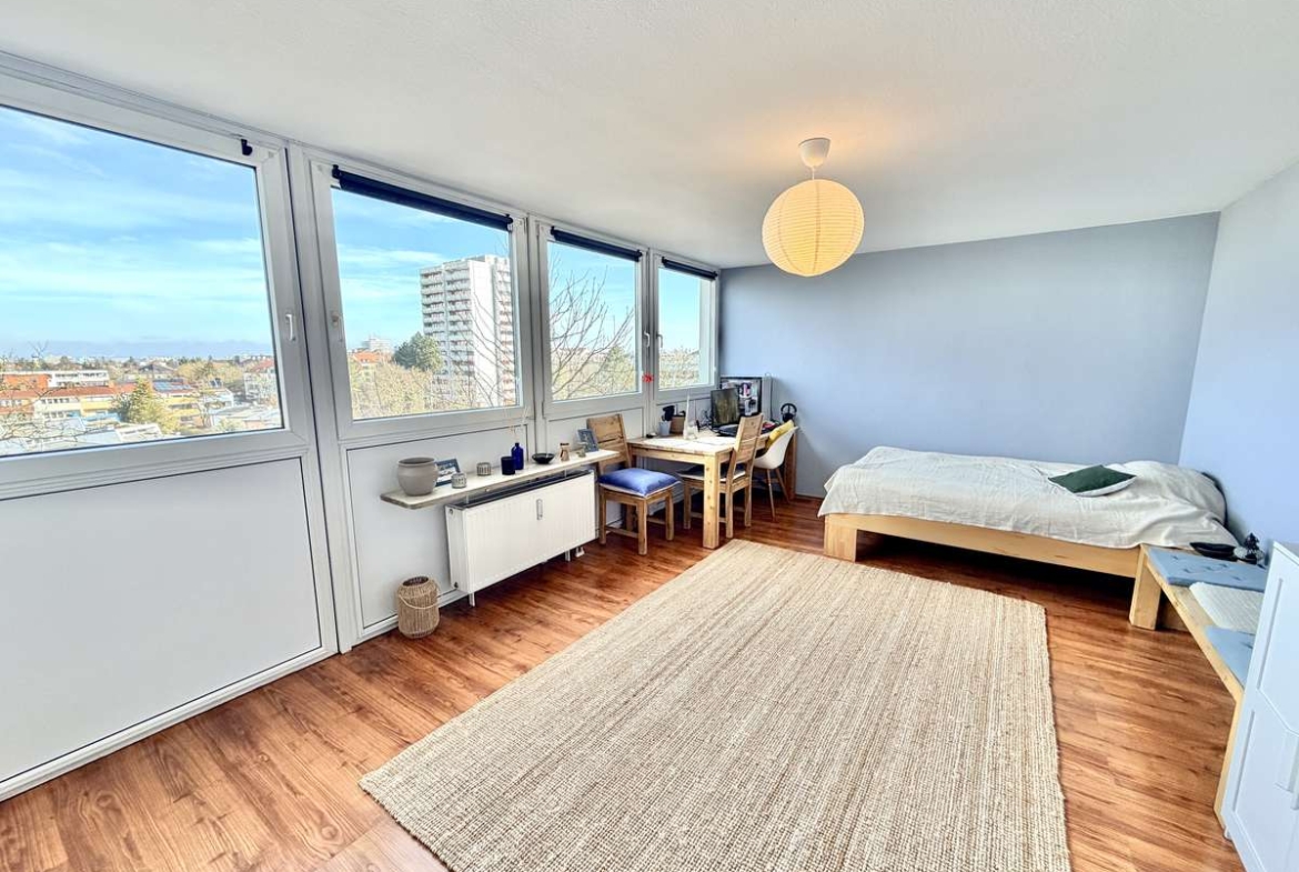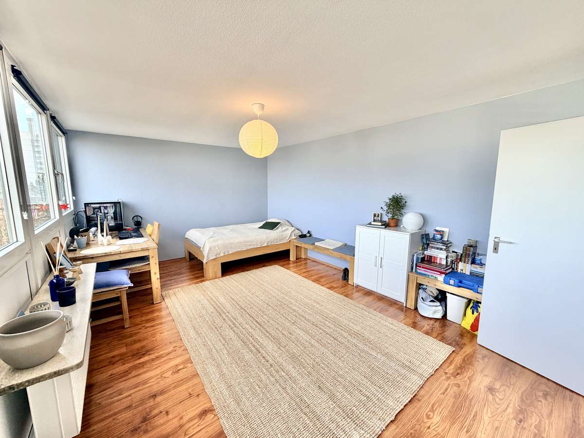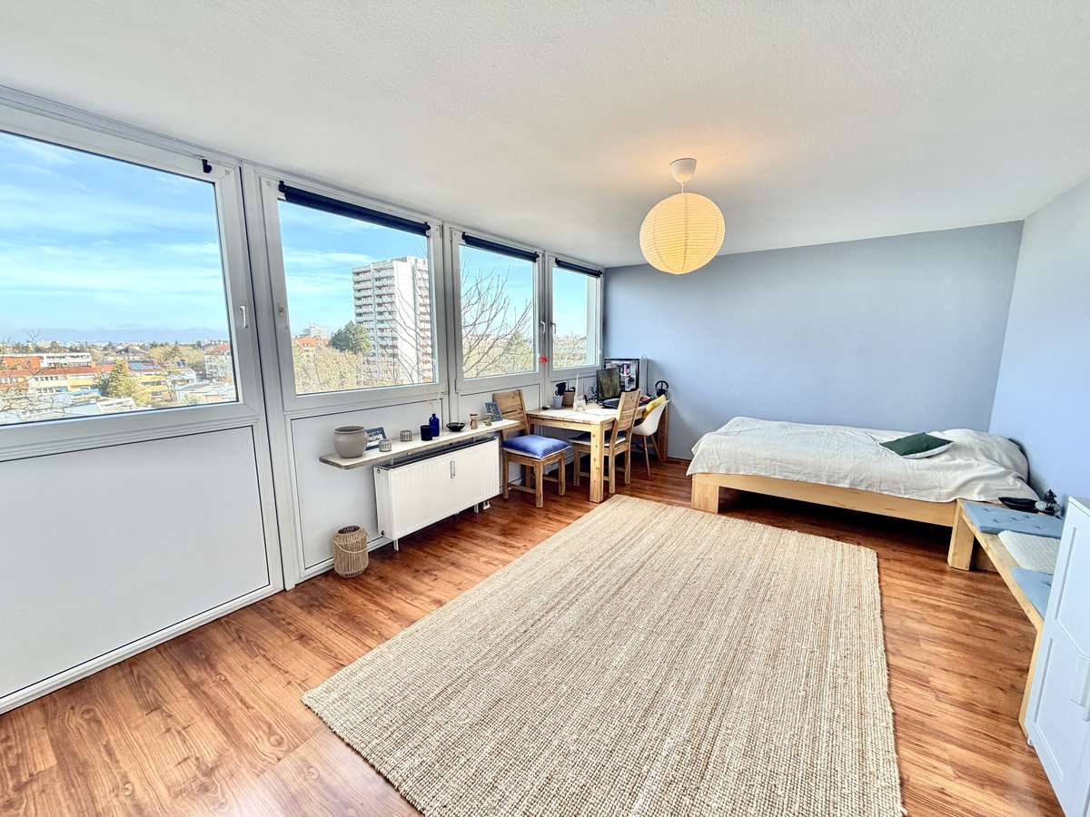 Der lichtdurchflutete Wohn-/Schlafbereich mit großer Fensterfront nach Nordosten sowie der warme Kirschlaminatboden schaffen eine angenehme Wohlfühlatmosphäre.