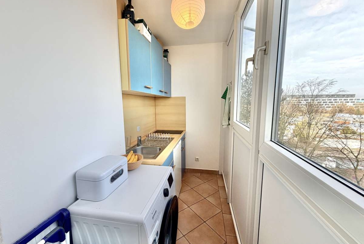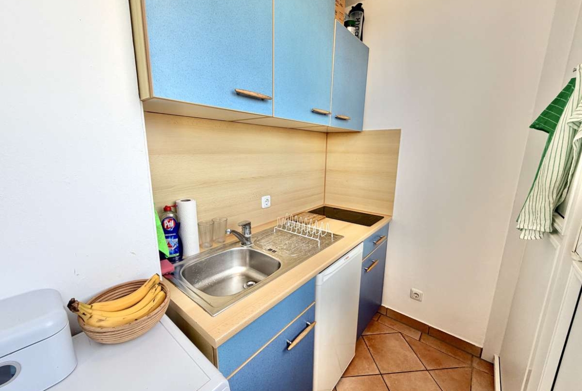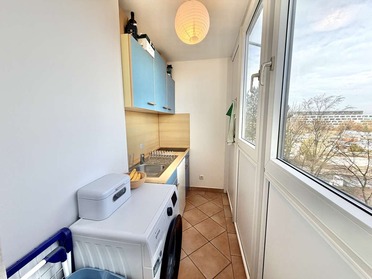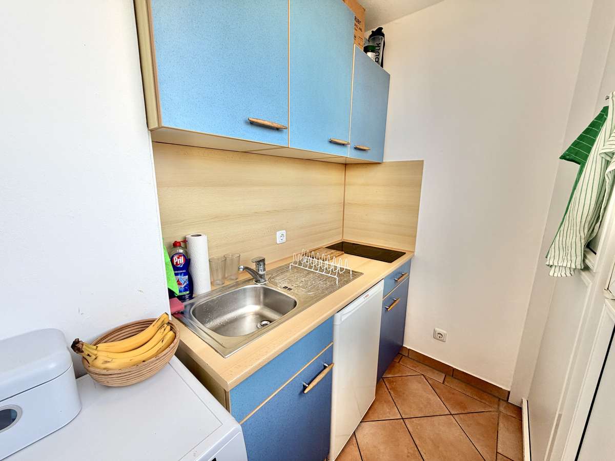 Die separate Küche präsentiert sich hell und einladend und ist mit terrakottafarbenen Fliesen sowie einer im Mietpreis enthaltenen blauen Einbauküche ausgestattet. Diese bietet mit 2-Platten-Ceranfeld, Spüle, Kühlschrank mit Gefrierfach und Waschmaschinenanschluss eine praktische und zugleich stilvolle Ausstattung für den Alltag. Die vorhandene Waschmaschine kann bei Interesse für 150 € VB übernommen werden.