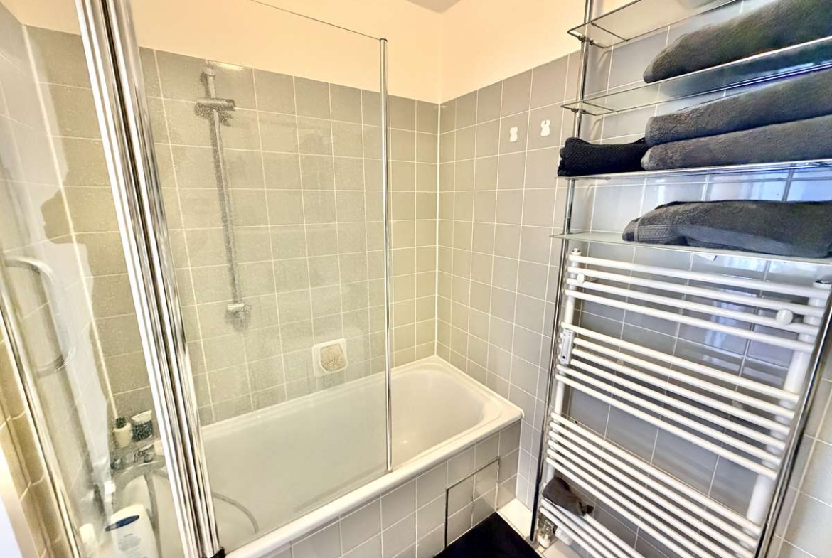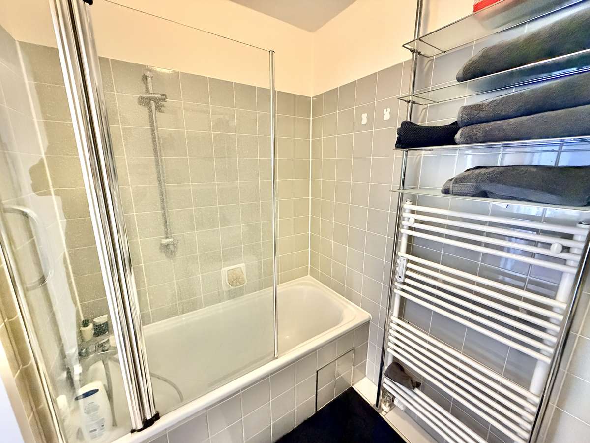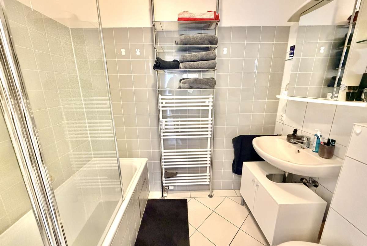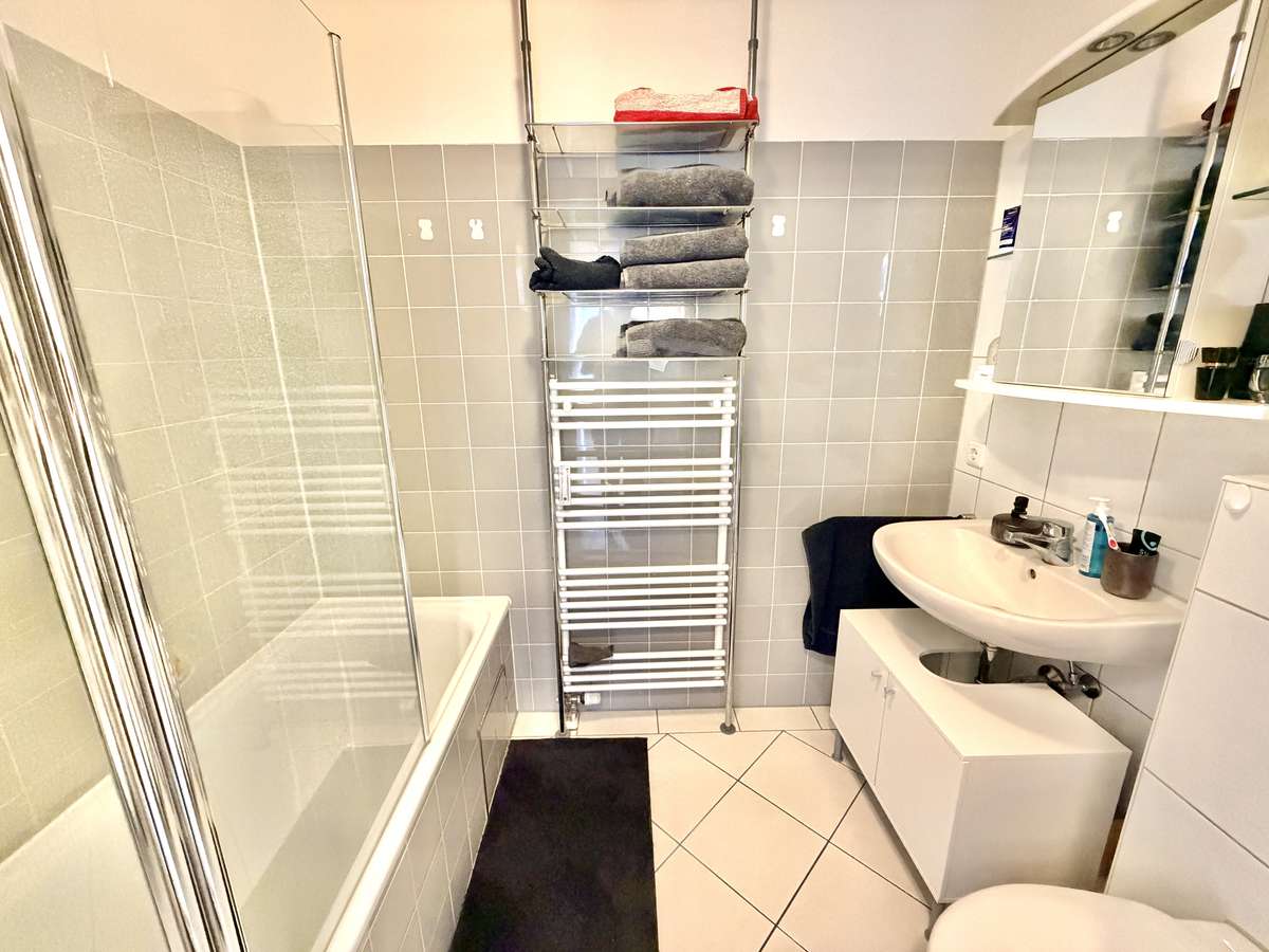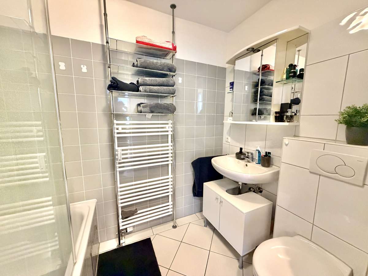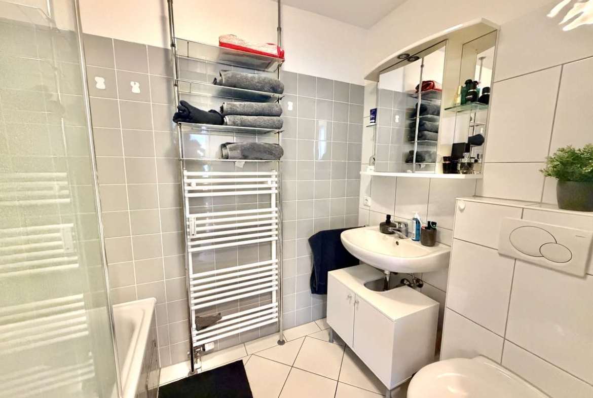 Das modern geflieste Bad in Weiß und Grau verfügt über eine Badewanne mit Echtglasduschwand, Spiegelschrank, Handtuchheizung, Waschbecken und WC. Weiße Kunststofffenster und -türen, Kabelanschluss, Sprechanlage sowie ein Kellerabteil ergänzen die Ausstattung.