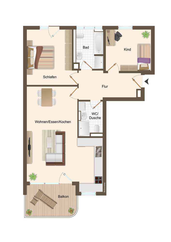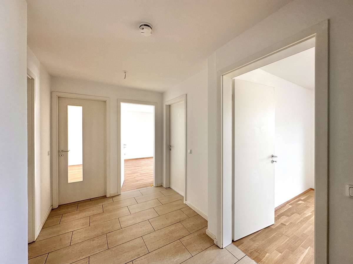 Beim Betreten der Wohnung empfängt Sie ein freundlich gestalteter, beige gefliester Flur, von dem aus alle Räume erreichbar sind. Diese durchdachte Aufteilung sorgt für kurze Wege und eine klare Struktur.
