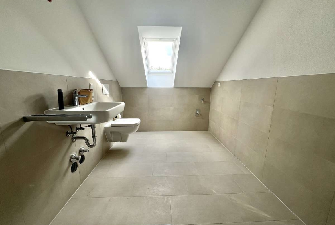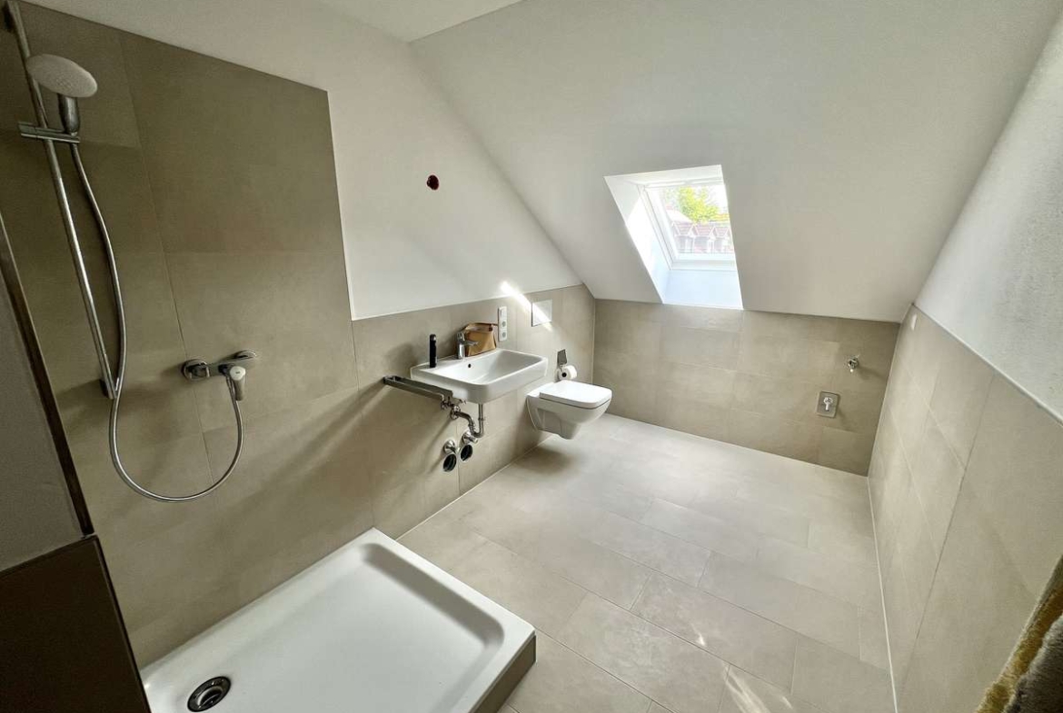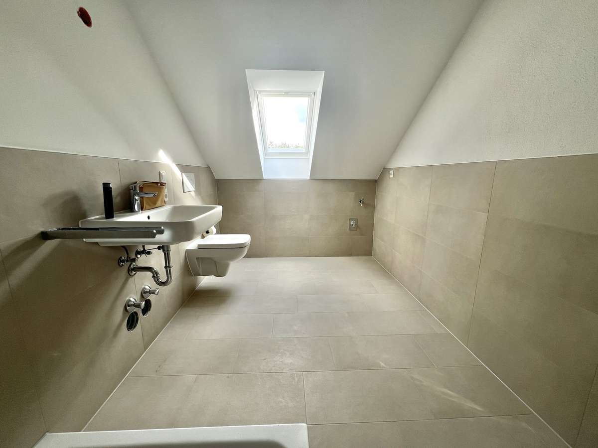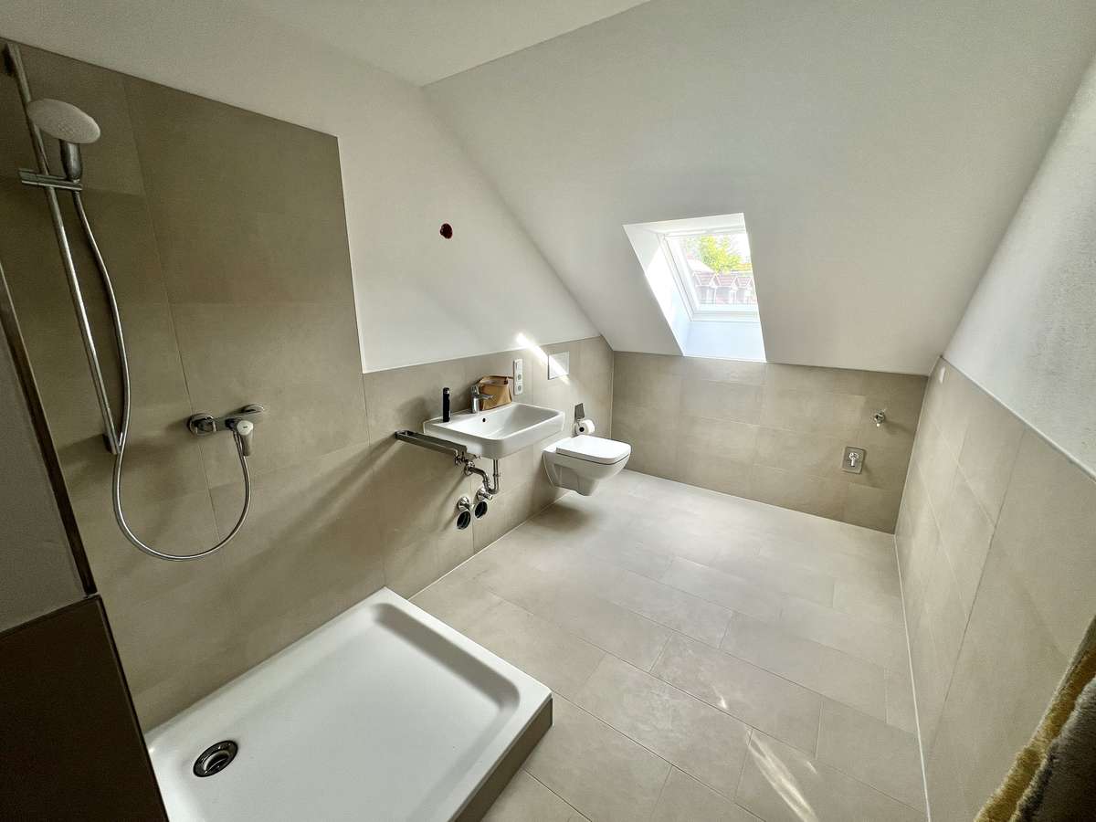 Das Tageslichtbad ist schlicht und modern in sandfarbenen Fliesen gestaltet und verfügt über eine Dusche, ein WC, ein Waschbecken sowie einen Waschmaschinenanschluss. Das Fenster sorgt für angenehmes Tageslicht und gute Belüftung.