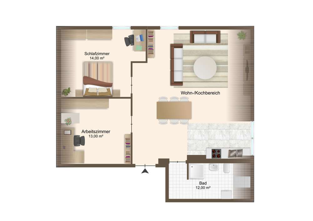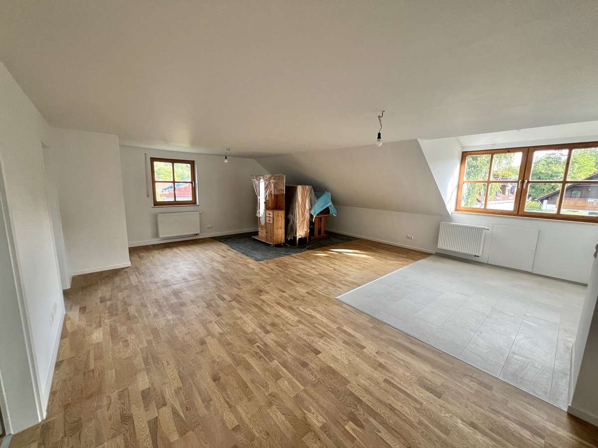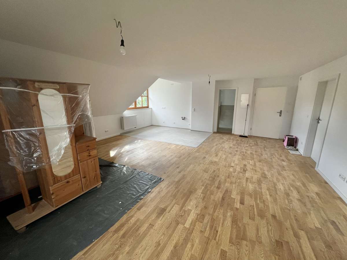 Betritt man die Wohnung, öffnet sich direkt der helle Wohn- und Kochbereich, der das Herzstück der Wohnung bildet. Der offen gestaltete Raum verbindet Kochen, Essen und Wohnen auf angenehme Weise. Während der Kochbereich mit pflegeleichten Fliesen ausgestattet ist, sorgt im Wohnbereich der neu verlegte Parkettboden für eine warme und einladende Atmosphäre.