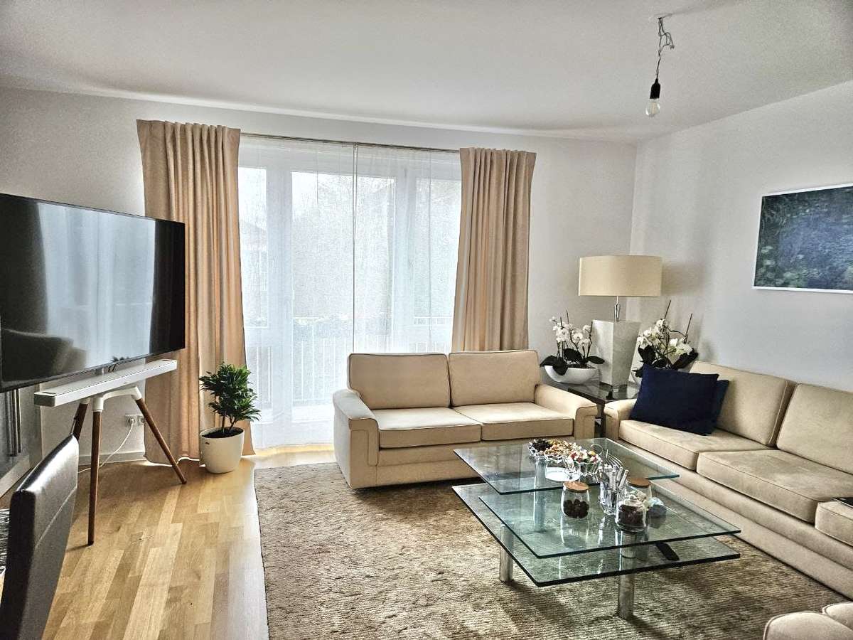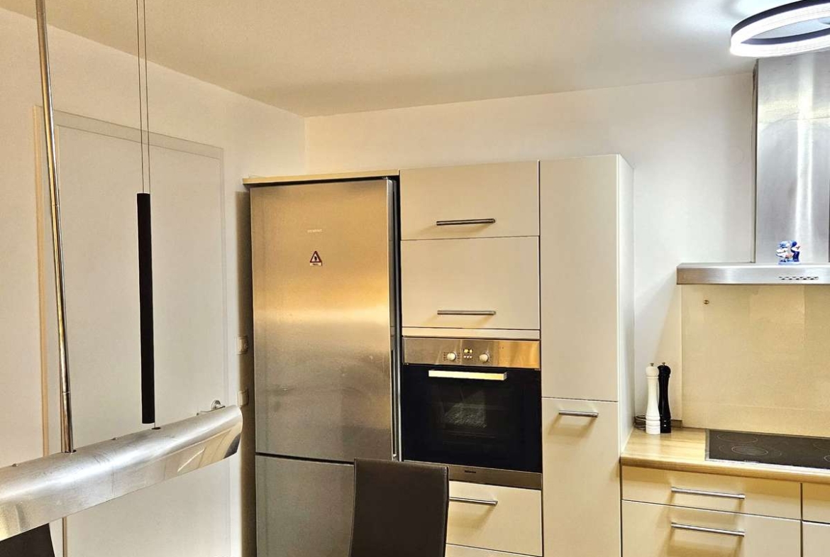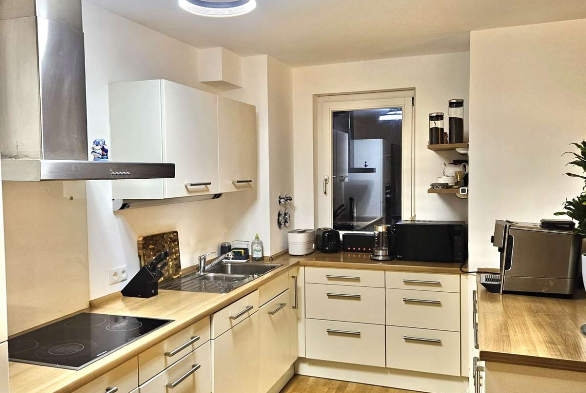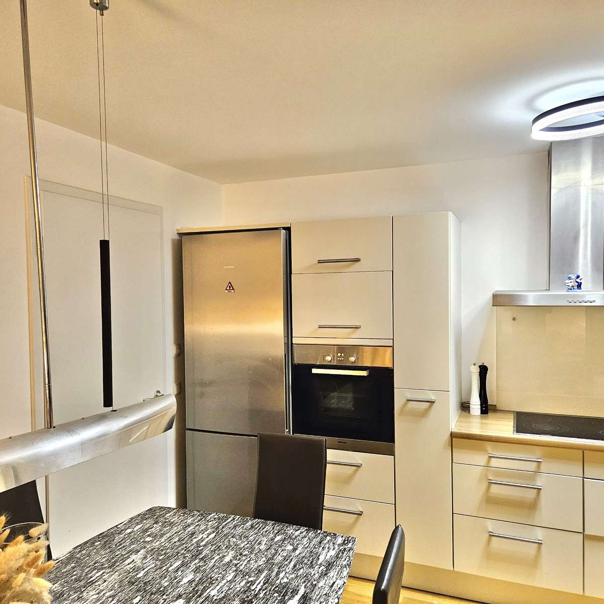 Der Mittelpunkt des Wohnens ist das weitläufige Wohnzimmer mit edlem Parkettboden und integriertem Essbereich. Direkt angrenzend liegt die geschmackvolle, beige Einbauküche, die seitens der Vermieter vollständig ausgestattet und im Mietpreis enthalten ist. Sie verfügt über einen Kühl-Gefrierschrank, ein Cerankochfeld mit Dampfabzug, eine neue Spülmaschine sowie zahlreiche Küchenschränke – ideal für komfortables und entspanntes Kochen.