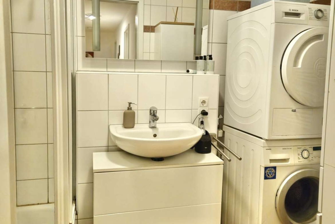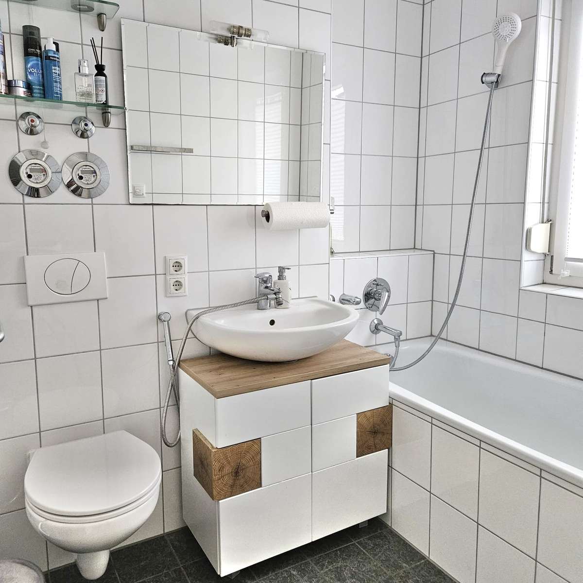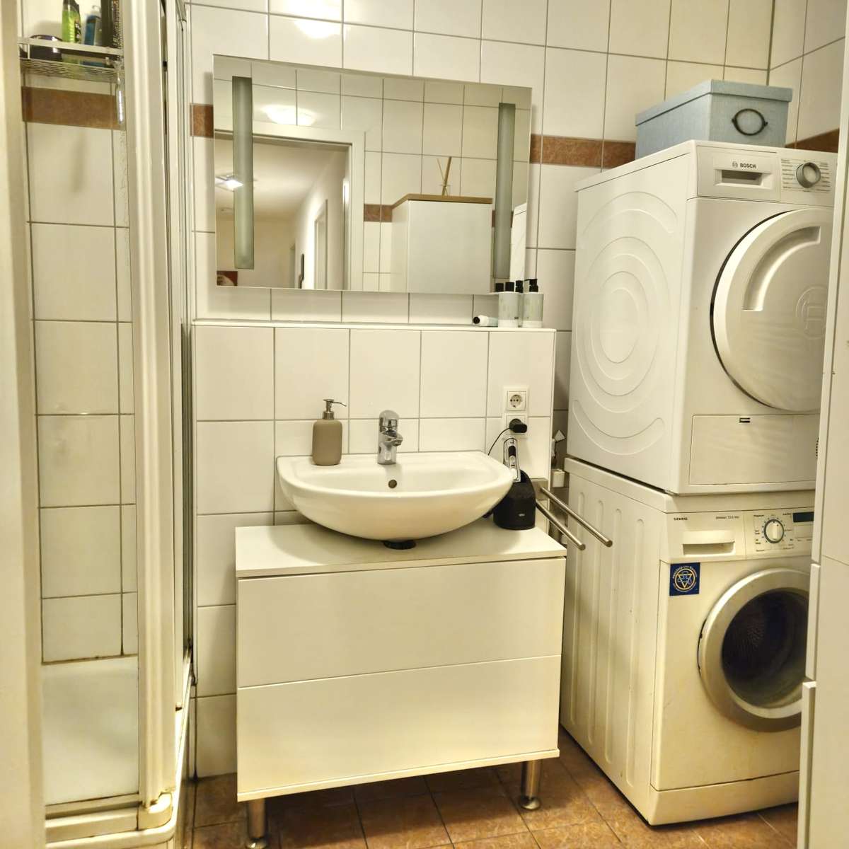 Die Wohnung bietet zwei Bäder. In zeitloser, weißer Fliesenoptik gehalten, ist eines der Bäder mit Dusche, Waschmaschinenanschluss, WC und Waschbecken ausgestattet, das zweite mit Fenster, Badewanne, WC und Waschbecken – perfekt für Paare oder Familien.