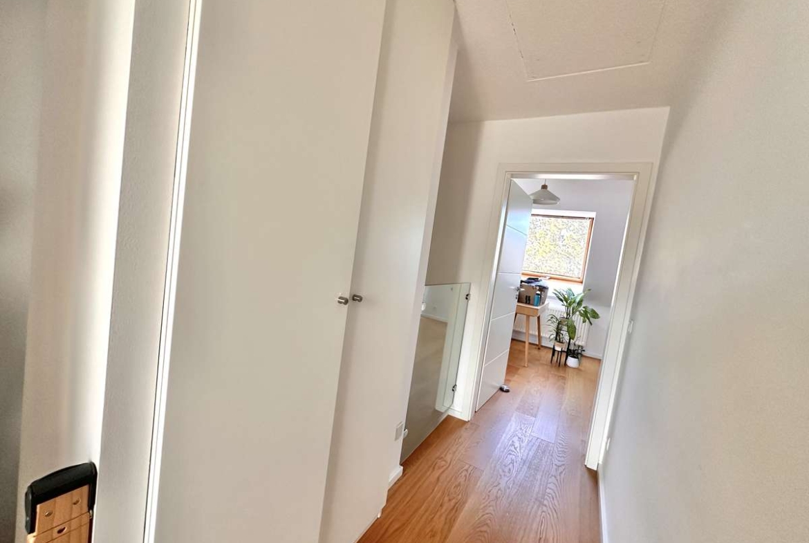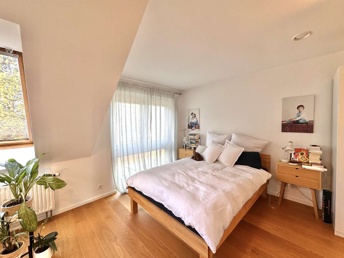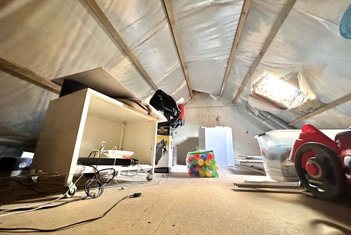 Dachgeschoss: Im ausgebauten Dachgeschoss befinden sich ein weiteres Zimmer und ein grau gefliestes Bad mit Badewanne, separater Dusche und zwei großen Dachfenstern.