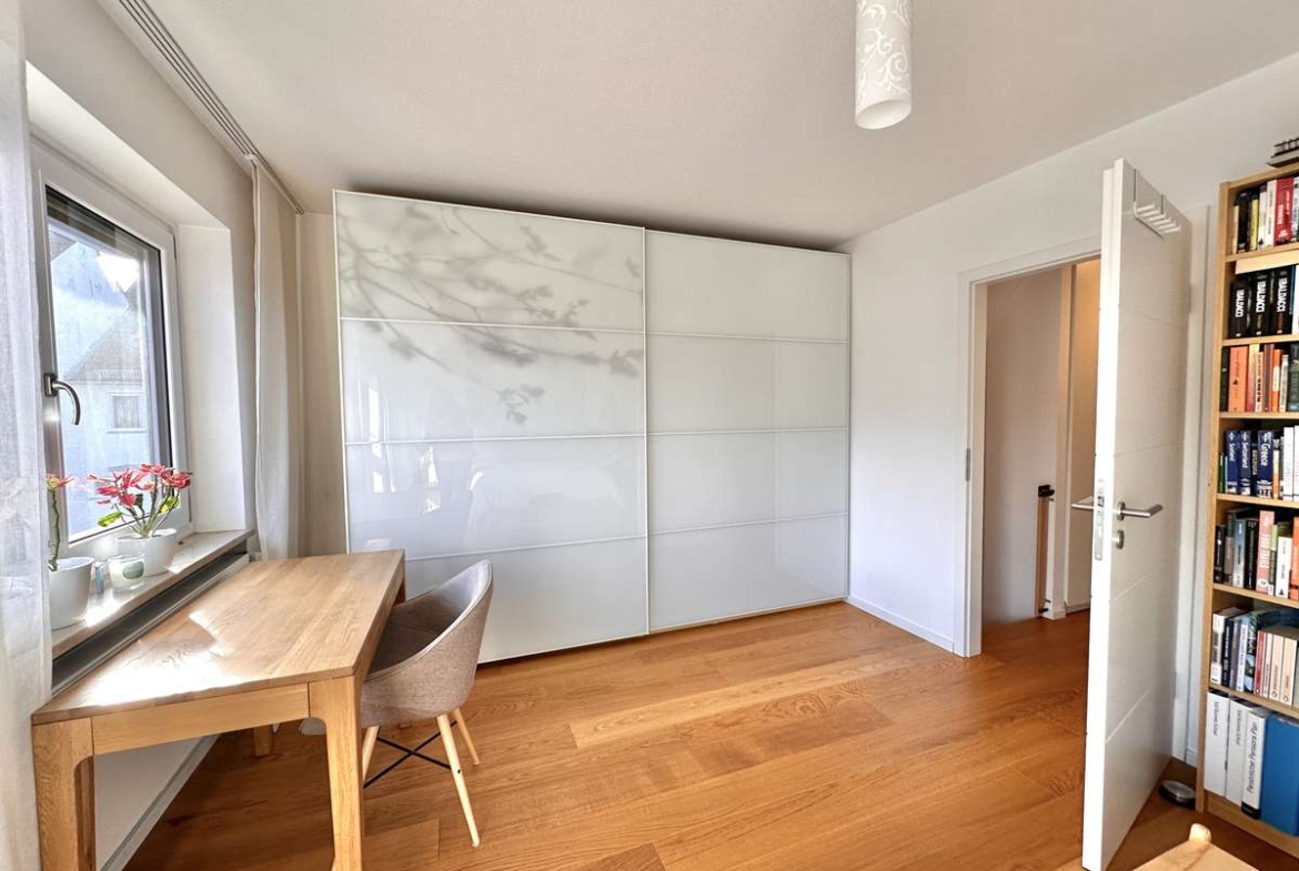 Das großzügige Wohnzimmer mit genügend Platz für eine Essecke ist mit hochwertigem Parkettboden ausgelegt und hat eine große Fensterfront. Von hier haben Sie Zugang zur sonnigen Südwestterrasse und dem direkt angrenzenden Garten