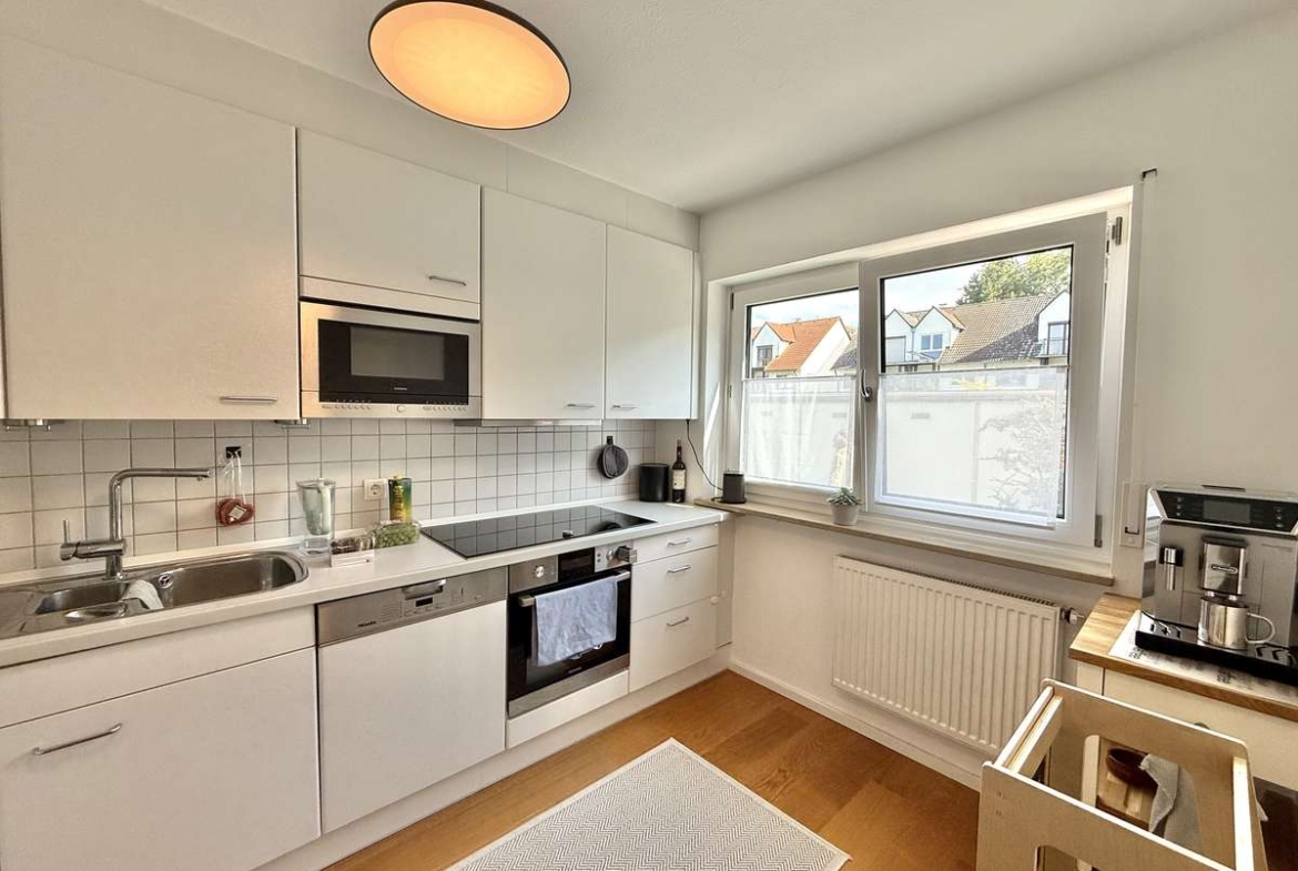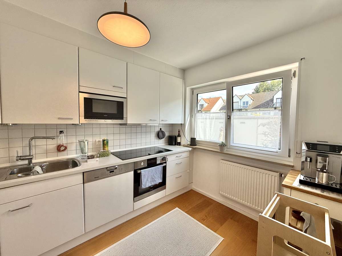 Die gemütliche Wohnküche mit großem Fenster ist seitens der Eigentümer mit einer schönen weißen EBK inkl. Markengeräten, bestehend aus einem Spülbecken, Cerankochfeld, Backofen