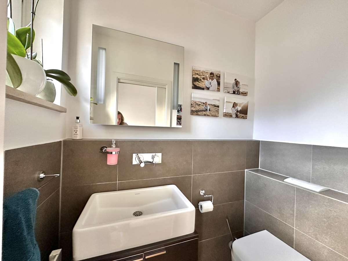 Erdgeschoss: Sie betreten das Haus durch den Eingangsbereich mit einem Abstellraum und Zugang zum Gäste-WC. Das Gäste-WC mit Fenster ist grau gefliest. Über die Diele gelangt man sowohl in die Küche, als auch in das Wohnzimmer.