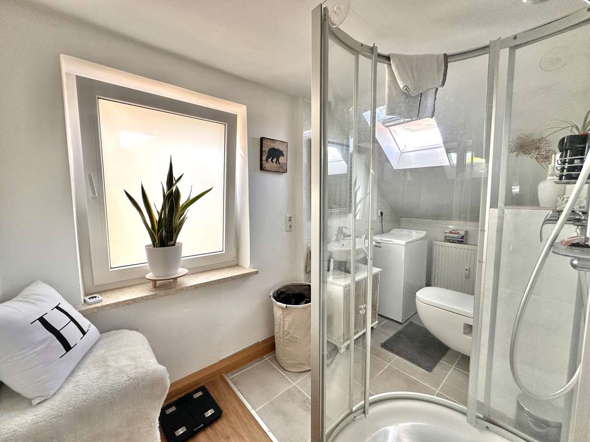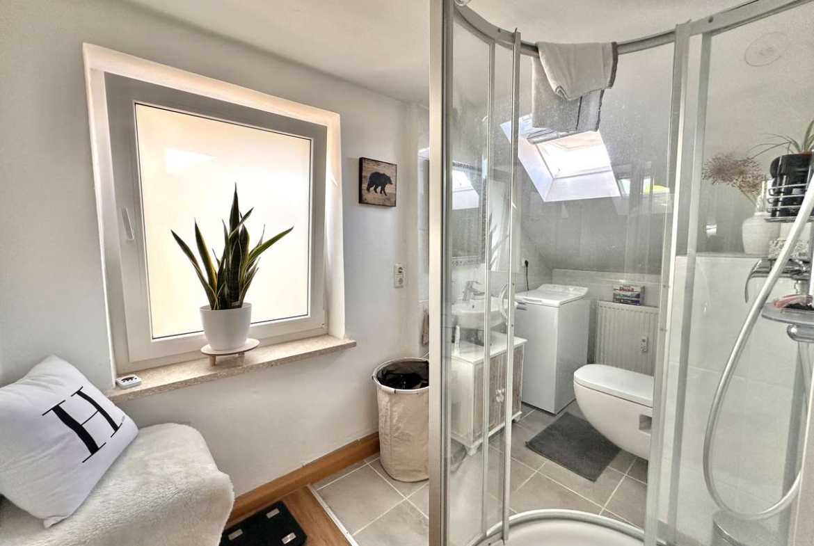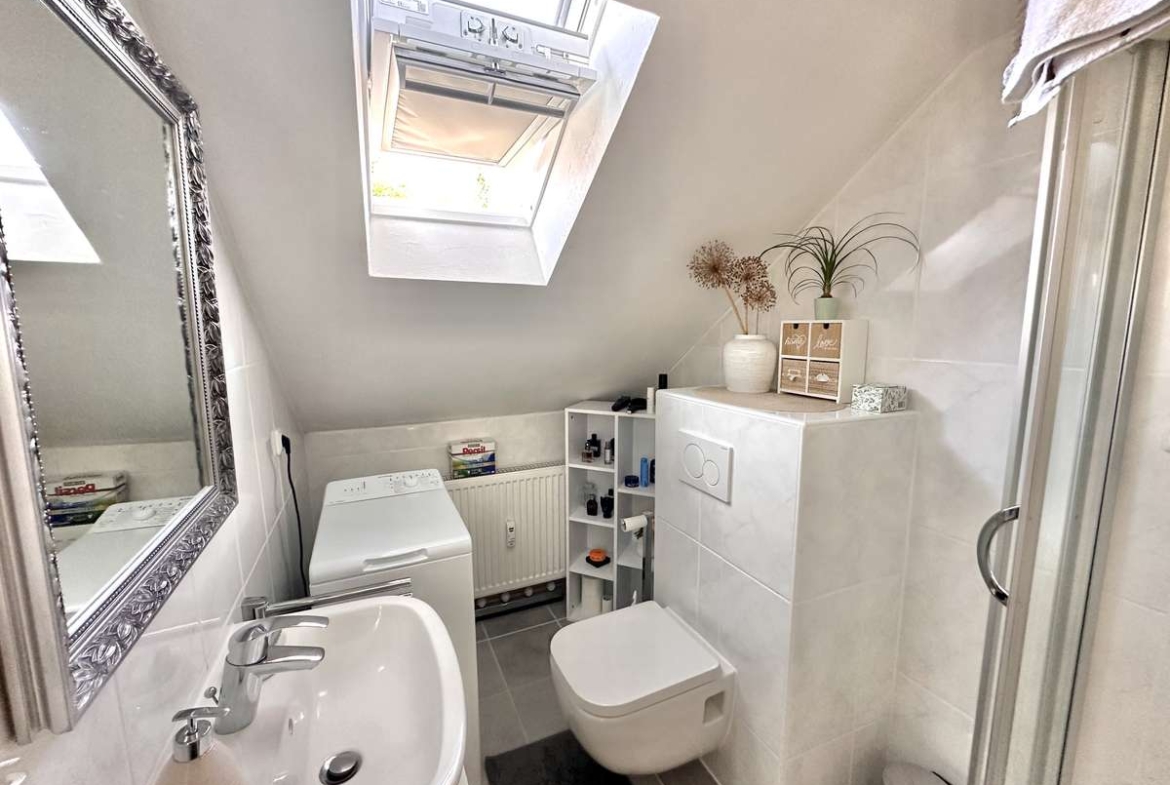 Das Tageslichtbad ist klassisch weiß gefliest und vermittelt ein frisches, gepflegtes Ambiente. Es verfügt über eine moderne Dusche, ein Waschbecken, ein WC sowie einen praktischen Anschluss für die Waschmaschine – alles, was man für den täglichen Komfort benötigt.