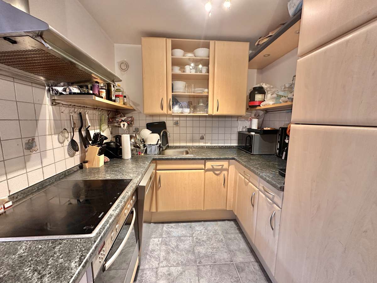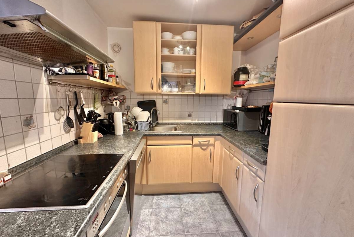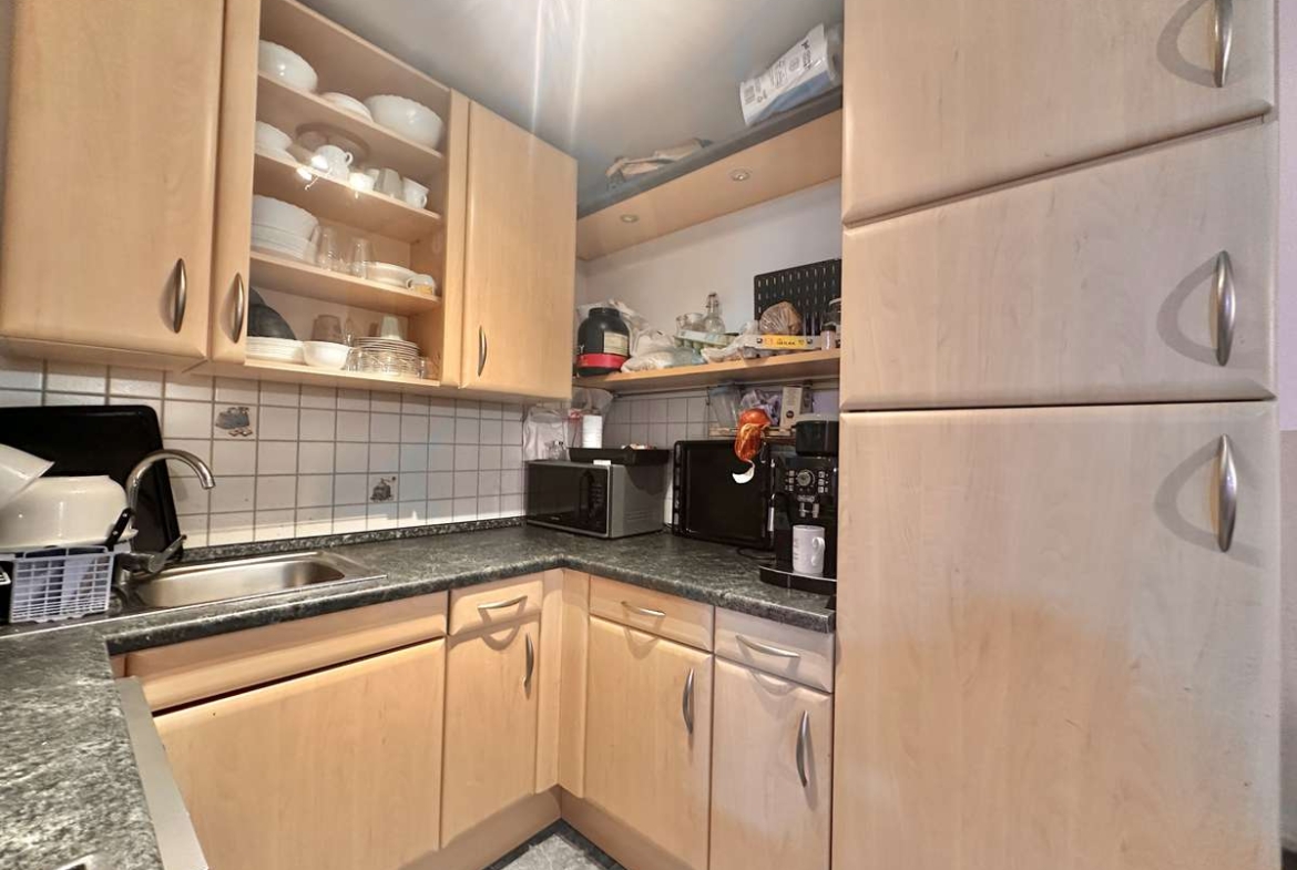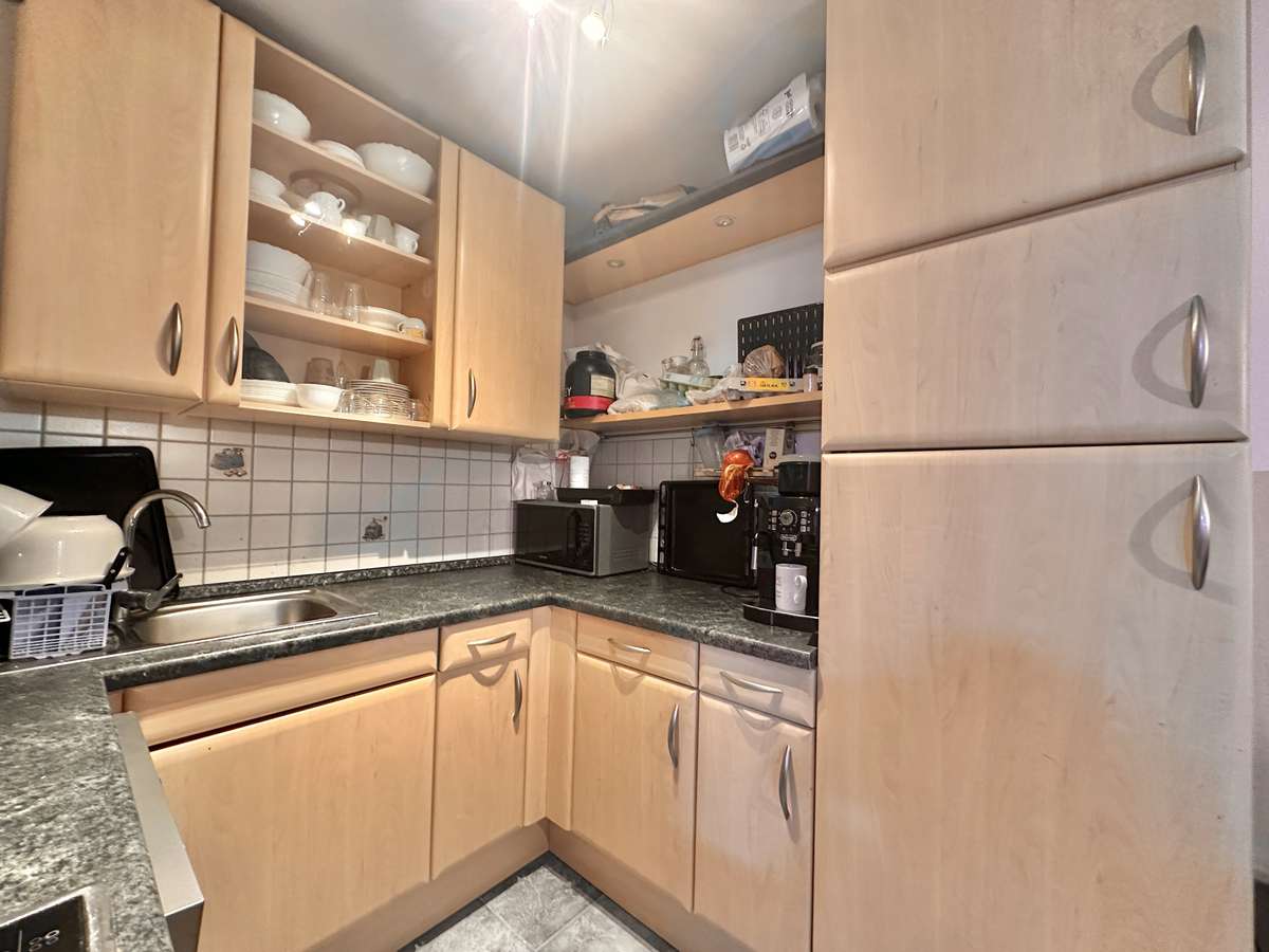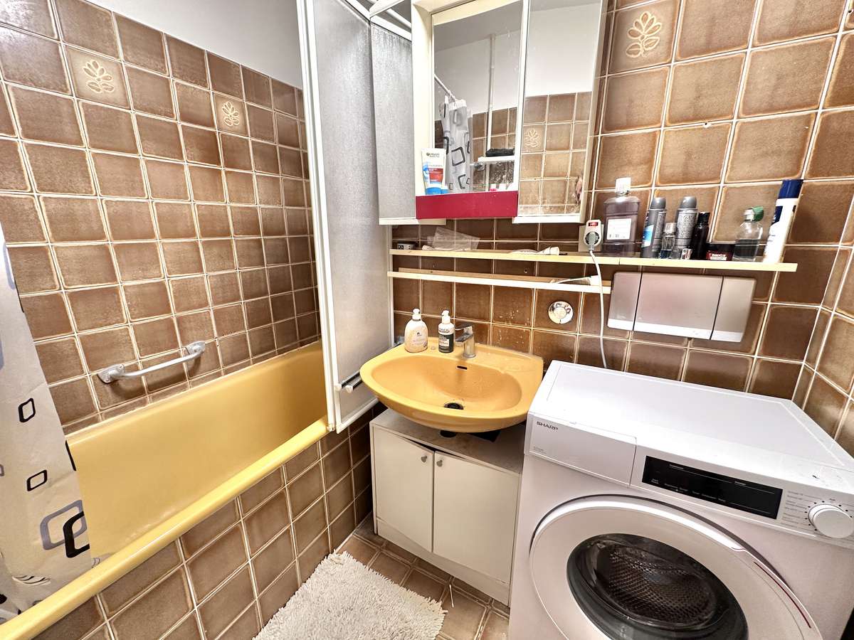Die helle und praktische Wohnung besticht durch ihre freundliche und angenehme Atmosphäre, die u.a. durch den schönen Parkettboden in Flur, Wohnzimmer und Schlafzimmer geschaffen wird. Die Sonne durchflutet das geräumige Wohnzimmer mit Licht und lädt auf dem großzügigem Süd-West-Balkon zum Entspannen ein. Die geräumige offene Küche, mit grauem Fliesenboden, ist mit einer Einbauküche (Mietereigentum) ausgestattet. Der Flur bietet ausreichend Platz für eine Garderobe. Direkt neben dem gemütlichen Schlafzimmer befindet sich das -braun geflieste- Badezimmer mit Waschmaschinenanschluss. Ergänzt wird der Komfort durch ein separates, weiß gefliestes WC. Das großzügige Kellerabteil bietet zusätzlichen praktischen Stauraum. Weiße Kunststofffenster sowie weiße Innentüren unterstreichen das gepflegte Gesamtbild dieser charmanten Immobilie.
