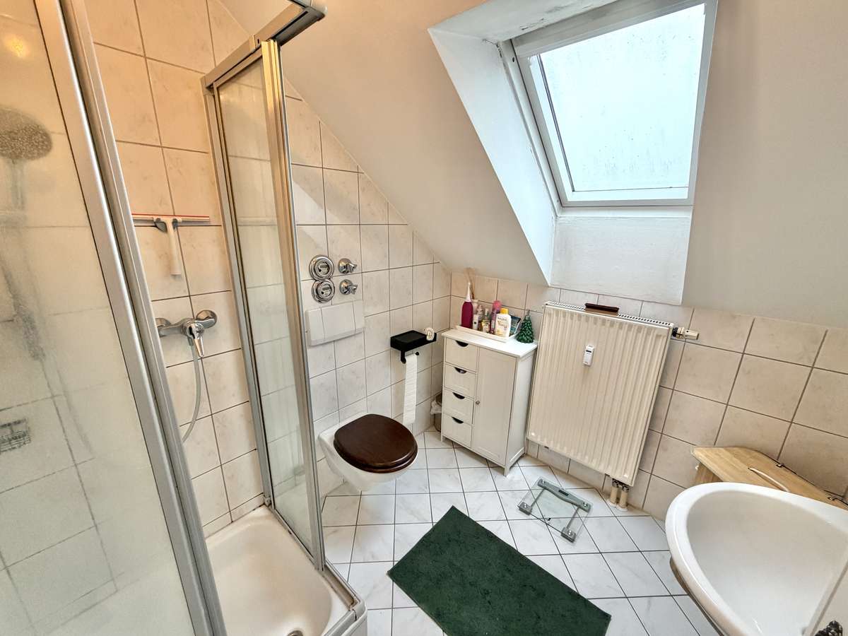 Beim Betreten der Wohnung empfängt Sie ein heller, einladender Eingangsbereich, der sofort ein Gefühl von Offenheit vermittelt. Das helle Tageslichtbad ist mit einem Fenster, weißen Fliesen ausgestattet und verfügt über Dusche, WC und Waschbecken.
