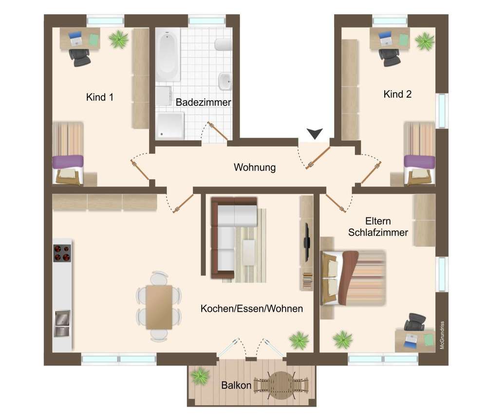 Die drei Schlafzimmer sind großzügig geschnitten und bieten viel Flexibilität – sie lassen sich je nach Bedarf als gemütliche Rückzugsorte, Arbeitszimmer oder kinderfreundliche Spiel- und Schlafbereiche nutzen.