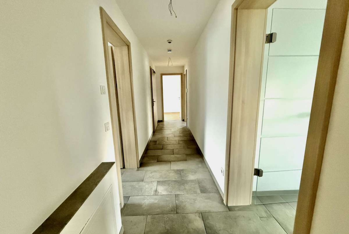 Die weißen Kunststofffenster sind dreifach verglast und mit elektrischen Rollläden ausgestattet. Zusätzlich sorgen dezente Wandlüfter in mehreren Räumen für eine kontinuierliche und energieeffiziente Belüftung.