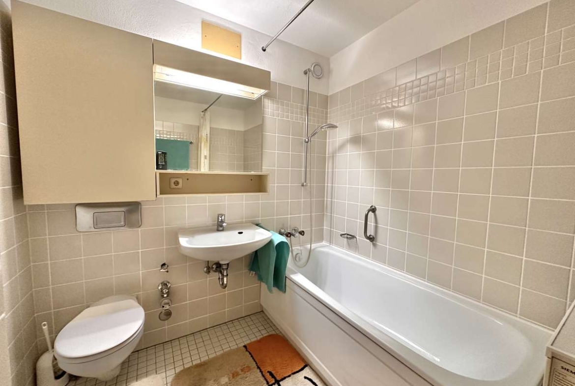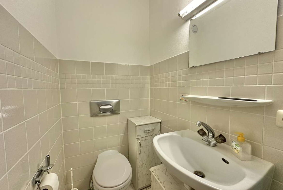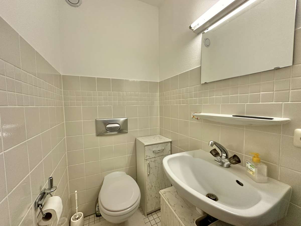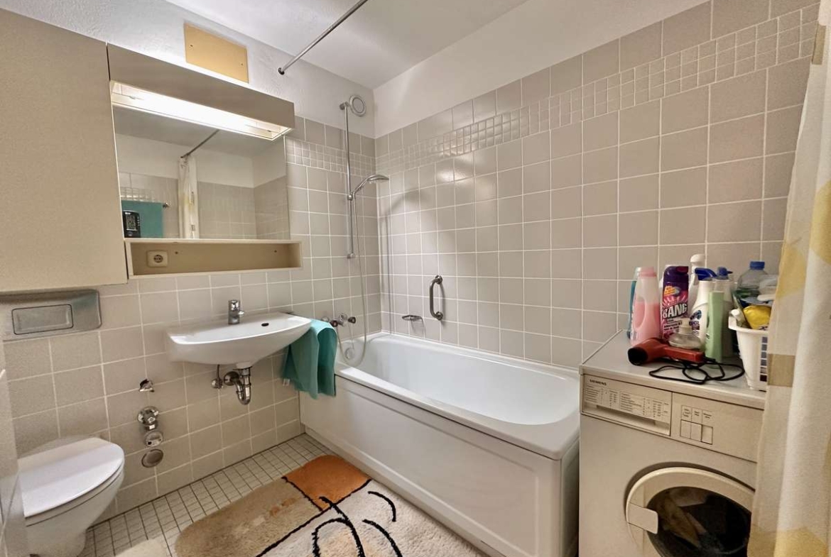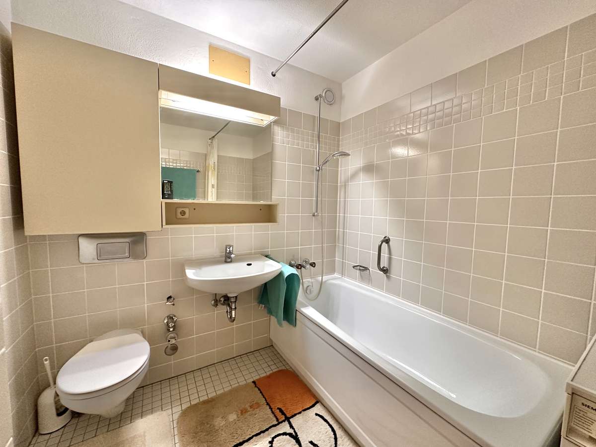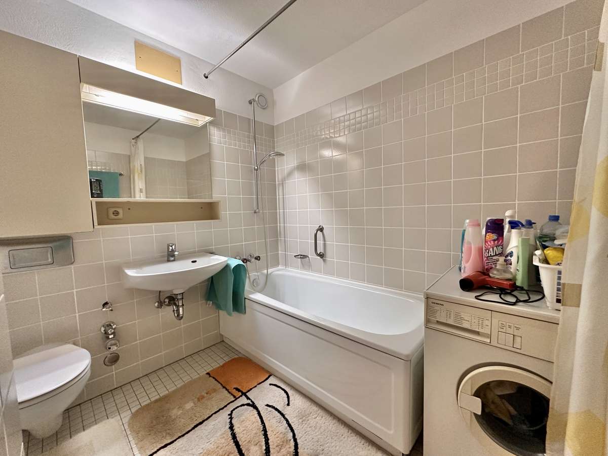 Das Badezimmer ist hell gestaltet – mit beigen Wandfliesen und einem weiß gefliesten Boden. Eine Badewanne lädt zum Entspannen ein, und ein Waschmaschinenanschluss ist vorhanden. Ergänzt wird der Komfort durch ein separates, hell gefliestes Gäste-WC.