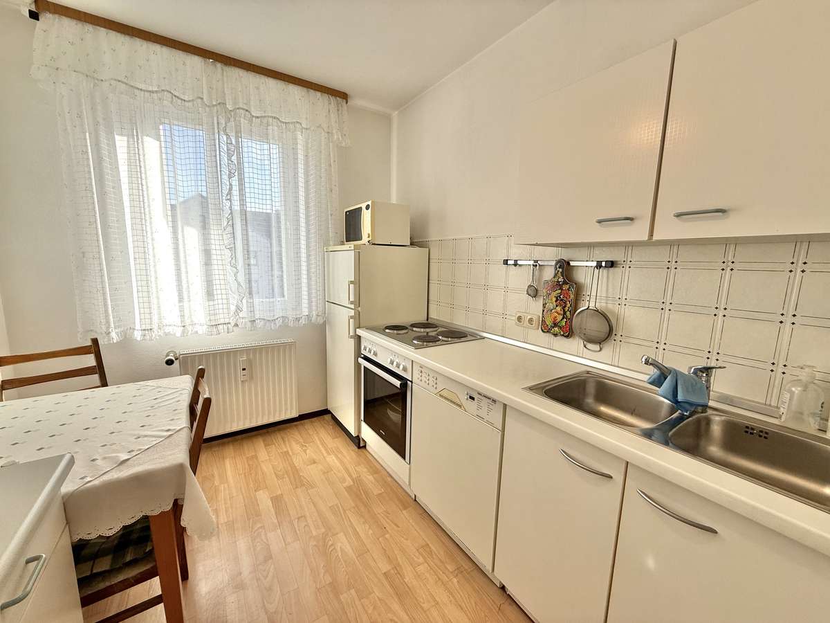 Die Küche ist mit einem pflegeleichten PVC-Boden in Holzoptik ausgestattet. Sie verfügt über eine praktische Küchenzeile mit Herd, Backofen und Spüle und ist bereits im Kaufpreis enthalten. Ein kleiner Essplatz lässt sich hier problemlos integrieren.