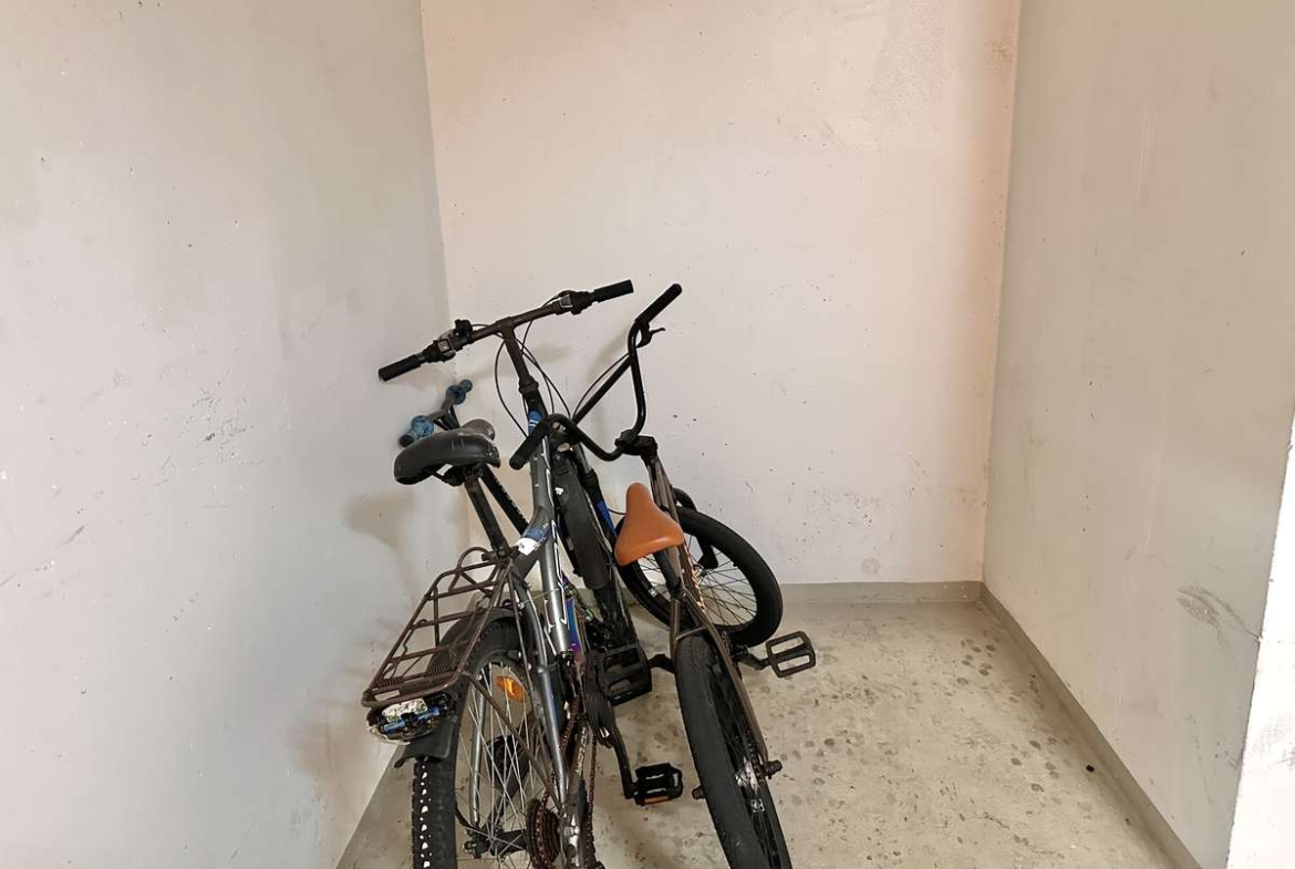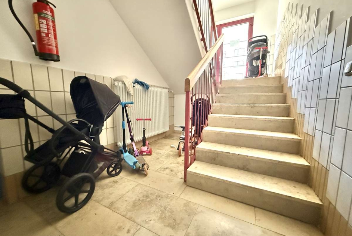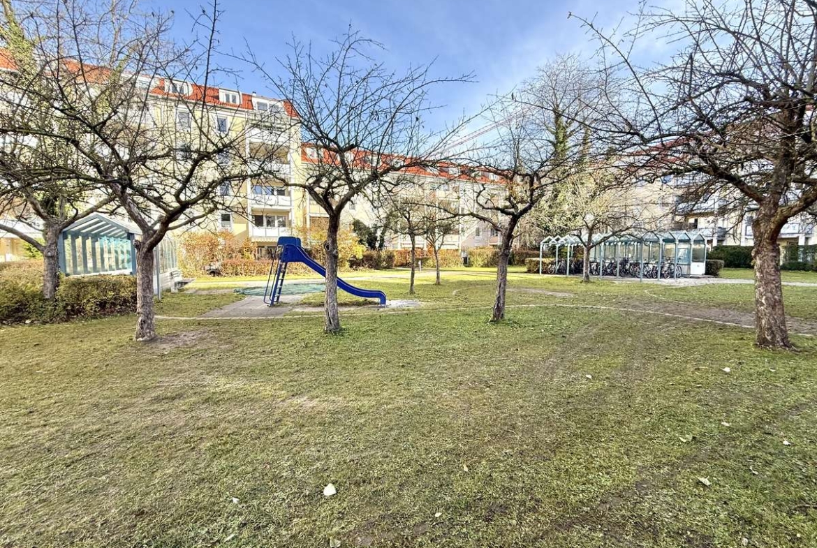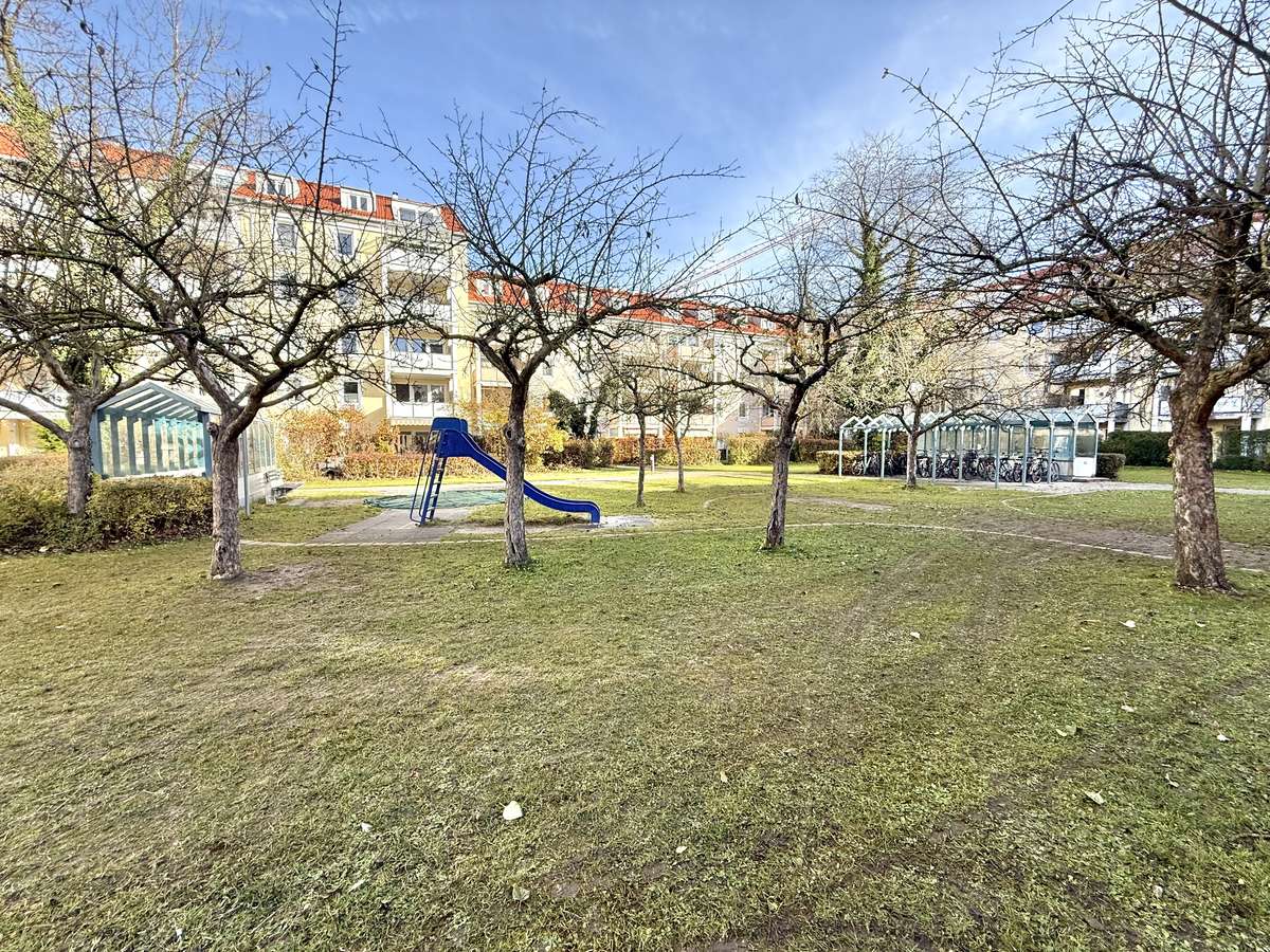 Im begrünten Innenhof befinden sich ein Kinderspielplatz mit Rutsche und Sandkasten sowie überdachte Fahrradständer – ein angenehmer Bereich für Kinder zum Spielen und für Erwachsene zum Entspannen.