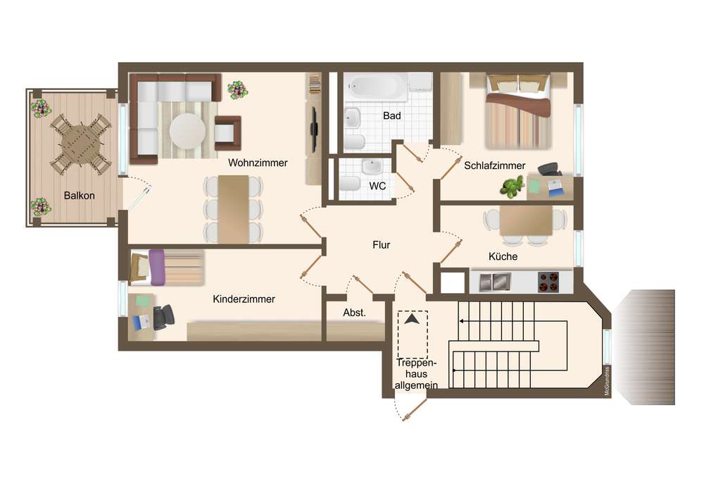 Diese einladende 3-Zi.-Whg mit sonnigem Südwestbalkon und ca. 78m² Wohnfläche liegt im 3.OG eines gepflegten Mehrfamilienhauses, Bj. 1986