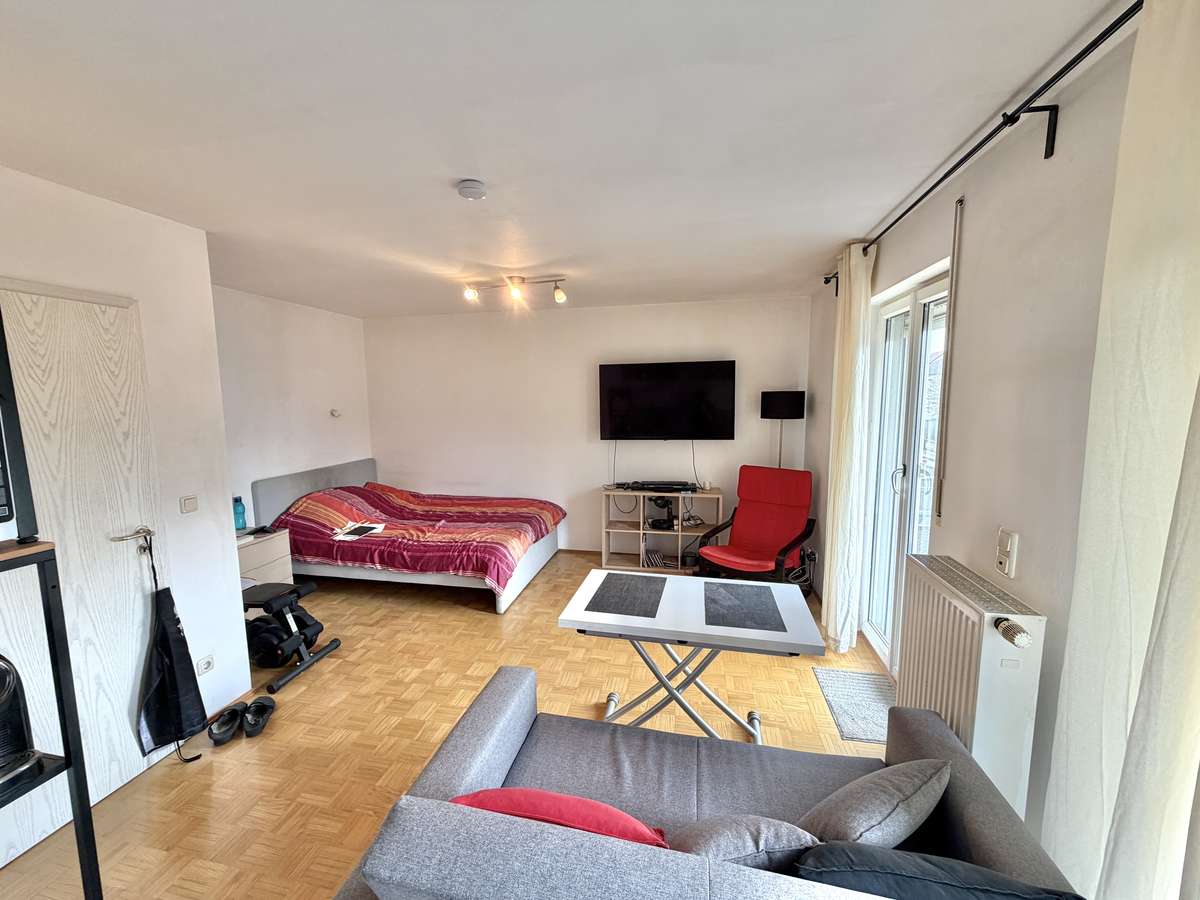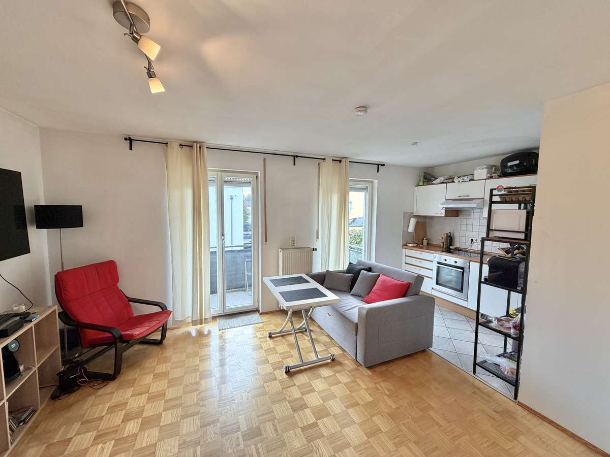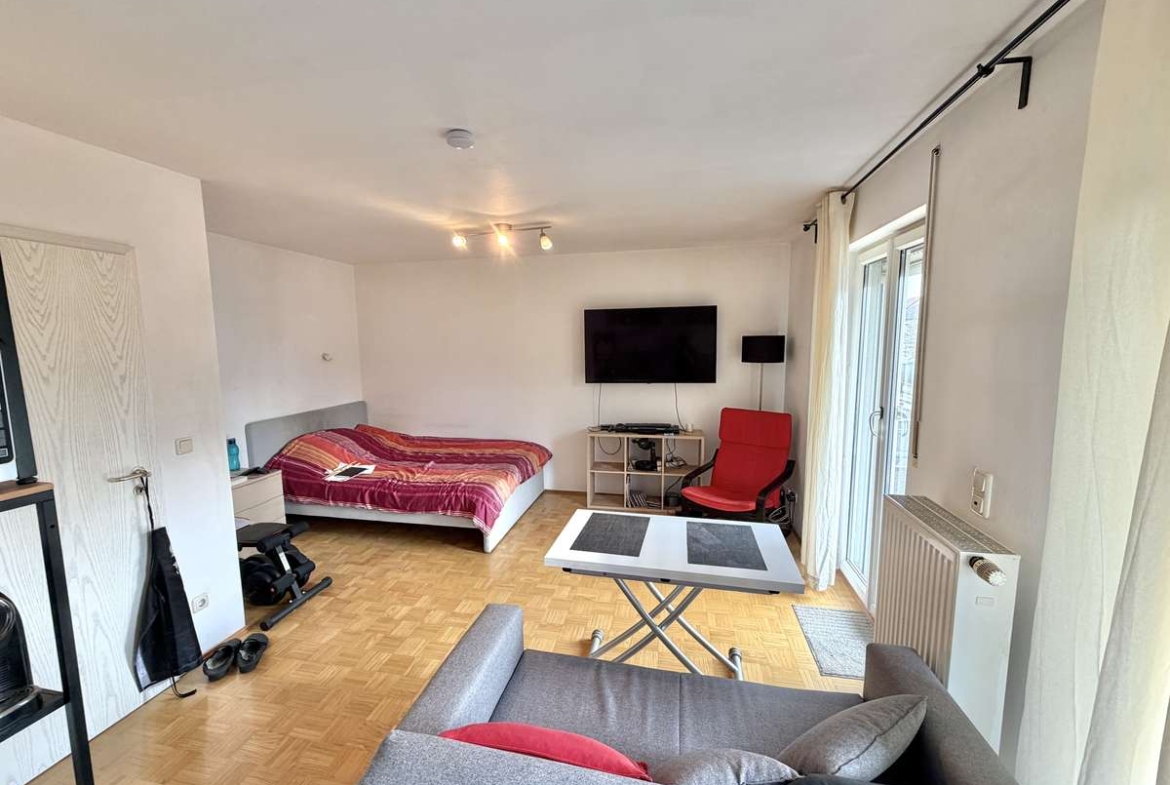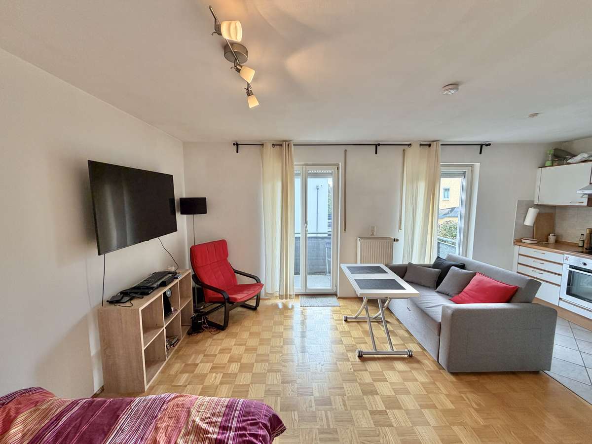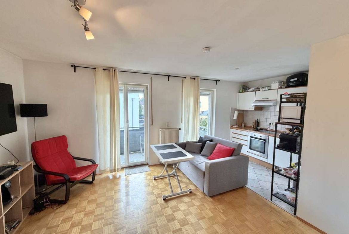 Der großzügige Wohn- und Schlafbereich ist mit hochwertigem Parkettboden ausgestattet und bietet direkten Zugang zum herrlichen Südbalkon, der sonnige Stunden im Freien verspricht. Die offene, weiß geflieste Küche ist mit einer gepflegten Einbauküche samt Elektrogeräten ausgestattet, die der Eigentümer dem neuen Mieter kostenfrei überlässt.