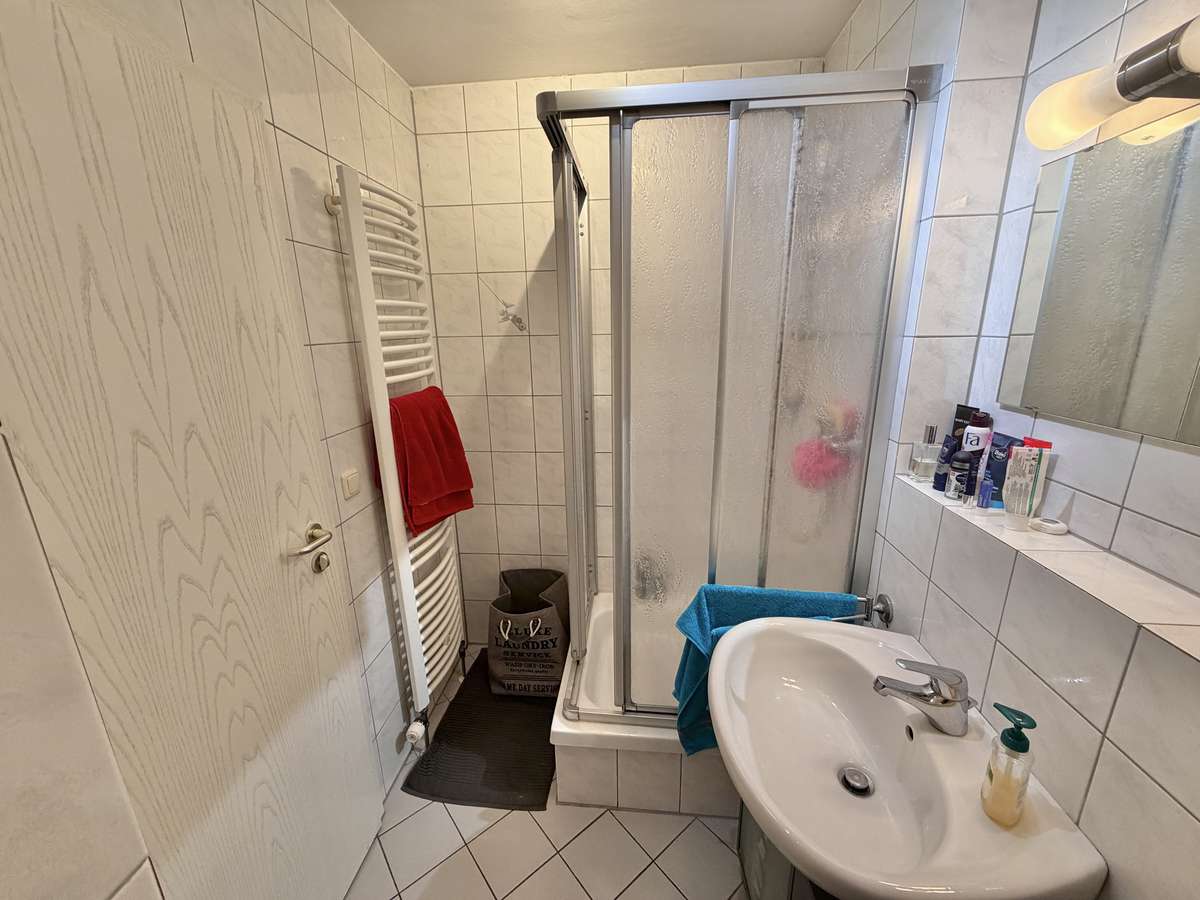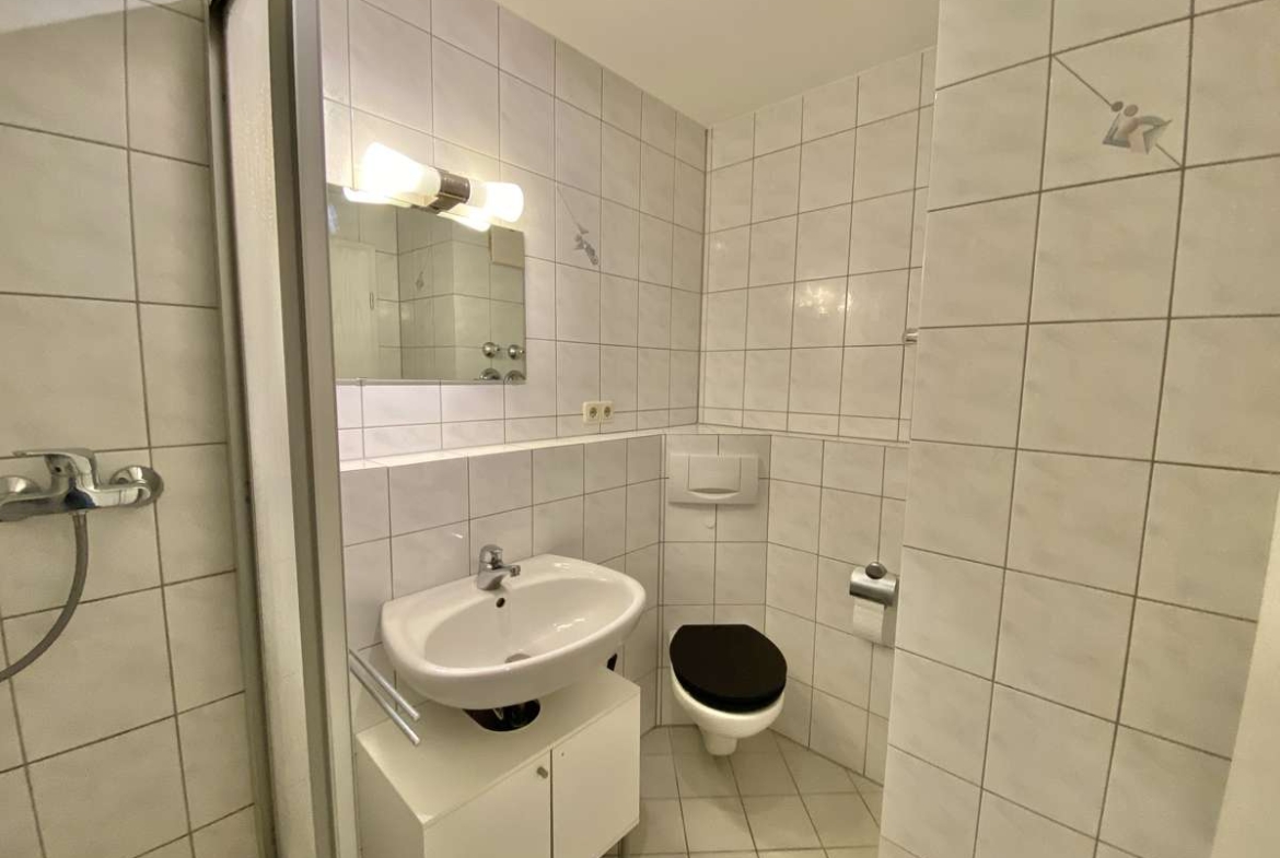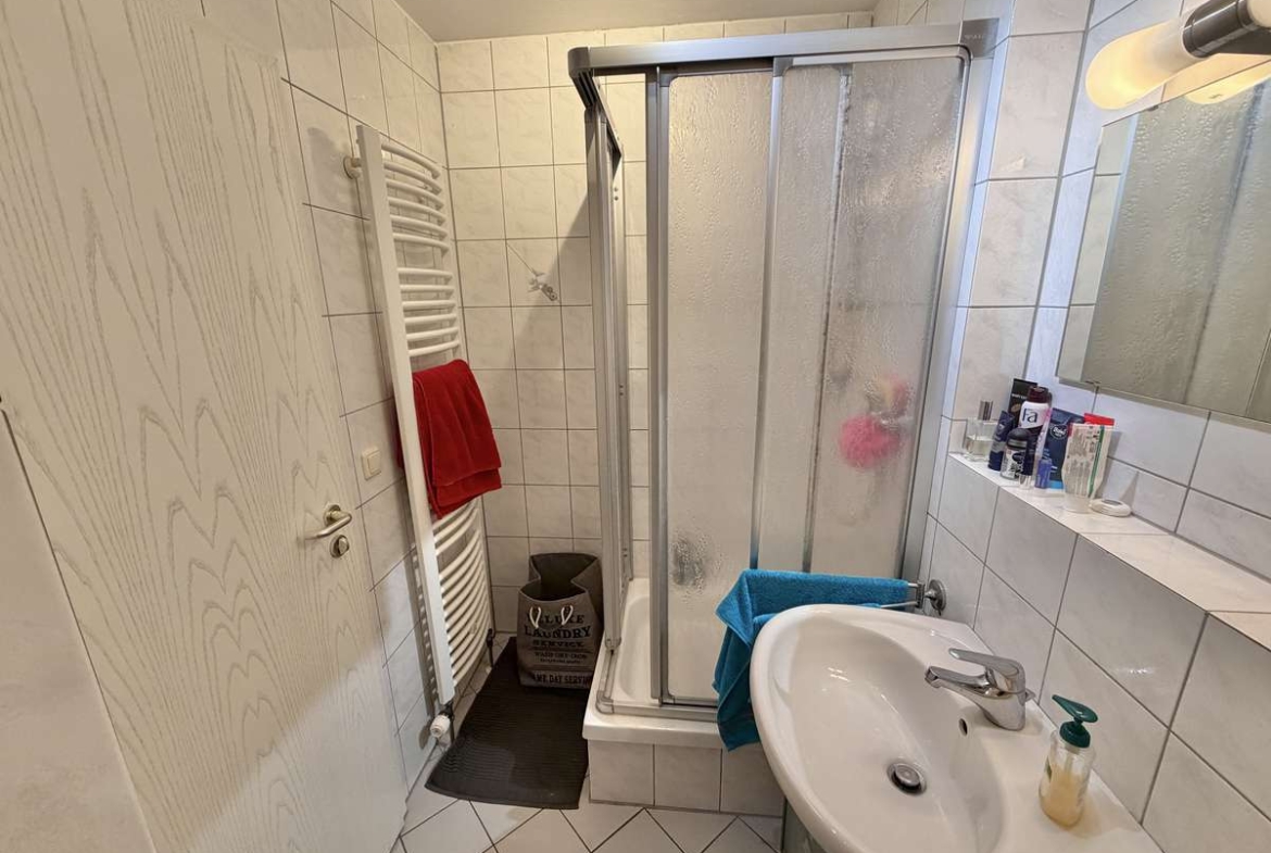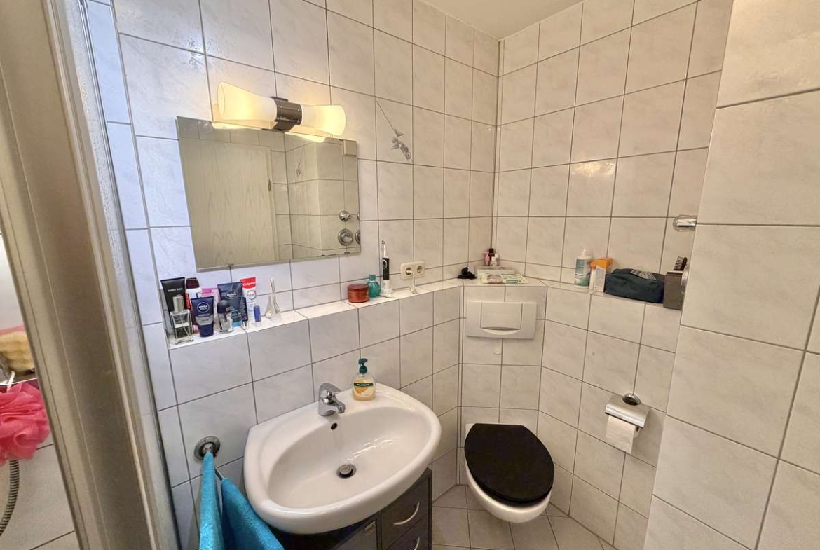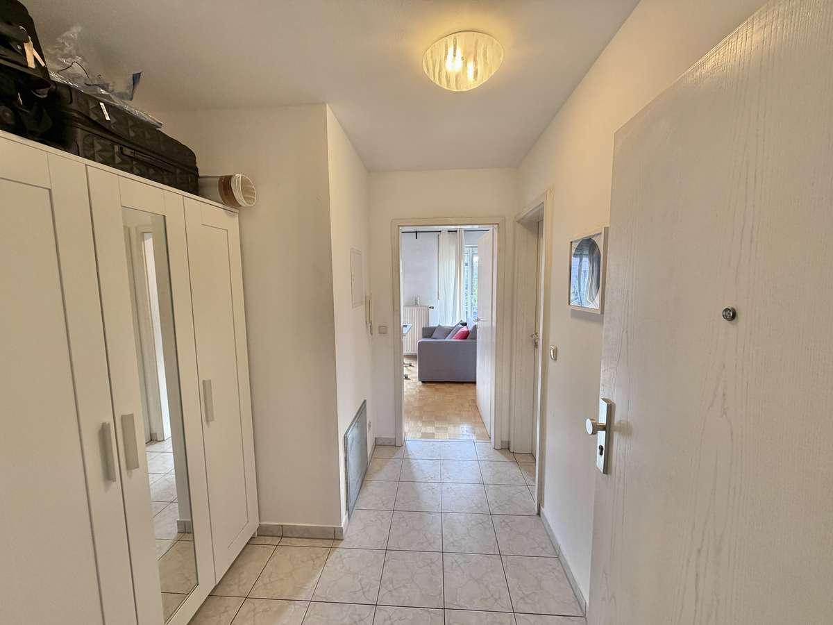 Im Flur befindet sich eine praktische Nische, die sich ideal als Garderobe nutzen lässt. Das moderne, weiß geflieste Badezimmer ist mit Dusche, Waschbecken und WC ausgestattet. Ein Waschmaschinenanschluss steht im separaten Waschkeller zur Verfügung.