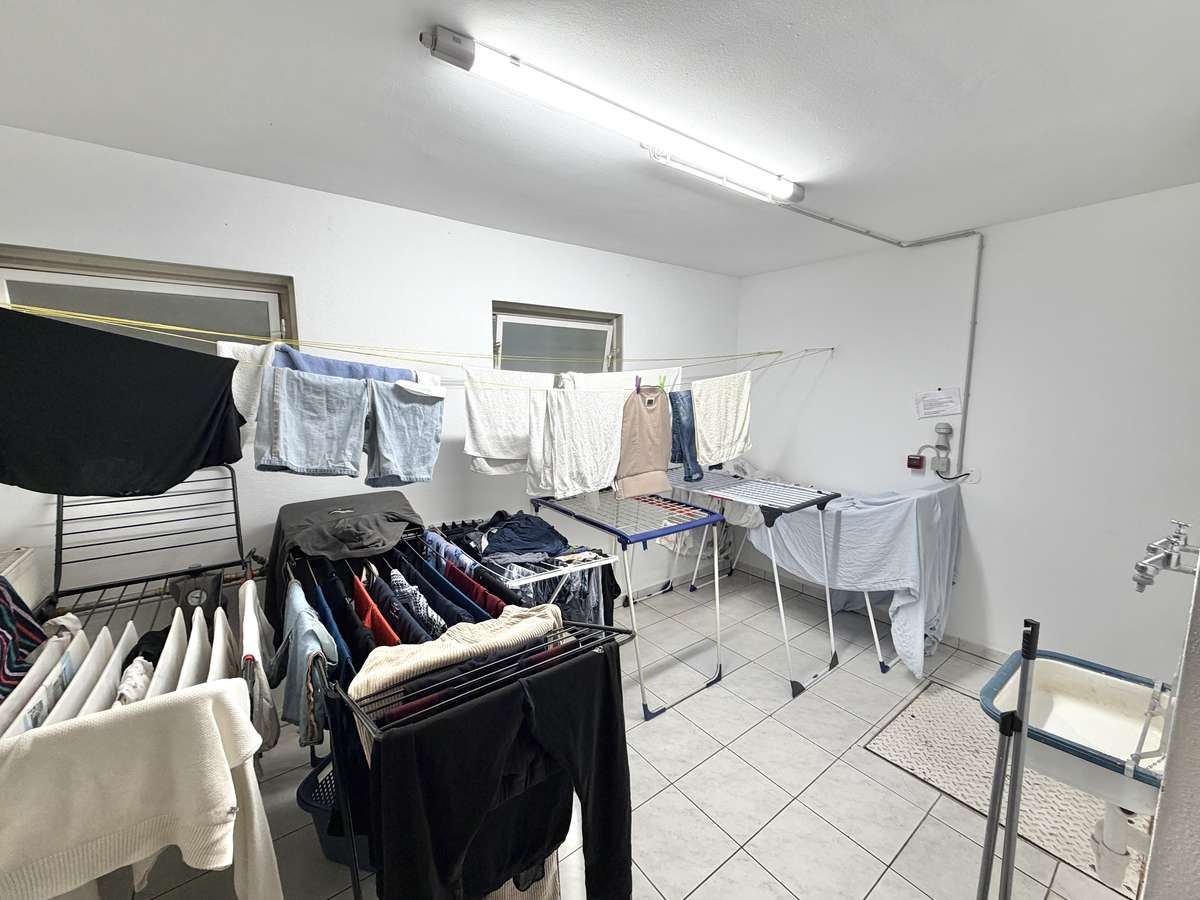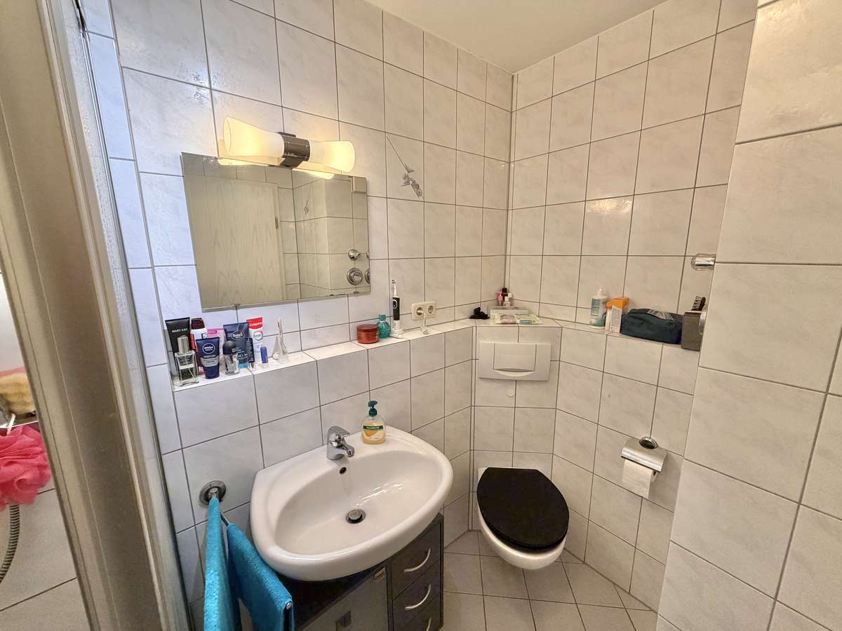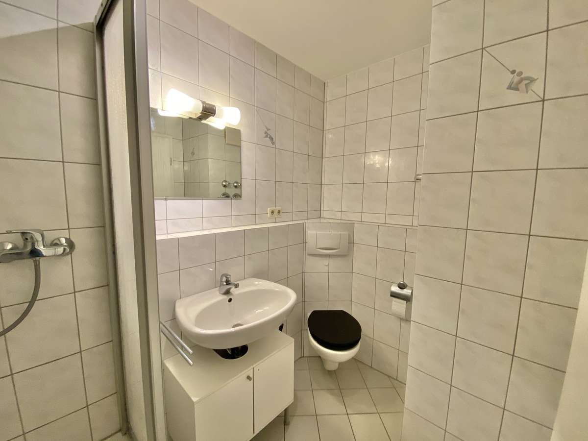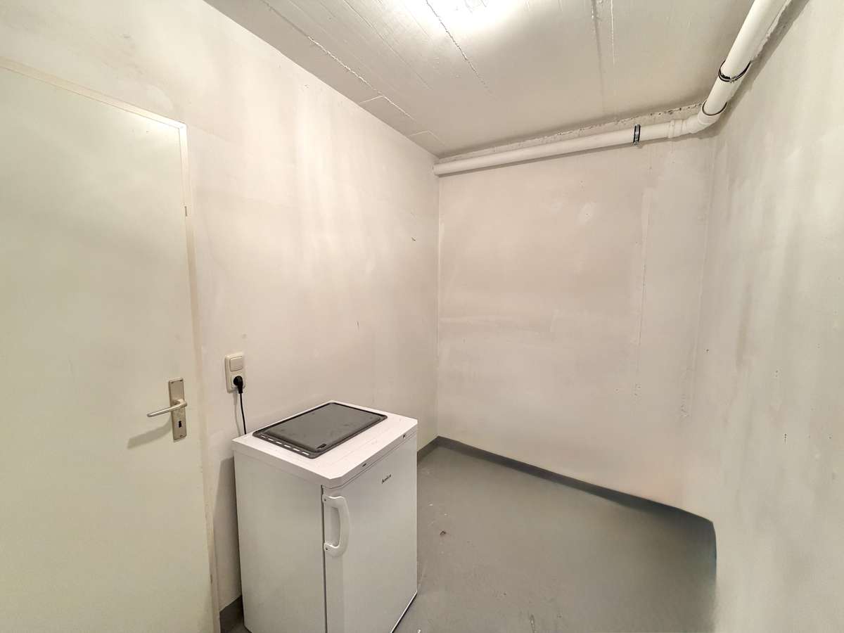 Im Flur befindet sich eine praktische Nische, die sich ideal als Garderobe nutzen lässt. Das moderne, weiß geflieste Badezimmer ist mit Dusche, Waschbecken und WC ausgestattet. Ein Waschmaschinenanschluss steht im separaten Waschkeller zur Verfügung.
