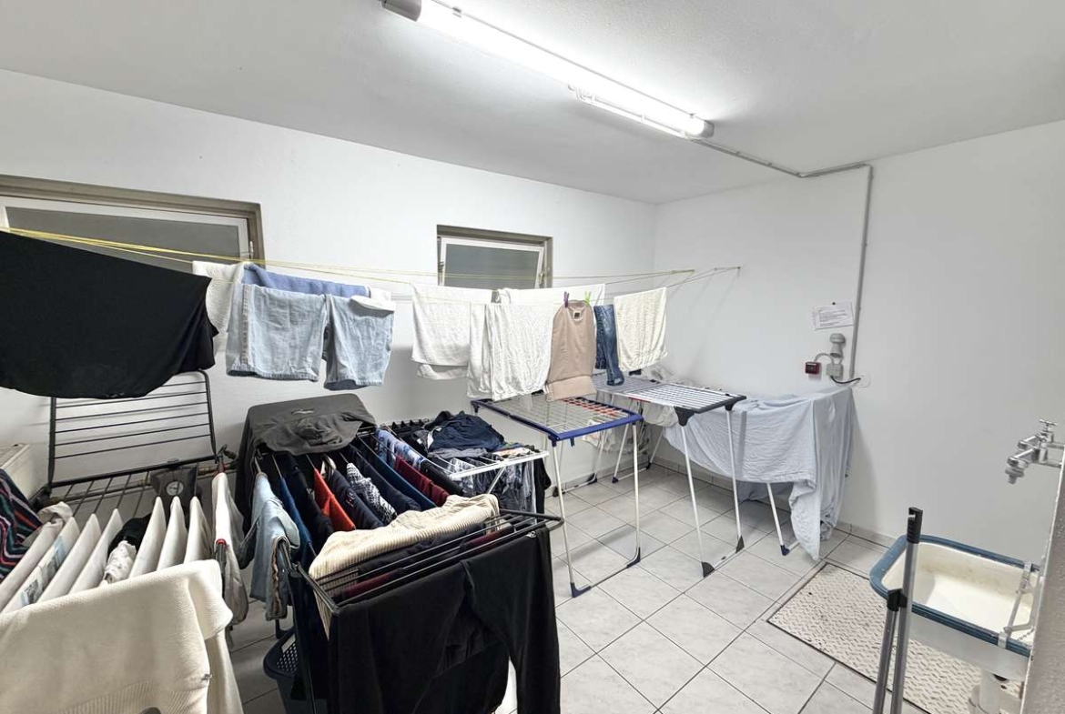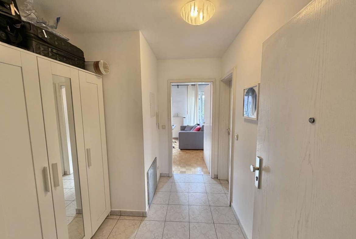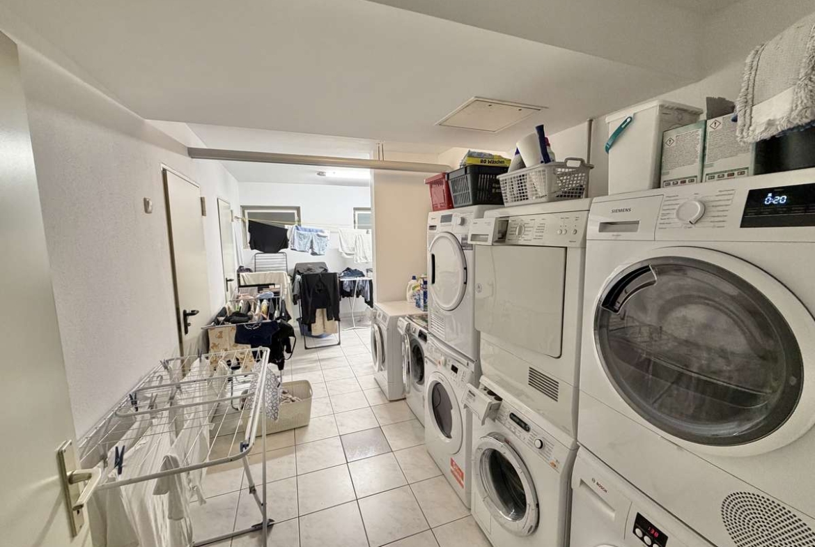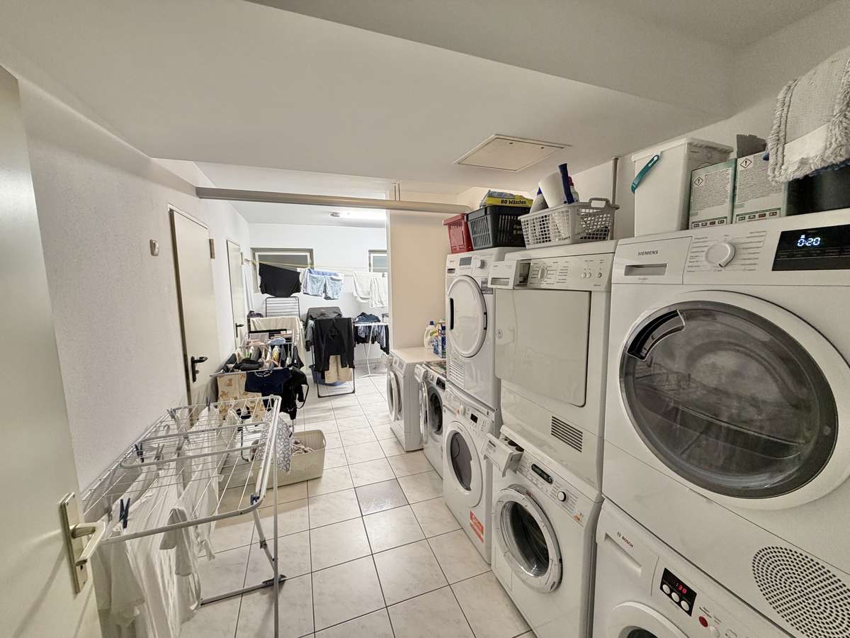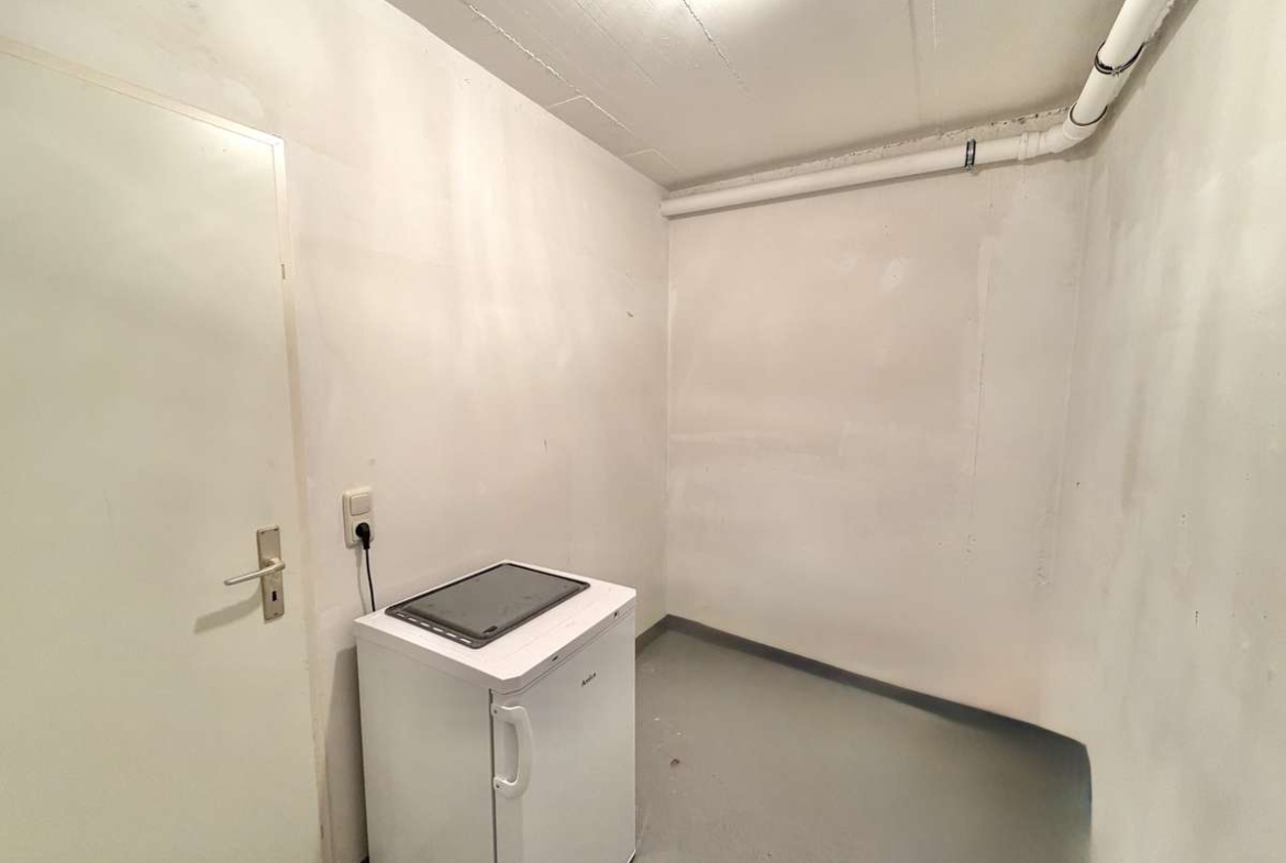 Im Flur befindet sich eine praktische Nische, die sich ideal als Garderobe nutzen lässt. Das moderne, weiß geflieste Badezimmer ist mit Dusche, Waschbecken und WC ausgestattet. Ein Waschmaschinenanschluss steht im separaten Waschkeller zur Verfügung.