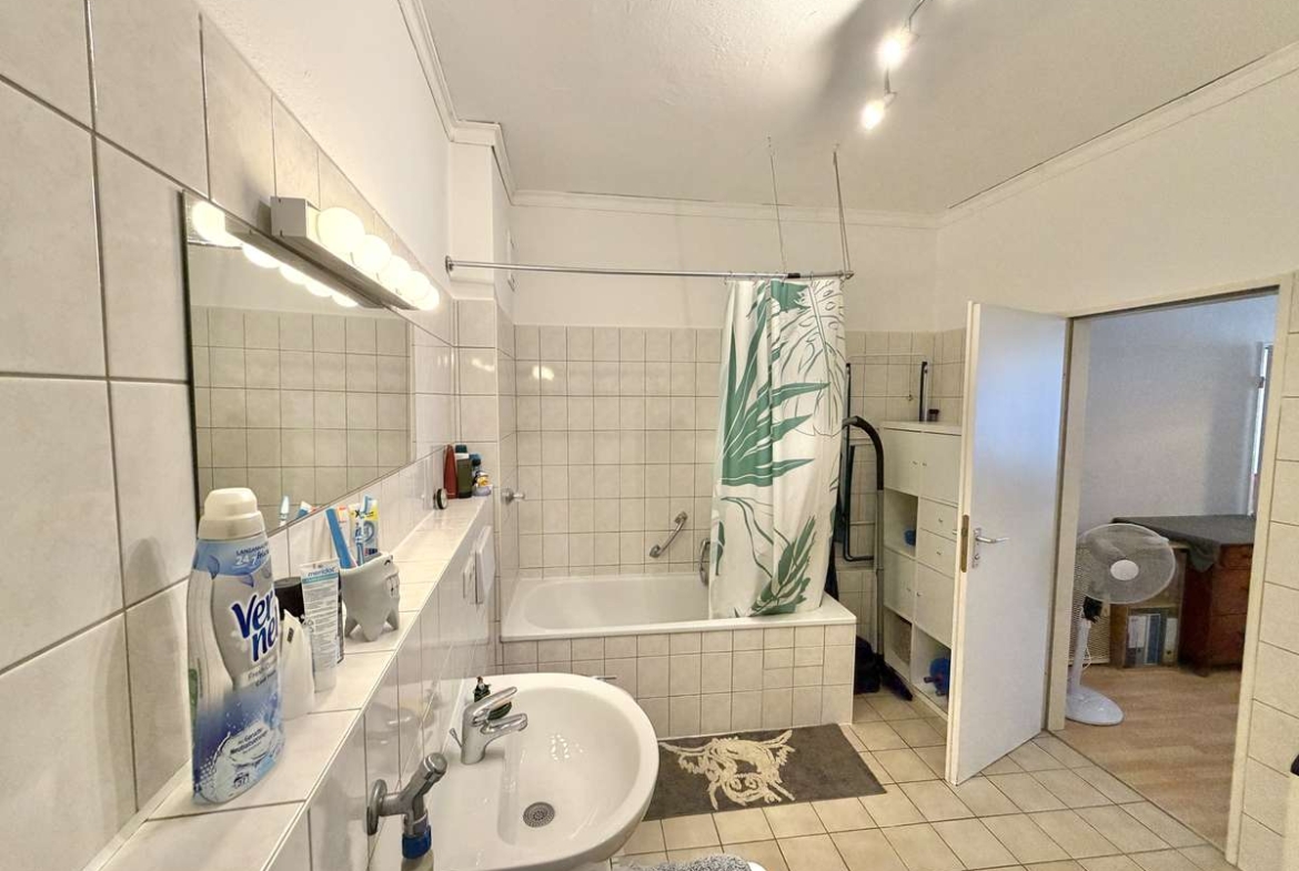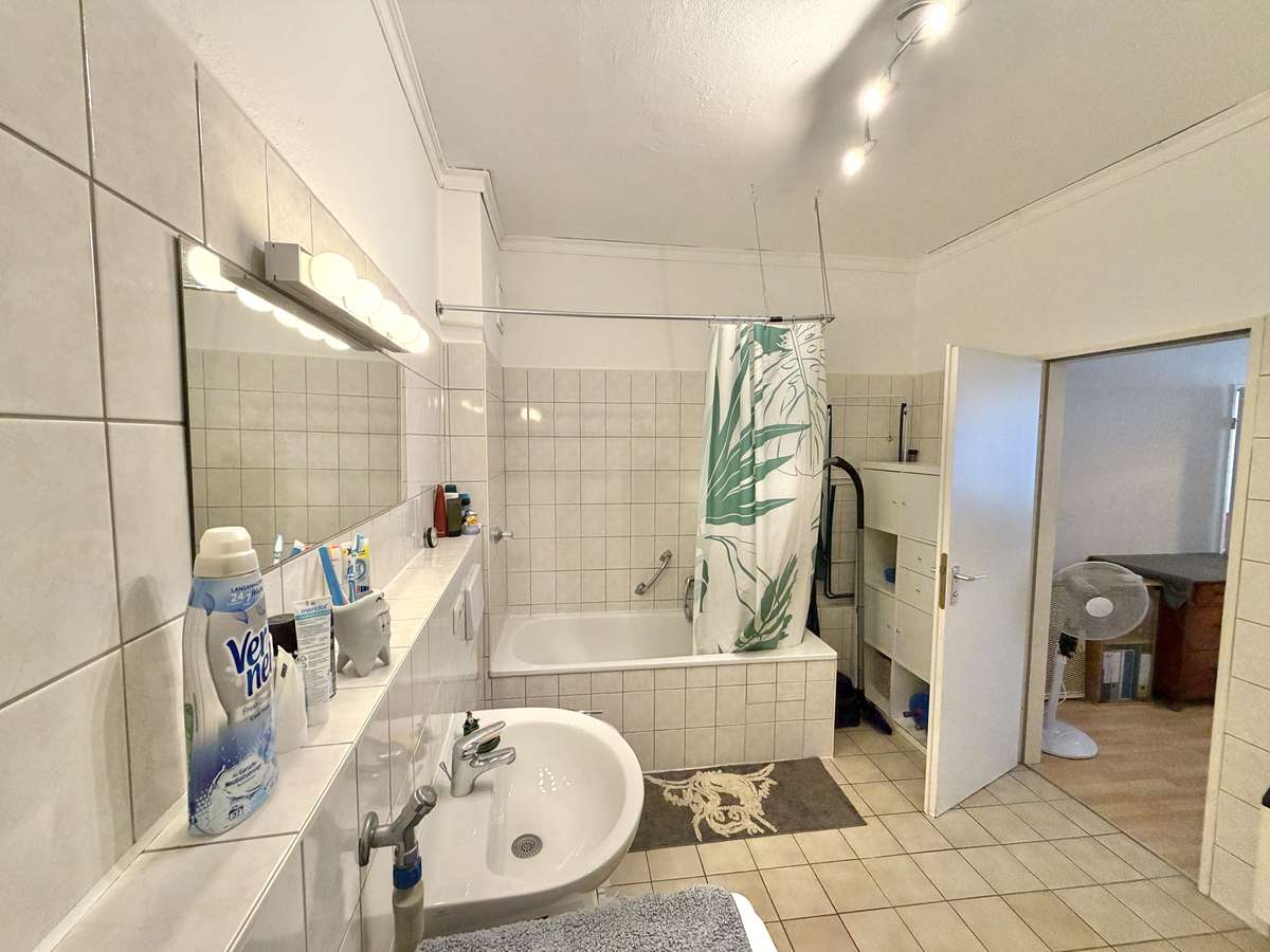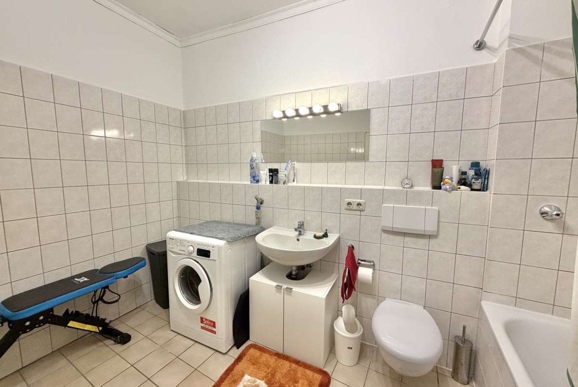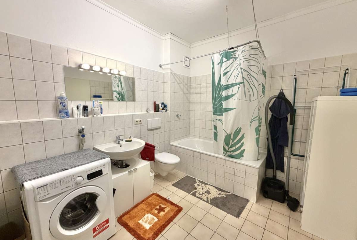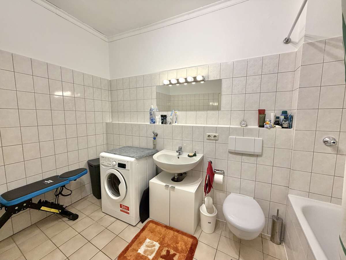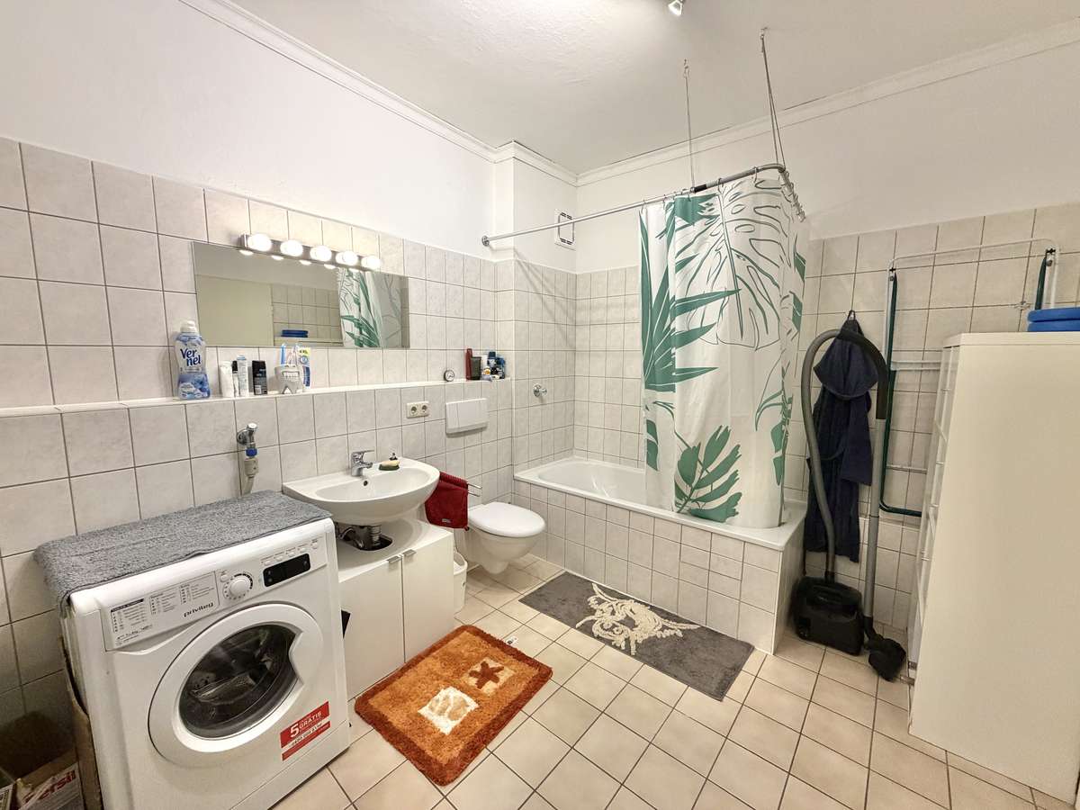 Vom Schlafzimmer aus besteht der Zugang zum weiß gefliesten Badezimmer, das mit Badewanne, WC, Waschbecken, Spiegel und einem Waschmaschinenanschluss ausgestattet ist.