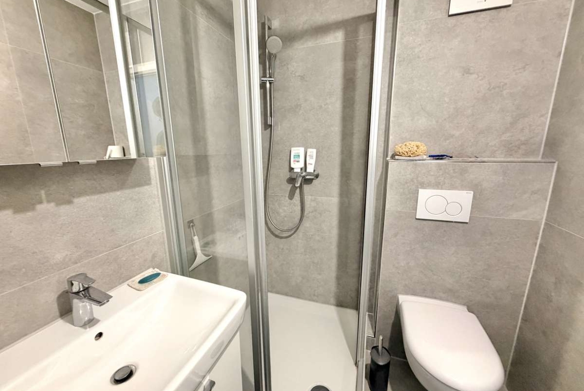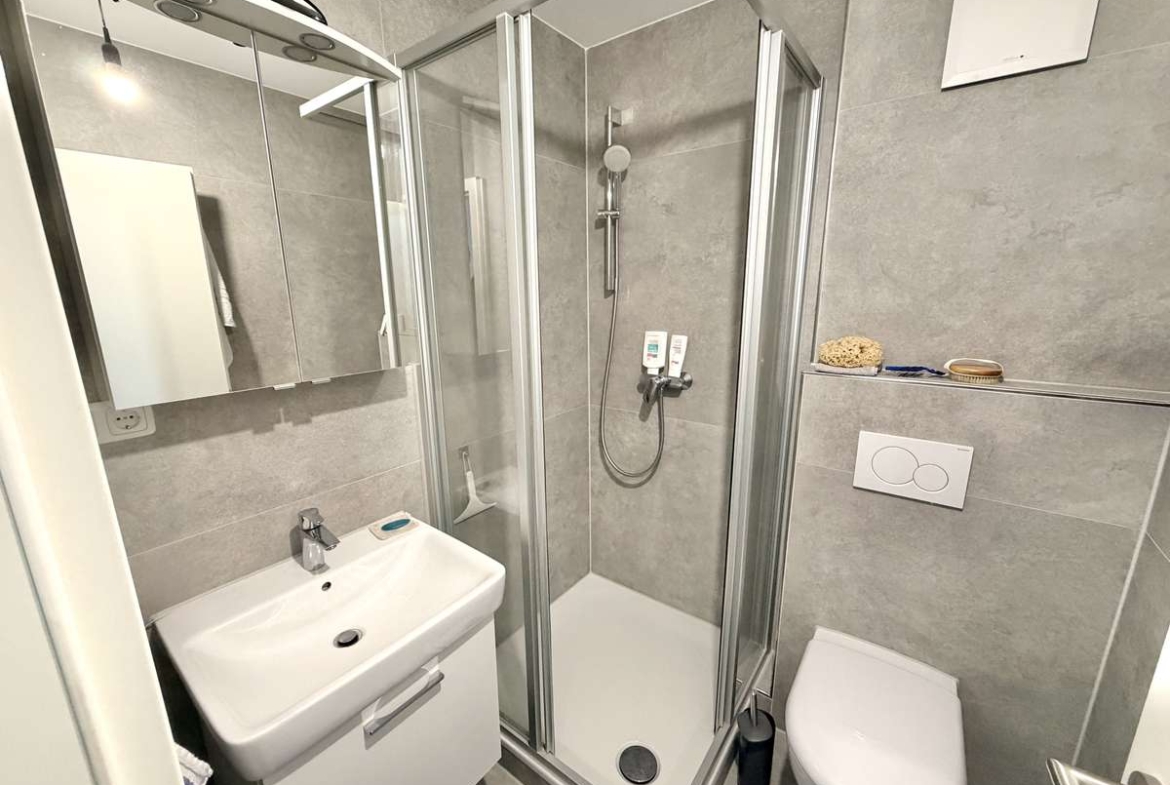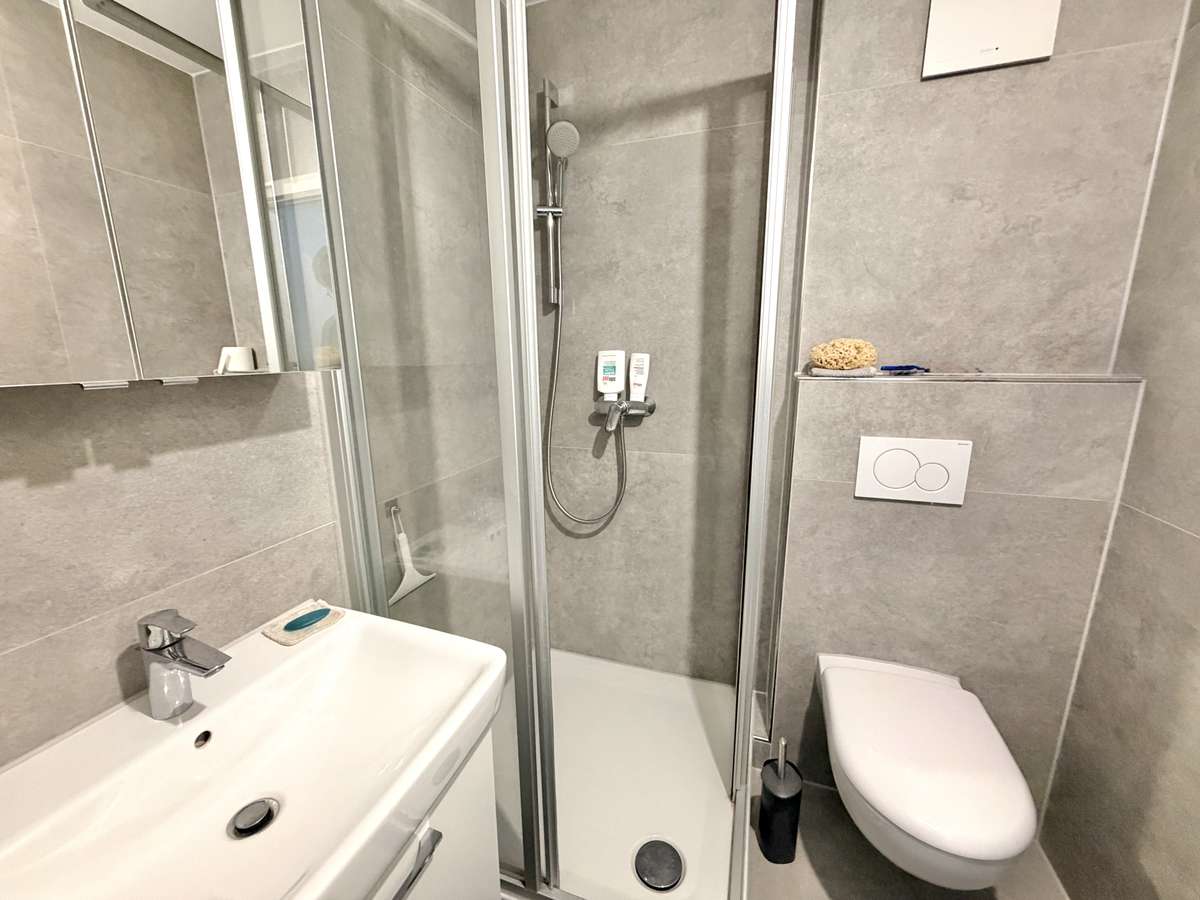 Das zeitlos gestaltete Badezimmer ist ebenfalls in stilvollem Grau gefliest und mit einer Dusche, WC, Waschbecken sowie einer praktischen Handtuchheizung ausgestattet. Hochwertige Materialien und eine gepflegte Optik runden den Raum angenehm ab.