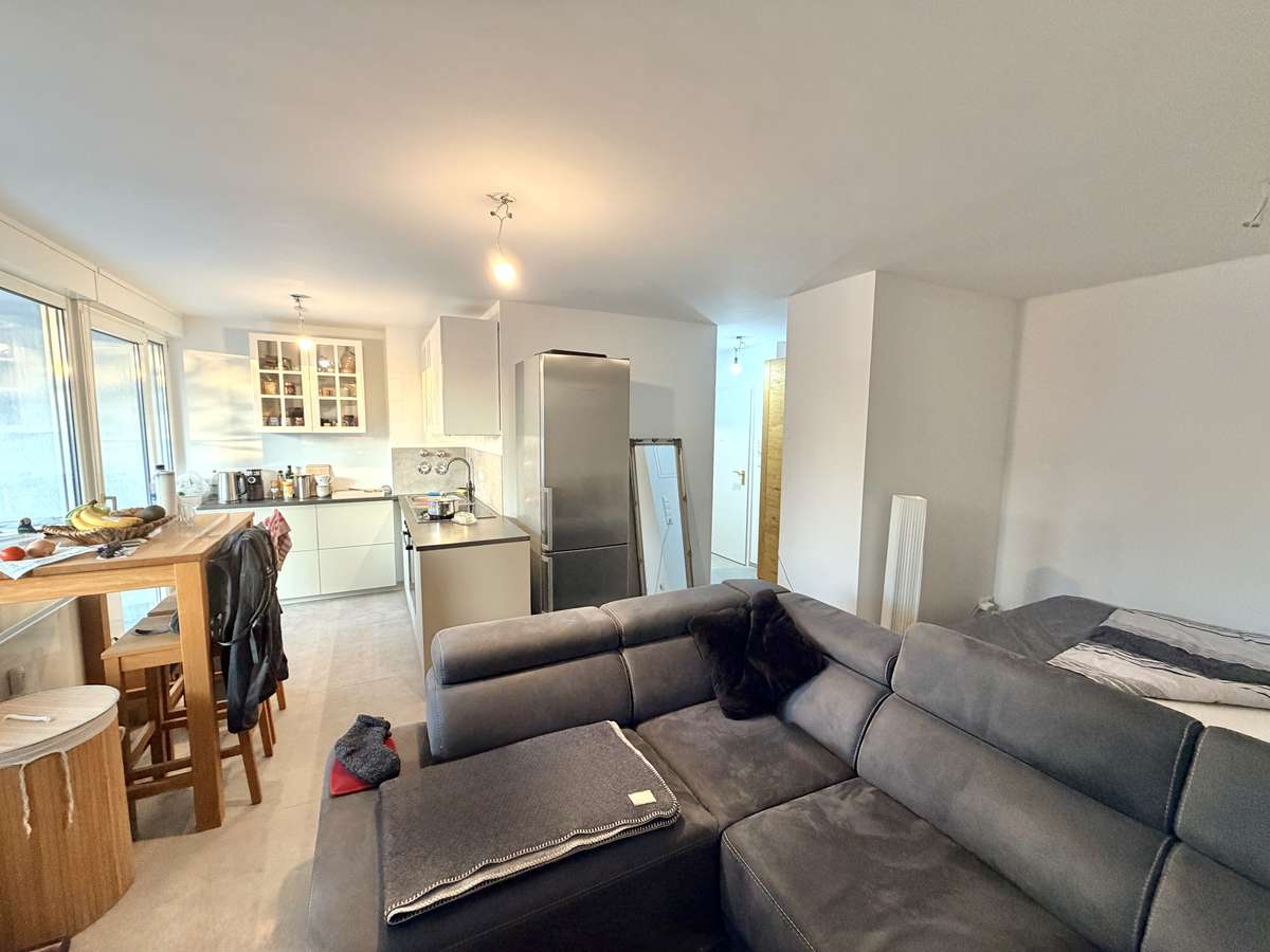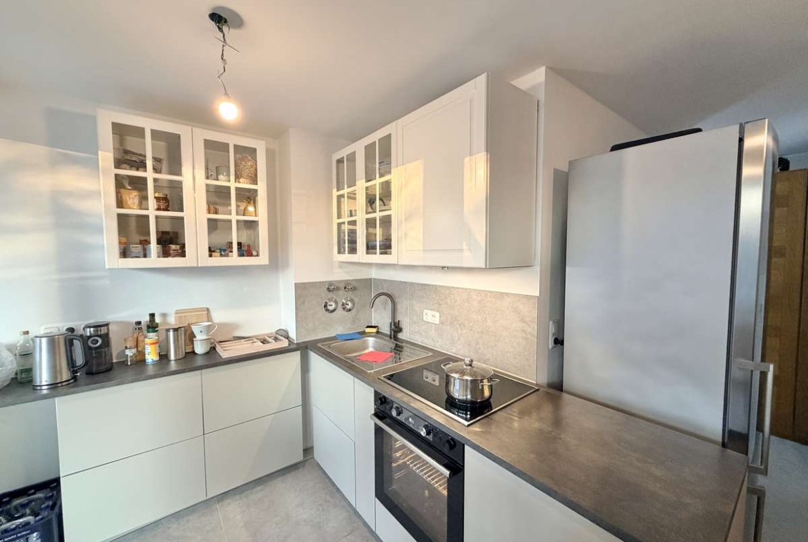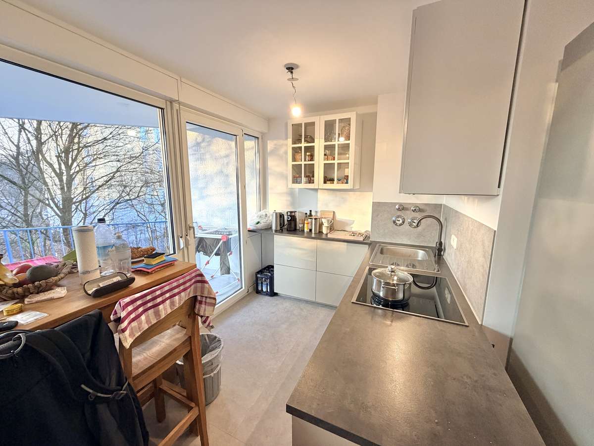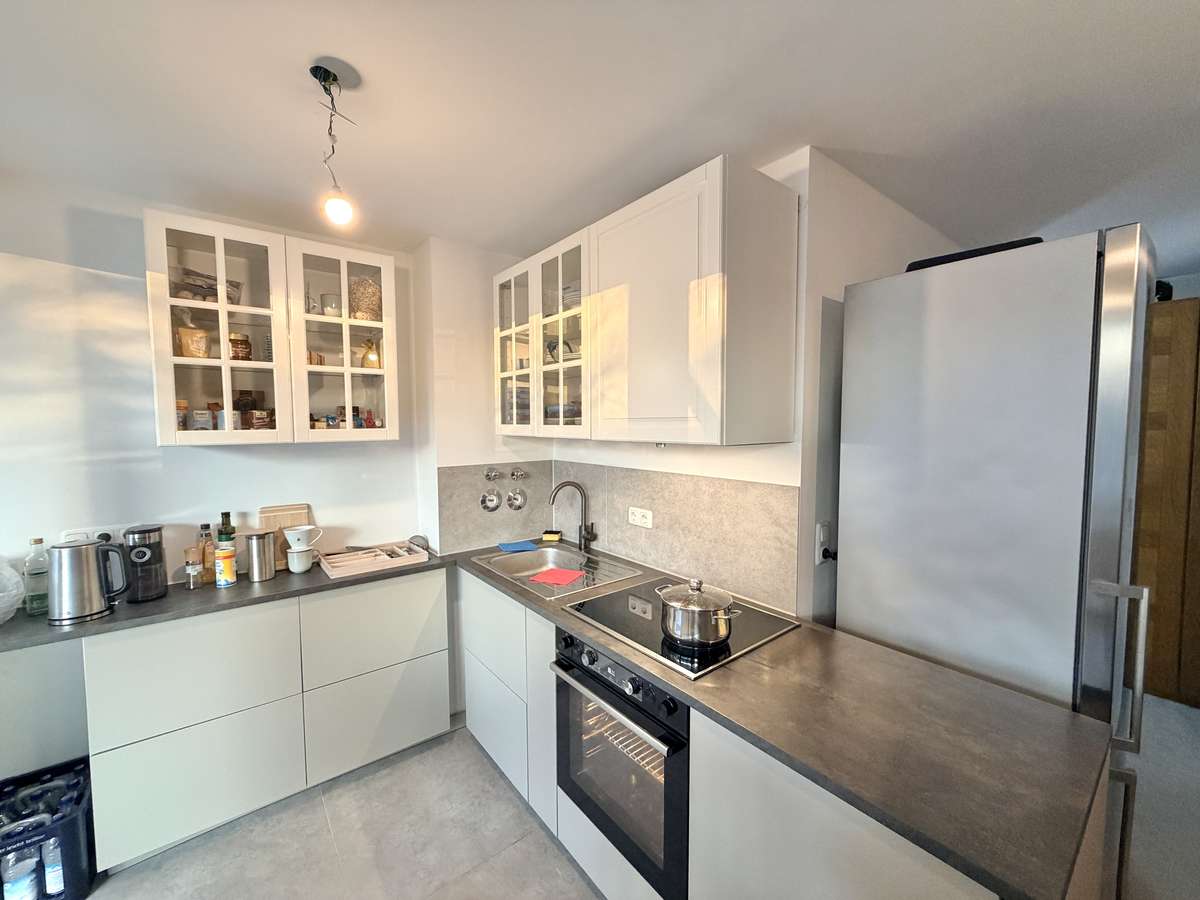 Die offene Küche überzeugt mit einer hochwertigen, erst etwa ein Jahr alten Einbauküche, die gegen eine Ablöse von 2.400 € (VB) vom Vormieter übernommen werden kann. Sie bietet modernen Komfort mit Induktionsherd, Dunstabzug, Spüle, Backofen und integrierter Waschmaschine.